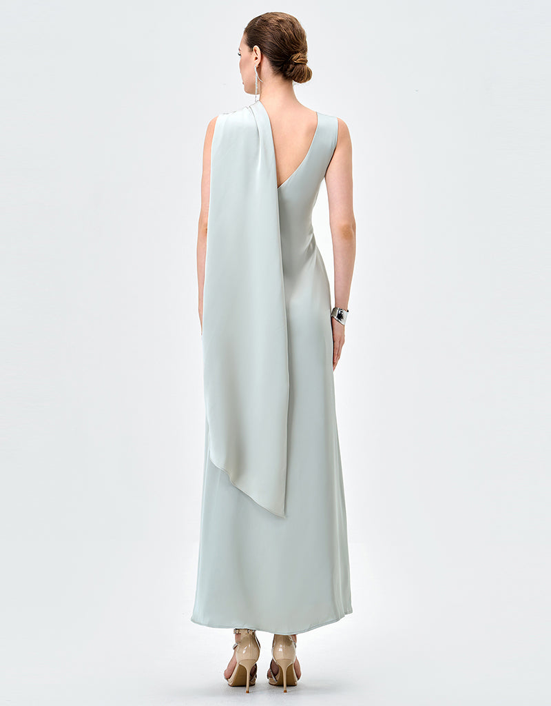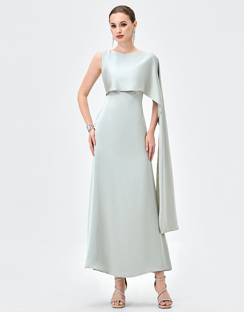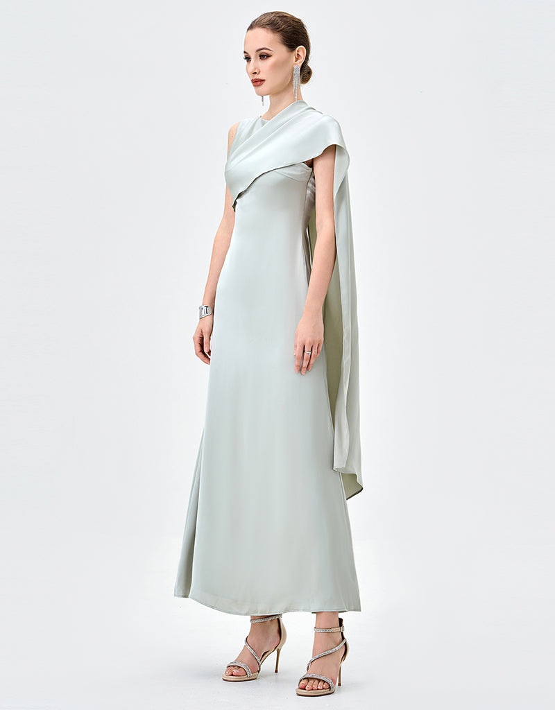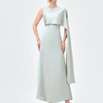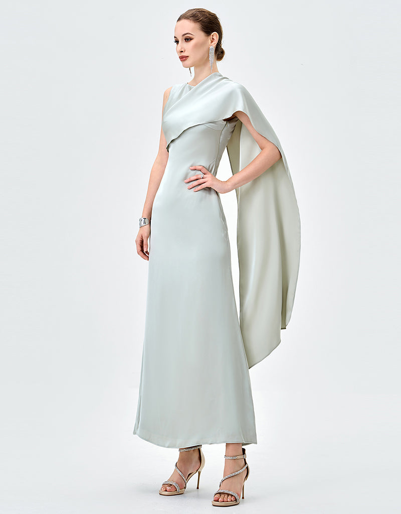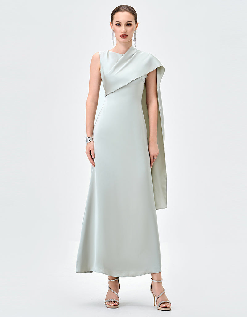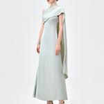 Elegant with a modern, couture-inspired edge, this draped satin gown is designed to make a quiet statement. Featuring an asymmetrical high neckline, it falls into a striking one-shoulder cape detail that moves beautifully with every step. A tapered waistline flatters the figure before flowing into a refined midaxi-length A-line skirt for effortless sophistication. Finished with full lining and an invisible zip closure at the back, it’s the perfect choice for formal events, weddings, and elevated evenings.