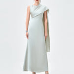 Draped asymmetrical high neckline with one shoulder flowing cape