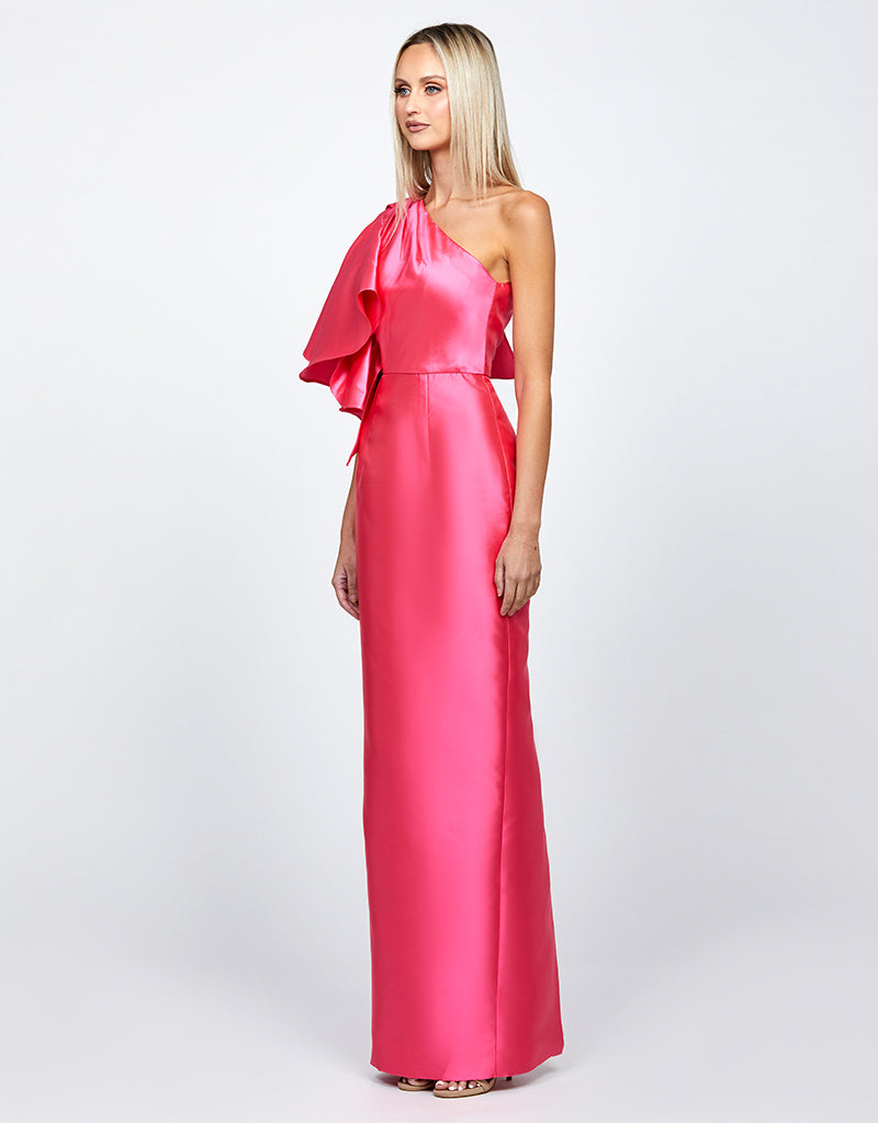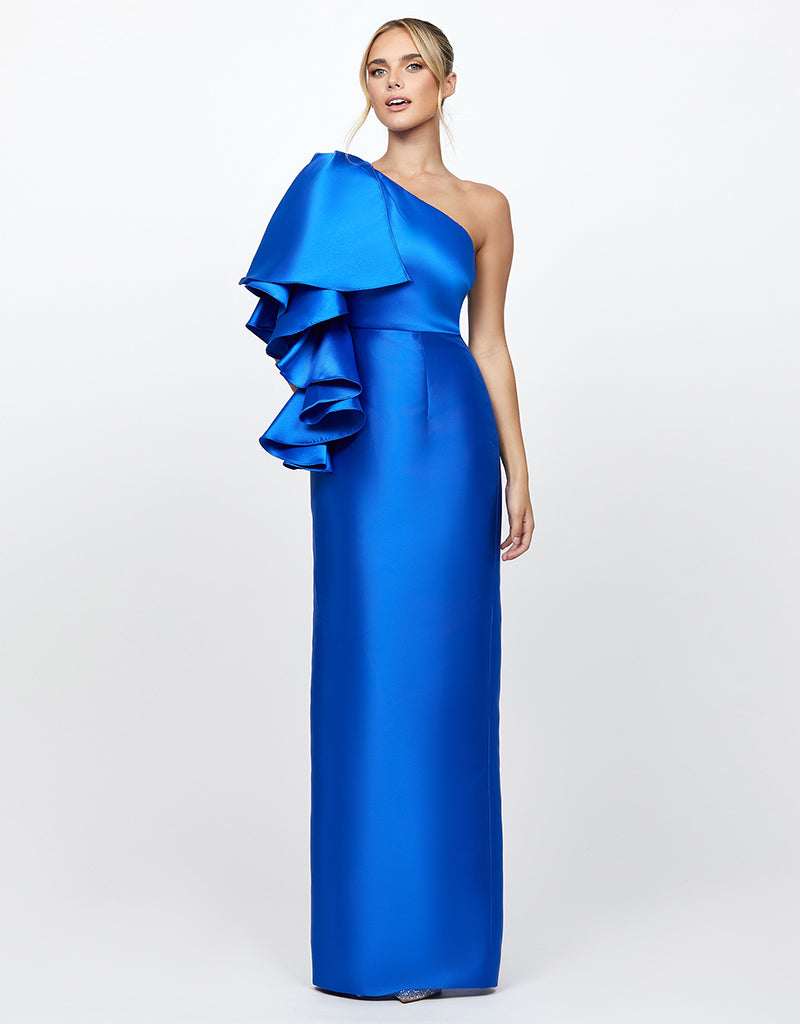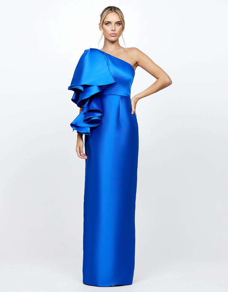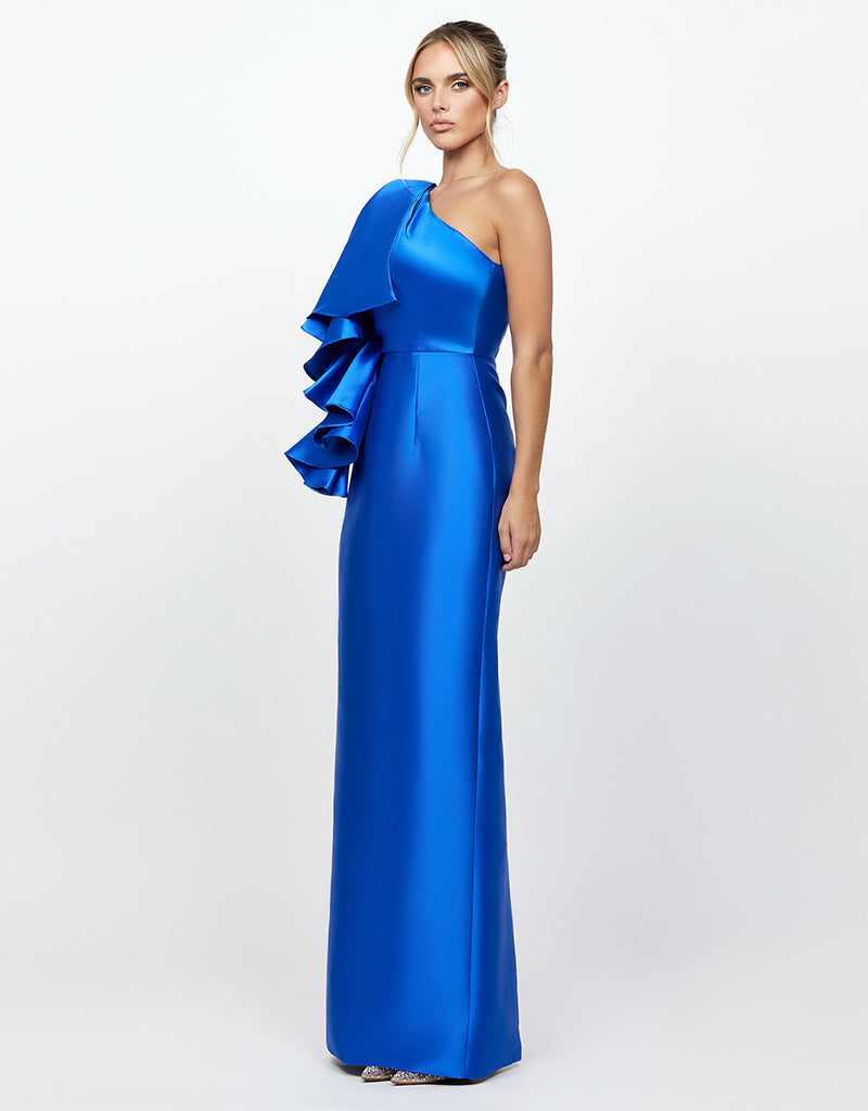 Make a statement in this bold and vibrant gown! The asymmetrical one-shoulder neckline with built-in cups provides a chic and supportive fit, while the shoulder pleat detail and cascading ruffle frill sleeve add a dramatic flair. The full-length column skirt hugs your figure and features a back split for ease of movement. Finished with an invisible back zip closure and full lining, this dress is designed for both comfort and style. Crafted from luxurious Duchess Satin, it offers a sleek, polished look that’s perfect for making an unforgettable entrance