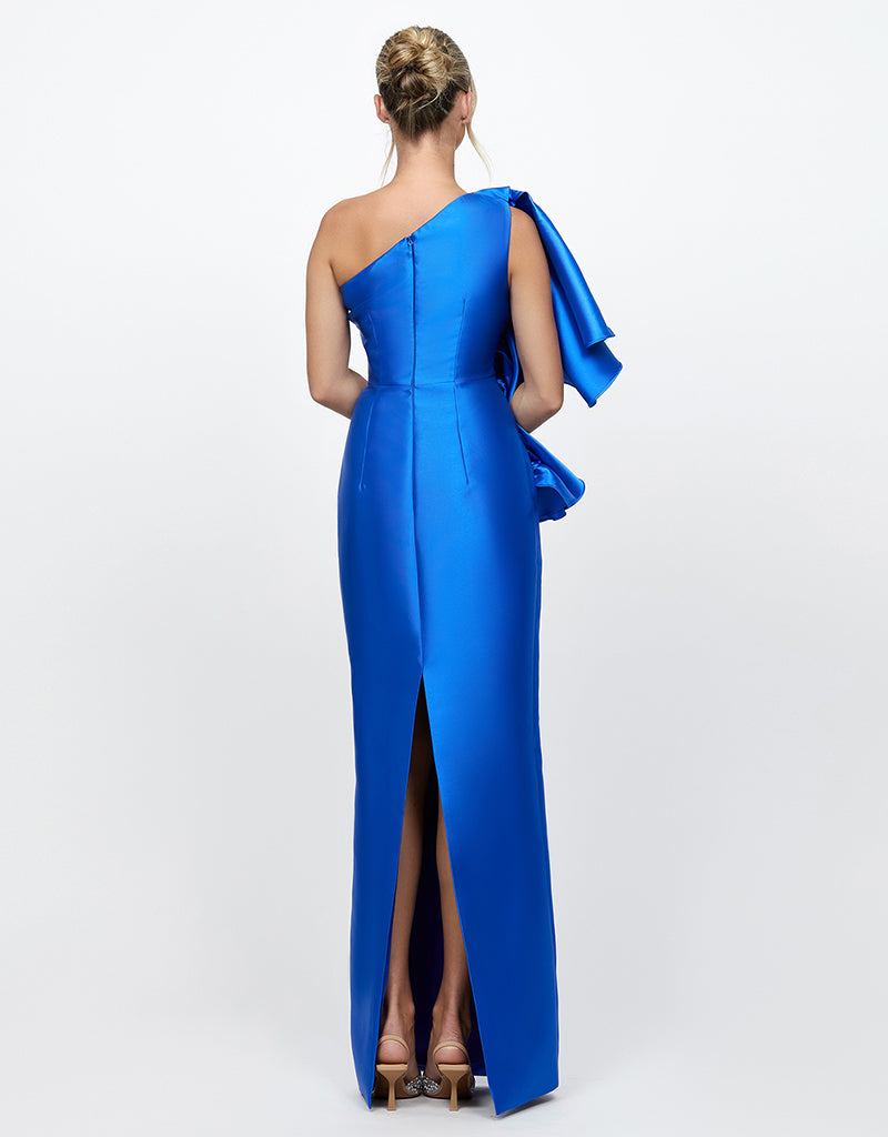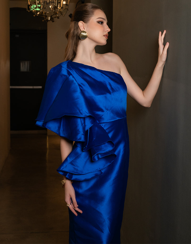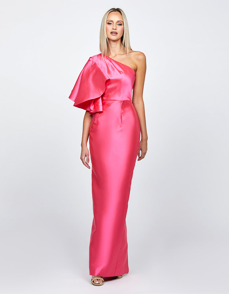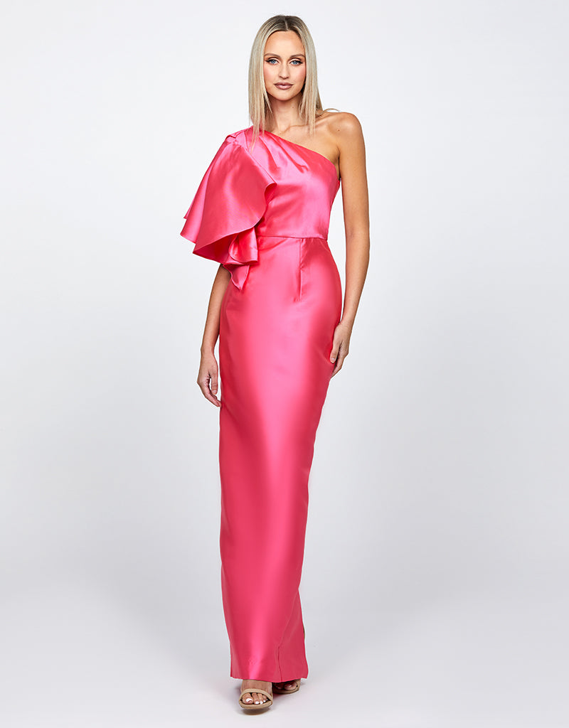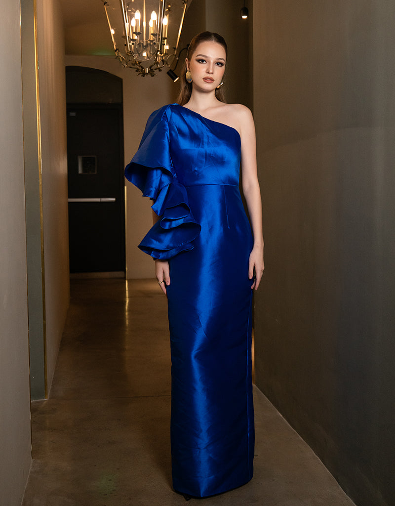Make a statement in this bold and vibrant gown! The asymmetrical one-shoulder neckline with built-in cups provides a chic and supportive fit, while the shoulder pleat detail and cascading ruffle frill sleeve add a dramatic flair. The full-length column skirt hugs your figure and features a back split for ease of movement. Finished with an invisible back zip closure and full lining, this dress is designed for both comfort and style. Crafted from luxurious Duchess Satin, it offers a sleek, polished look that’s perfect for making an unforgettable entrance