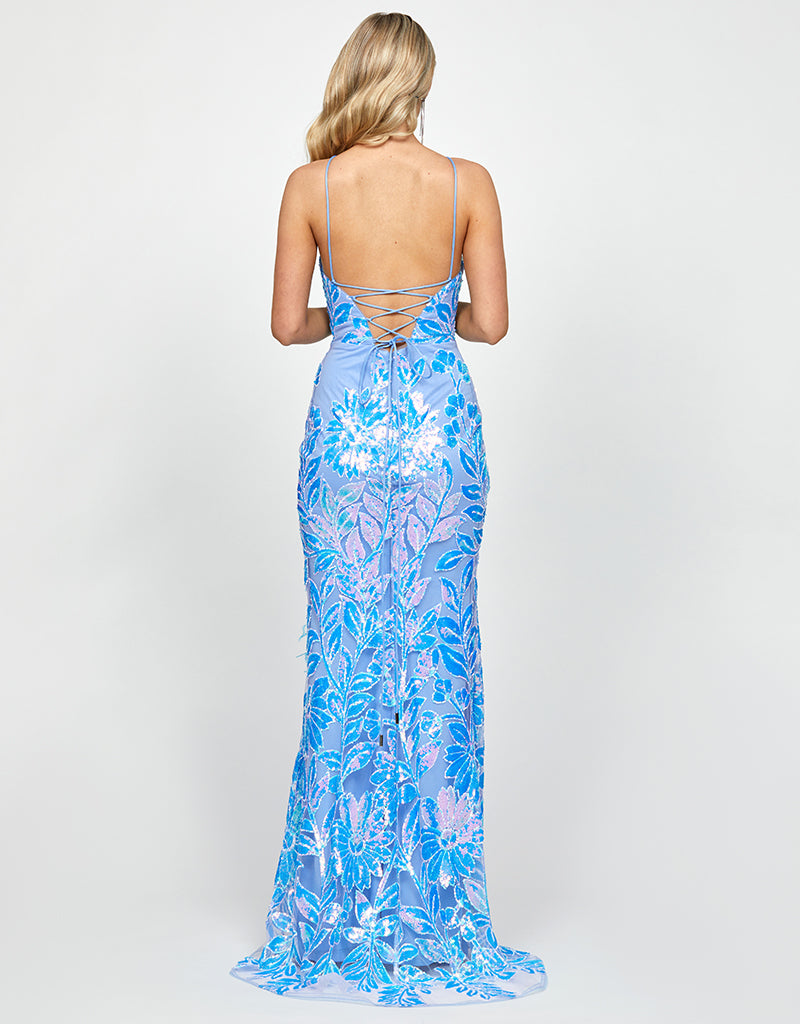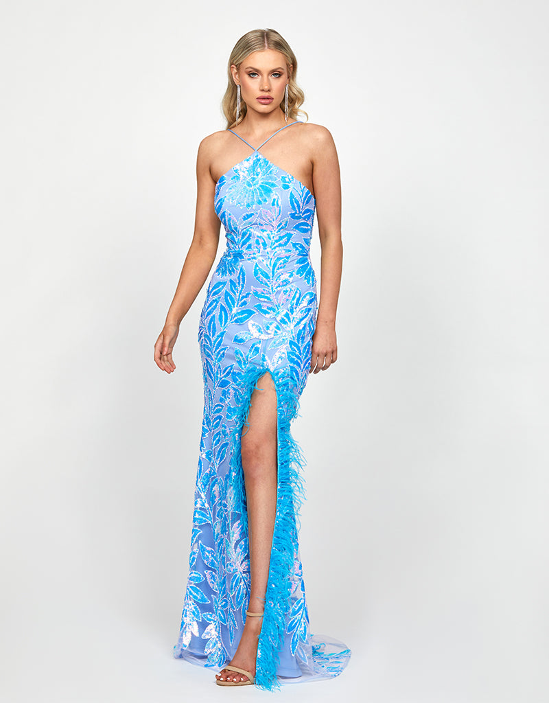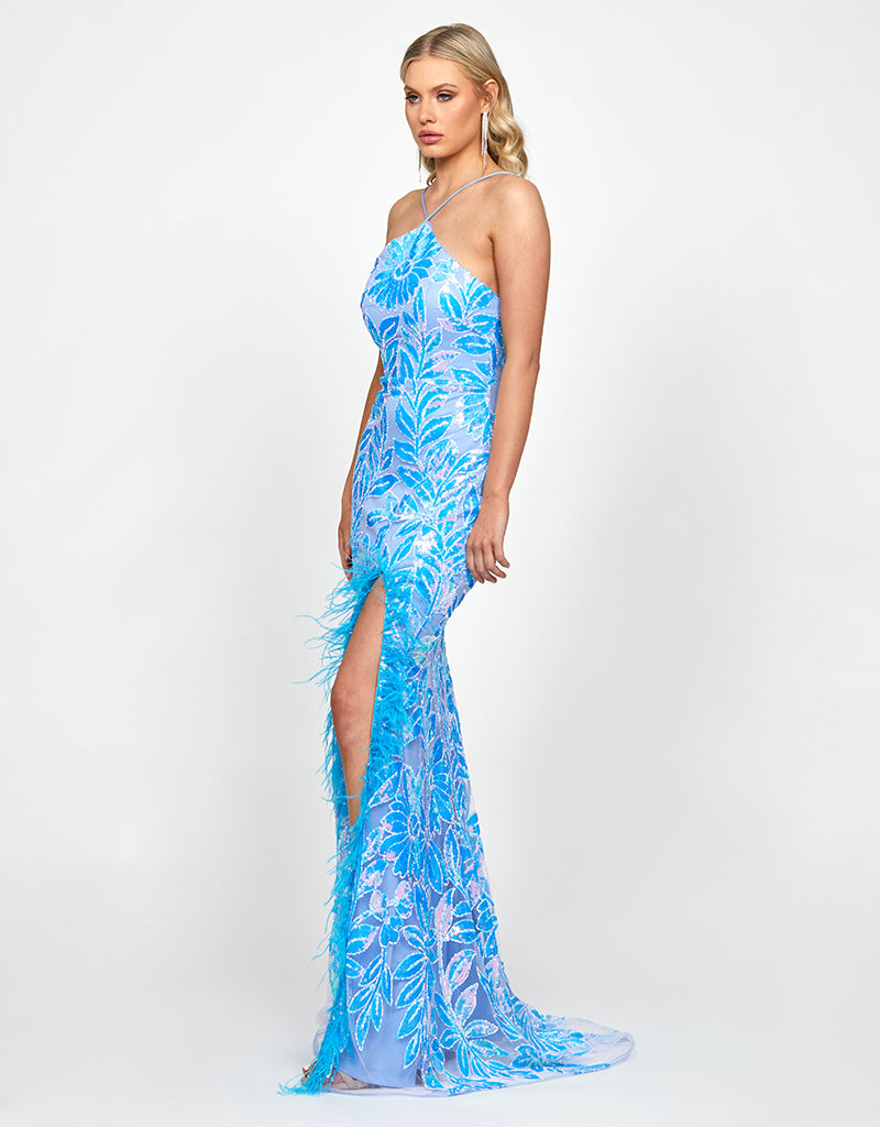 This stunning iridescent mermaid gown features an eye-catching arrow neckline and a structured bodice with built-in cups, the lace-up back adds a touch of elegance. The full-length fishtail skirt is elevated with a feather-trimmed front split, creating a dramatic silhouette. Crafted from shimmering pattern sequin fabric in iridescent hues, this gown is fully lined with an invisible back zip.