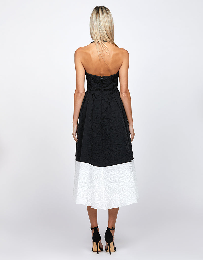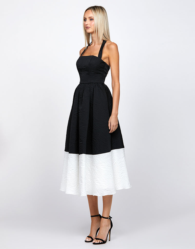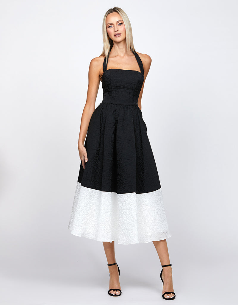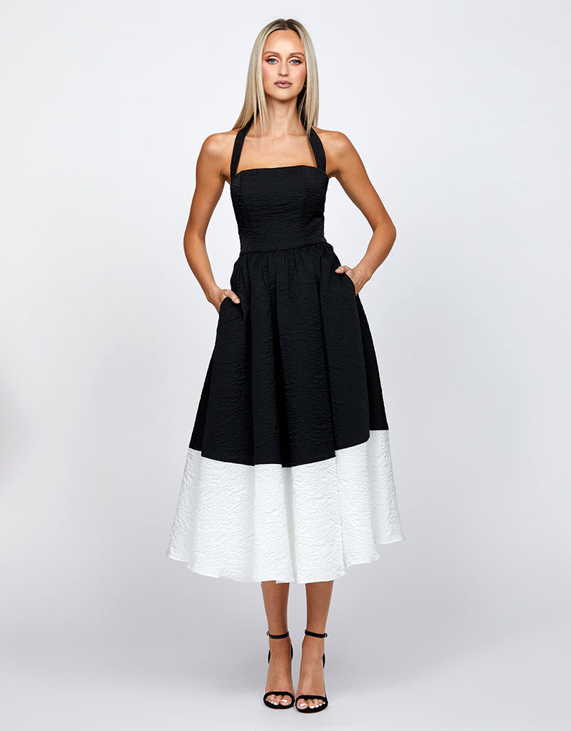 Elevate your style with this chic and modern dress, featuring a straight-across halter neckline with thick straps for a bold yet elegant look. The midi-length A-line skirt is designed with flattering waist gathers and convenient side pockets, adding both charm and practicality. A striking contrast hemline adds a unique touch, making this dress truly stand out.