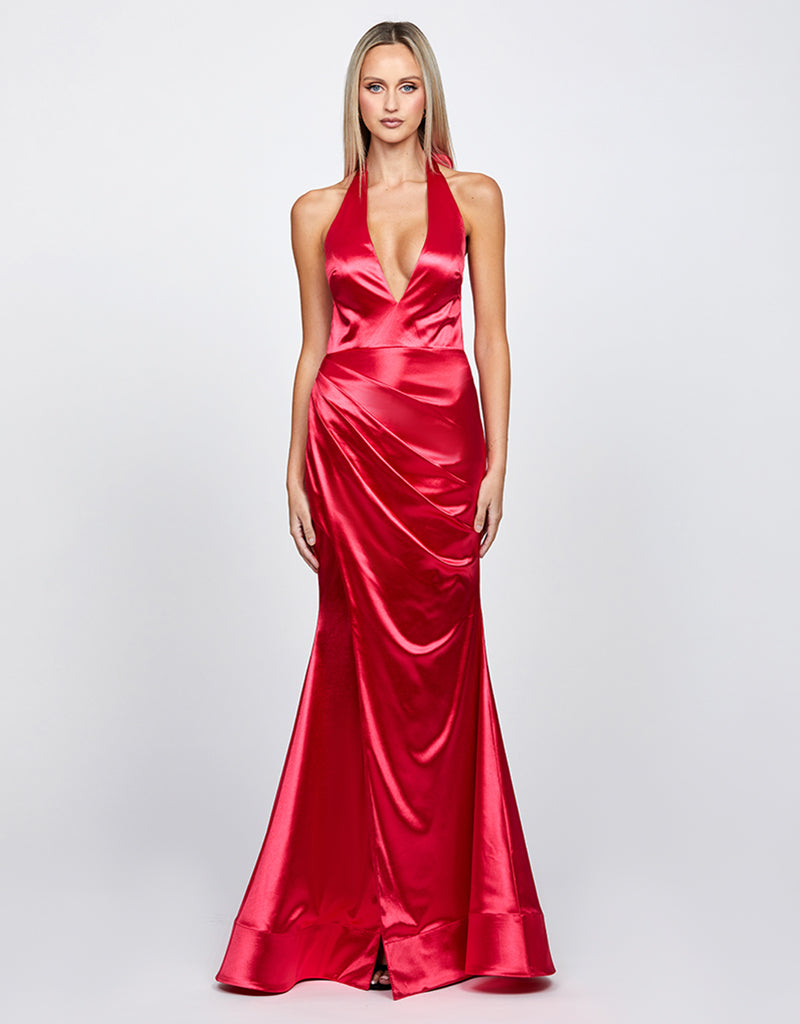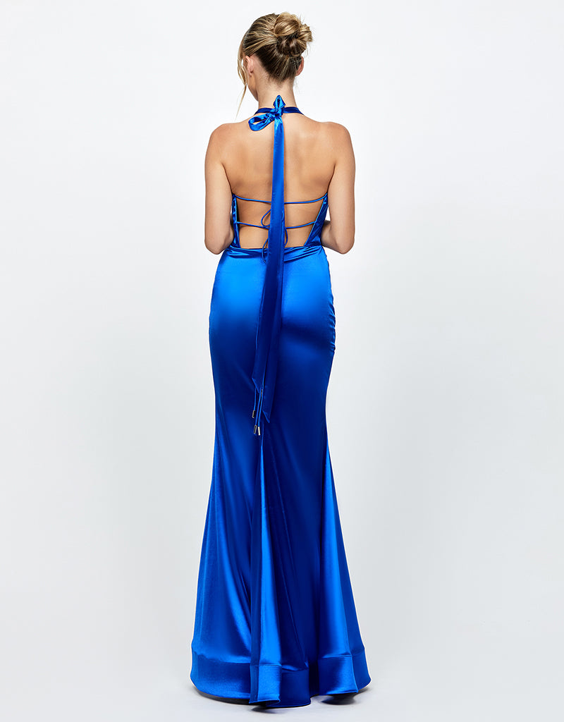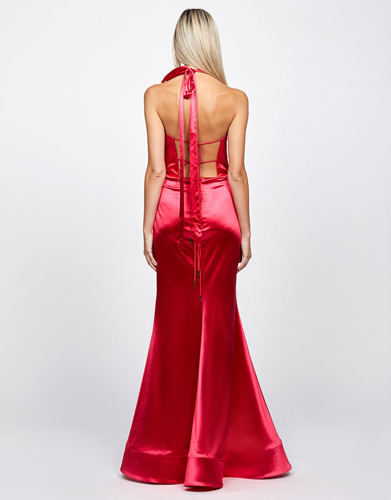 Darling Plunging Gown has been designed to make a striking statement. This gown features a daring plunging neckline with long, thick tie-back straps and built-in cups for a supportive fit. The boned bodice showcases an open lace-up back, adding a bold and modern twist to this sophisticated look.