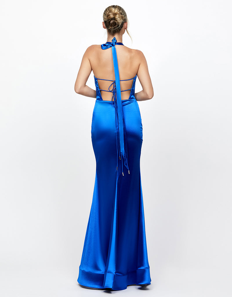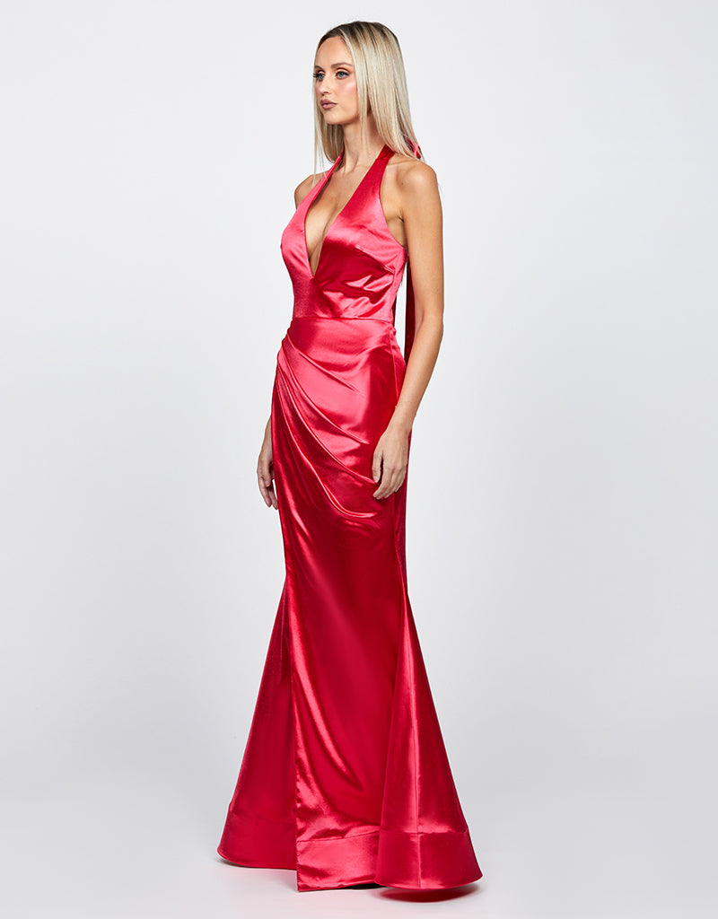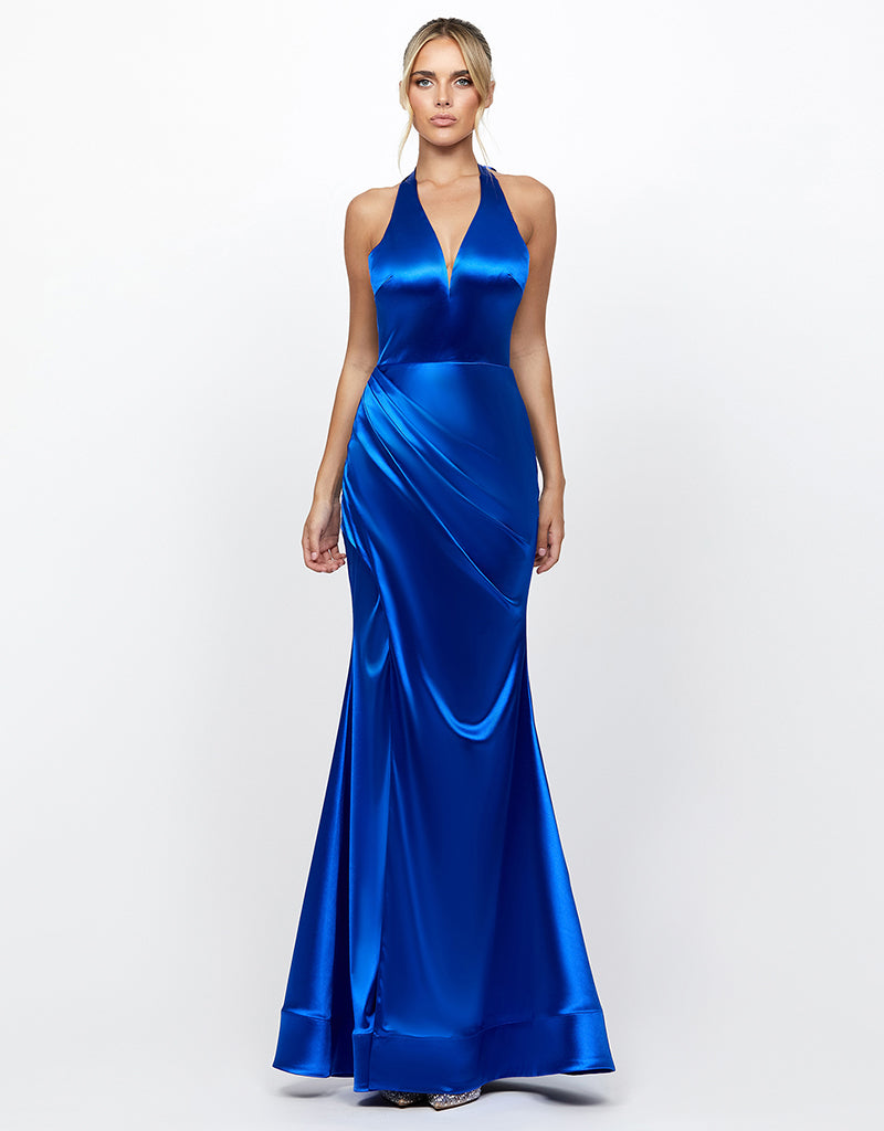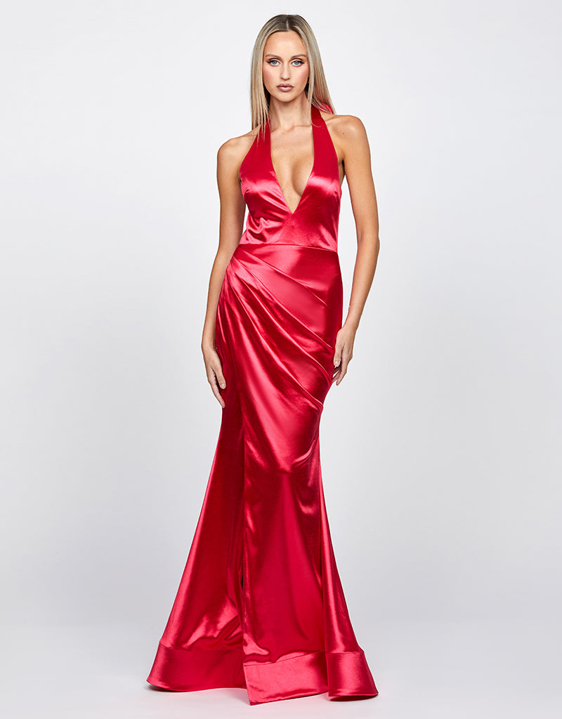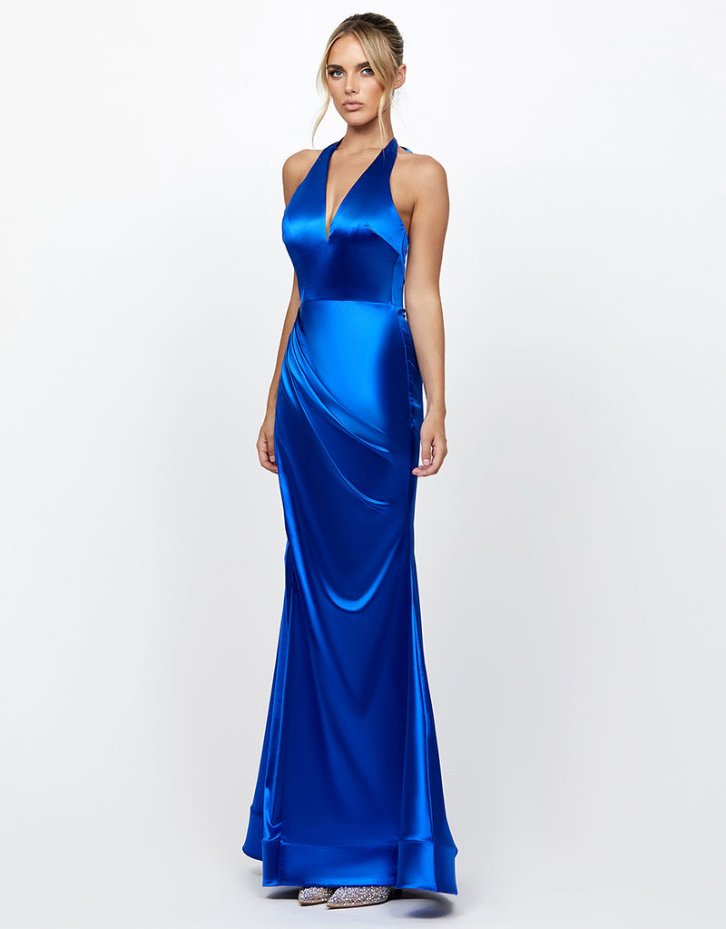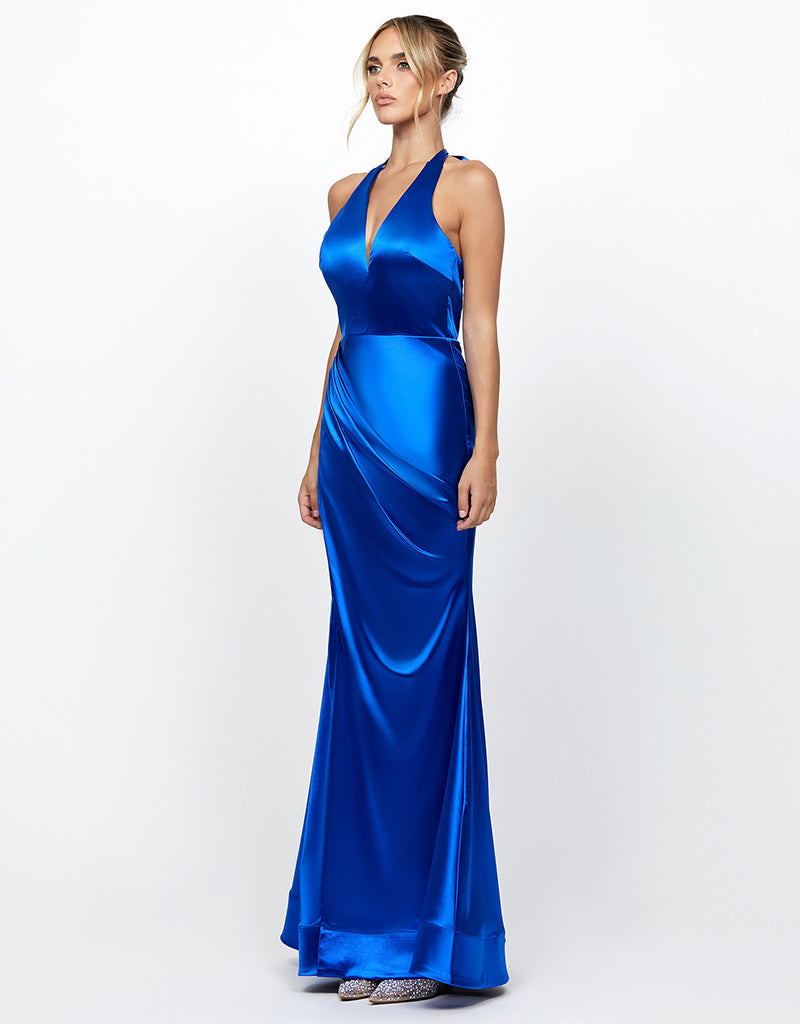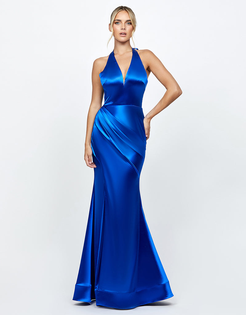 The full-length fishtail skirt is beautifully crafted with asymmetric side pleats and a sultry side split, creating movement and allure. Finished with an invisible back zip closure, full lining, and a structured hemline for that perfect fit, this gown is made from luxurious slinky jersey fabric that drapes elegantly over the body.