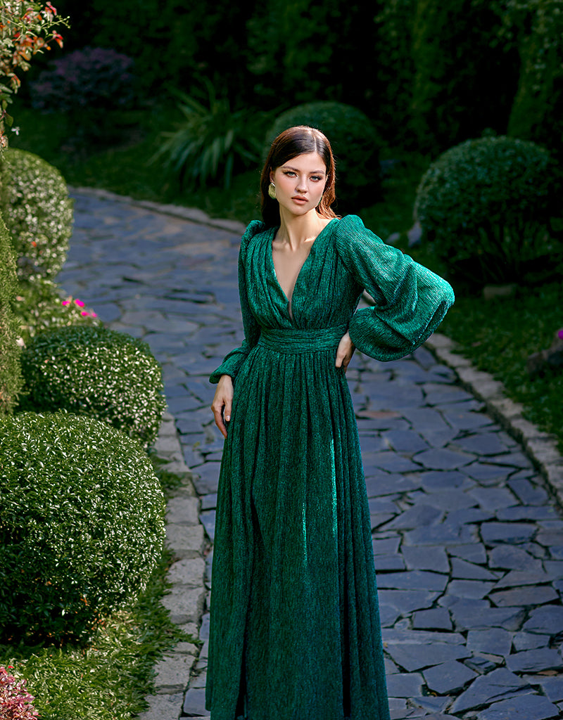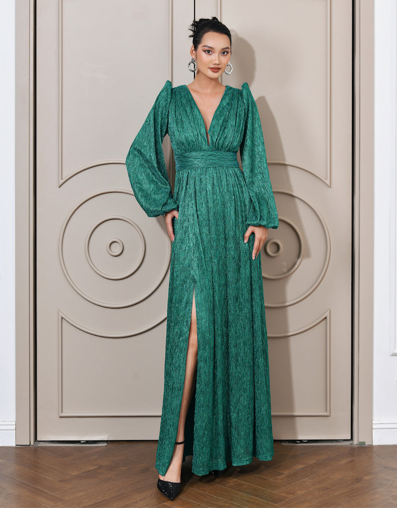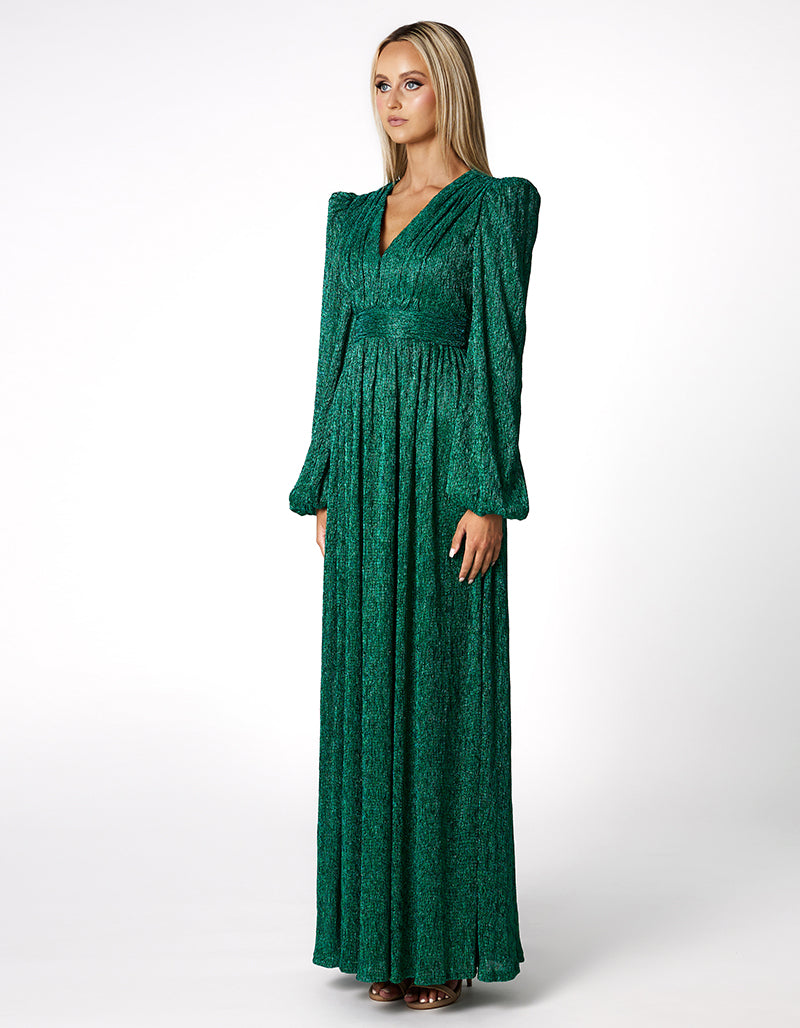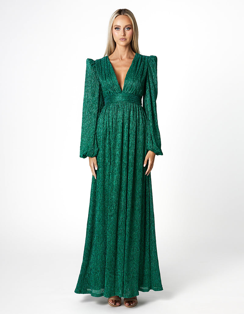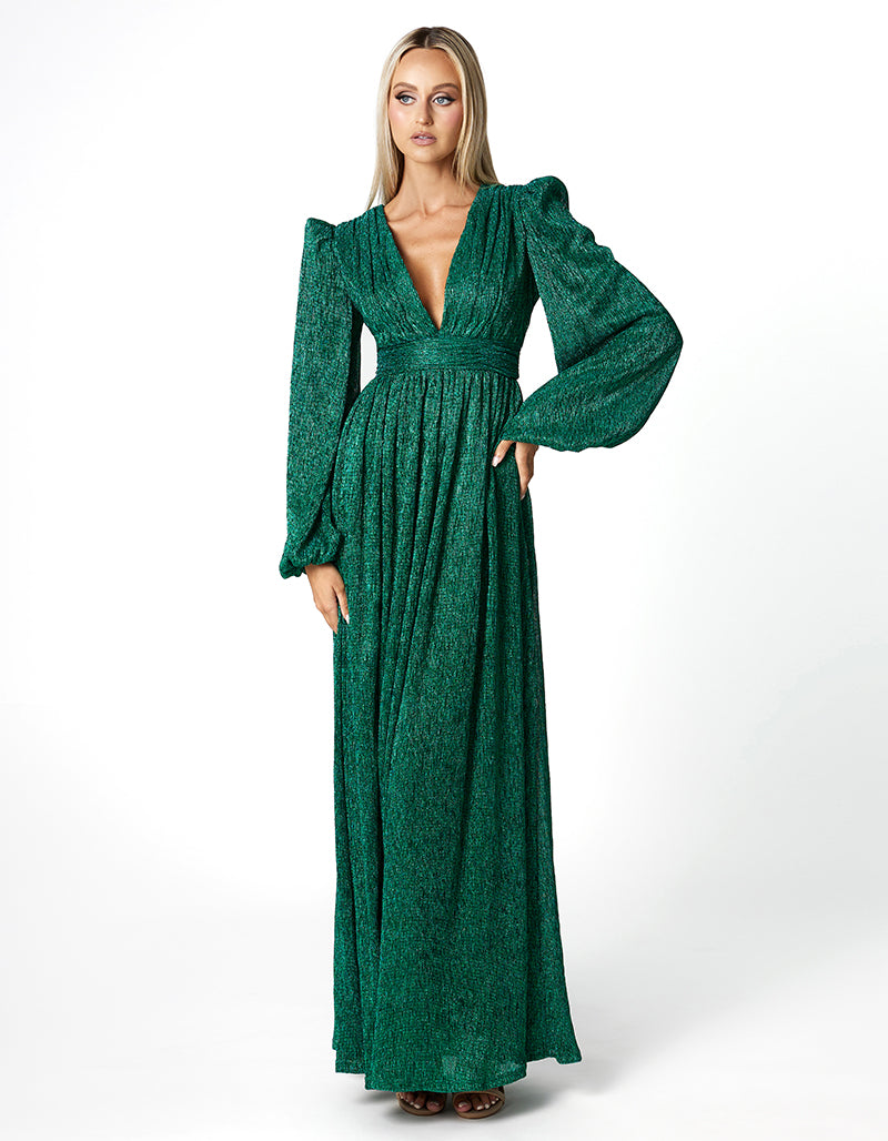 The exquisite DOMINIQUE V NECK LONG SLEEVE MAXI dress features a plunging V-neckline that exudes elegance and allure. The gather detail at the bust and top of the sleeves adds texture and sophistication to the design. With full-length blouson sleeves, this dress offers a timeless and graceful aesthetic. A thick waistband feature ensures a flattering fit, while the maxi-length skirt with ruched detail and slight flare offers a modest style suitable for formal events. Elevate your wardrobe with this stunning ensemble, perfect for making a statement at any occasion.