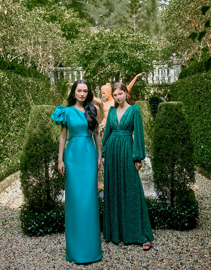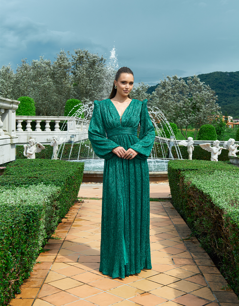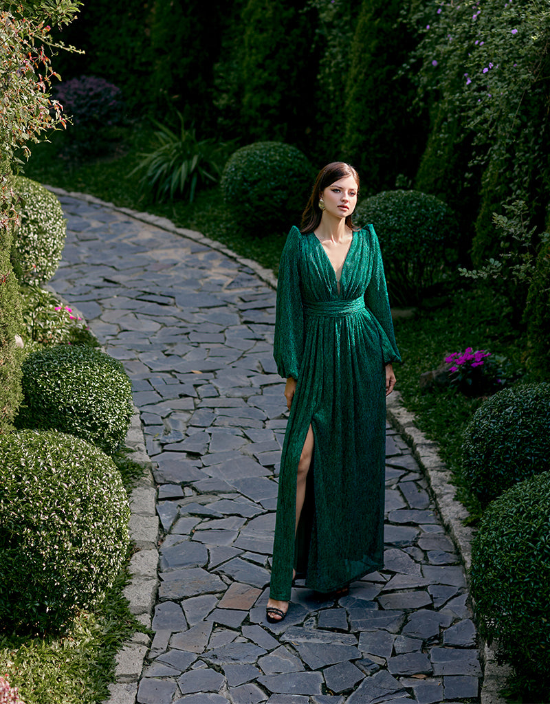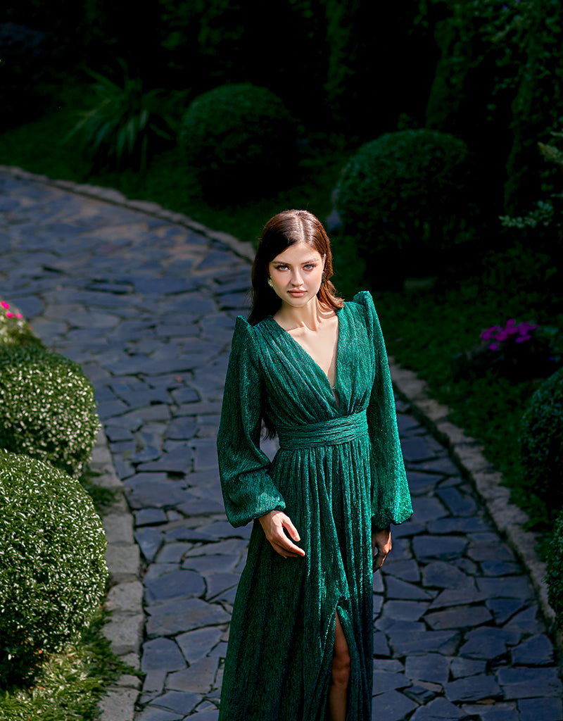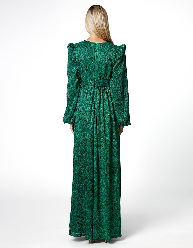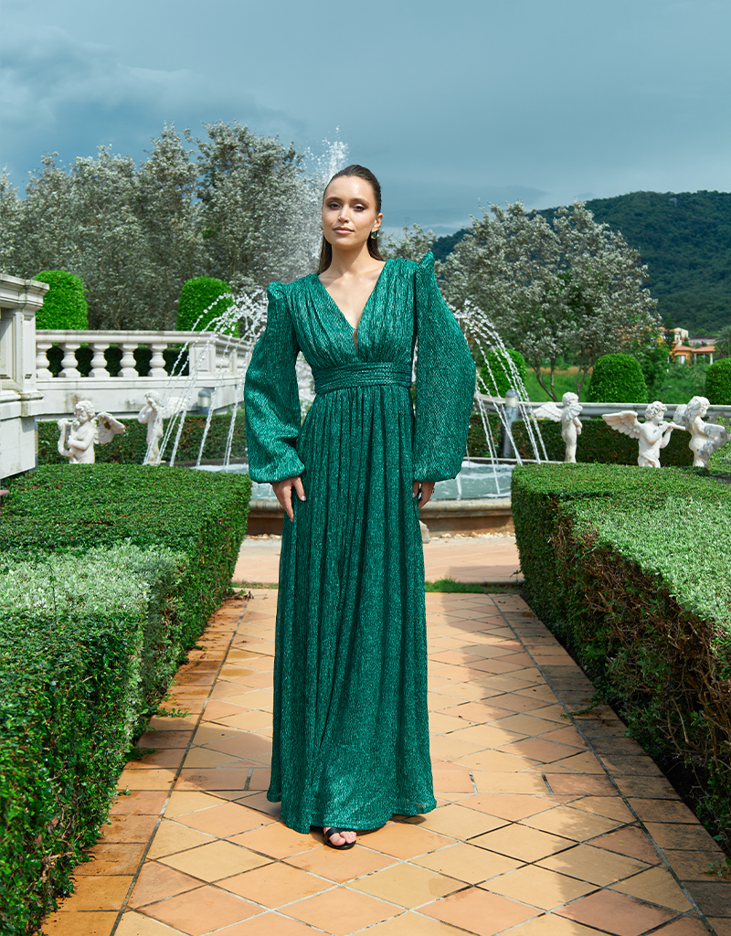 The exquisite DOMINIQUE V NECK LONG SLEEVE MAXI dress features a plunging V-neckline that exudes elegance and allure. The gather detail at the bust and top of the sleeves adds texture and sophistication to the design. With full-length blouson sleeves, this dress offers a timeless and graceful aesthetic. A thick waistband feature ensures a flattering fit, while the maxi-length skirt with ruched detail and slight flare offers a modest style suitable for formal events. Elevate your wardrobe with this stunning ensemble, perfect for making a statement at any occasion.