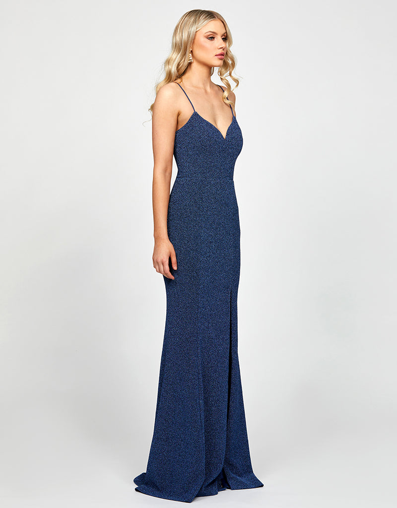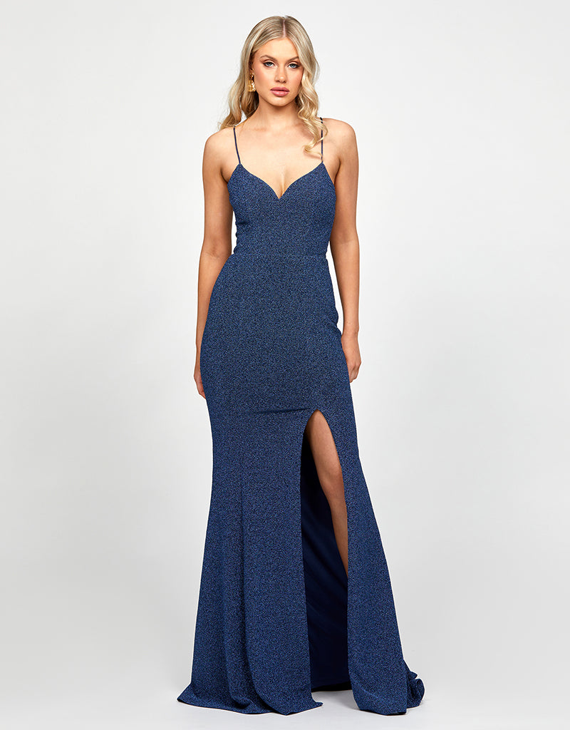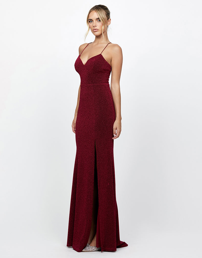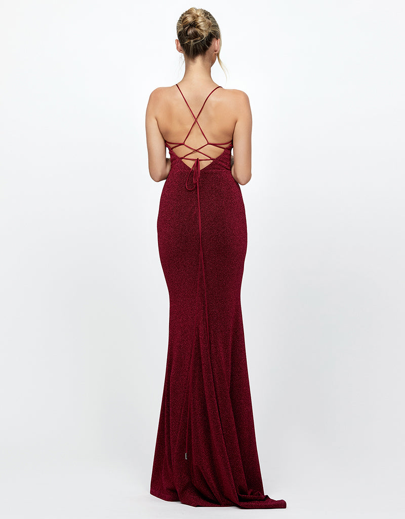 Turn heads in the Ellen strappy back maxi, with a striking design that blends bold sophistication with timeless glamour. The plunging V-neckline, paired with delicate thin spaghetti straps, creates a flattering, feminine shape, while the open back with an adjustable lace-up feature adds a touch of sensuality and ensures a customized fit.