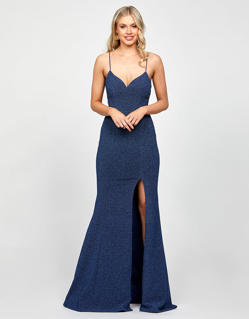 The full-length fishtail skirt hugs your curves through the hips before flaring out dramatically at the bottom, creating a show-stopping silhouette. A high side split adds an element of allure, allowing for ease of movement and a confident stride. The gown is fully lined for comfort and structure, with an invisible back zip closure that ensures a sleek, seamless finish.