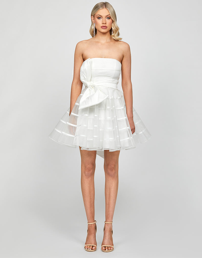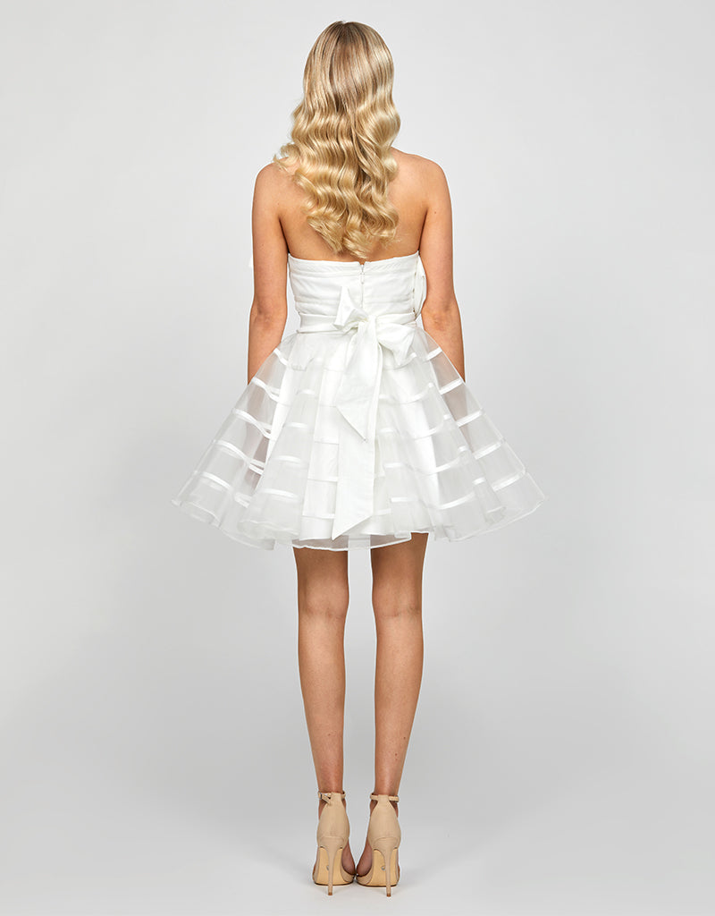 This chic mini dress combines timeless sophistication with modern flair, perfect for any formal or semi-formal occasion. Featuring a straight-across strapless neckline with built-in cups for a flattering, supportive fit, the structured waist is enhanced with a detachable bow and sash feature that adds a touch of playful elegance. The mini-length circle skirt provides a full, voluminous silhouette, creating a fun and feminine look that moves effortlessly with every step. An invisible back zip closure ensures a smooth, seamless fit, while the full lining ensures comfort and durability.