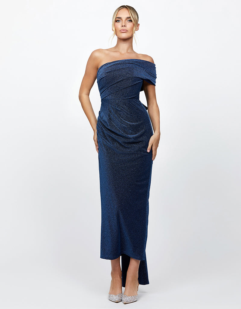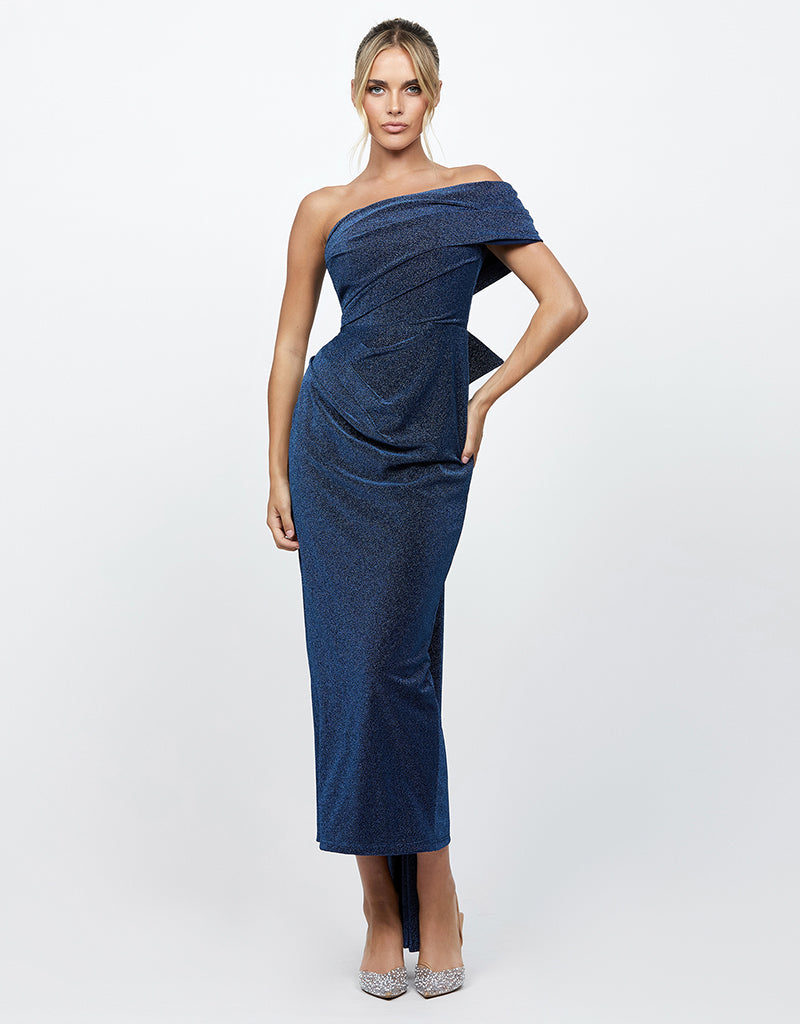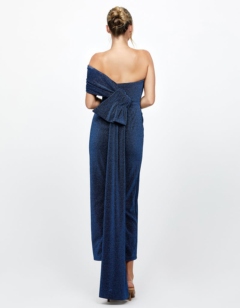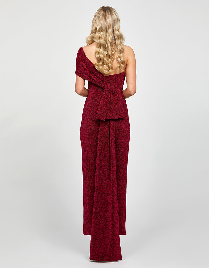The Isa Off-Shoulder Metallic Jersey Midi Gown is a modern take on classic elegance, designed to make you the center of attention at any formal event. The unique off-shoulder single sleeve neckline with front tuck detailing adds a sophisticated touch to the design, while the dramatic bow and full-length sash at the back bring a touch of whimsy and romance. The gathered side waistline and draping across the front skirt create a flattering silhouette, enhancing the natural curves of the body.