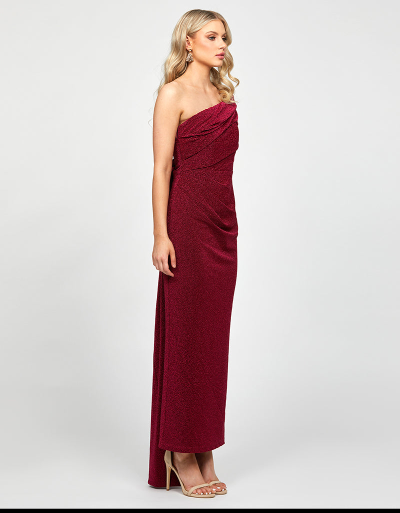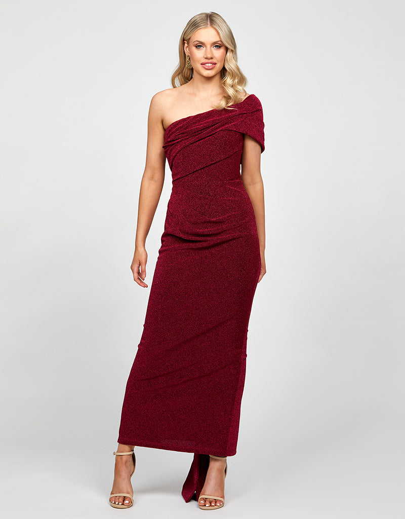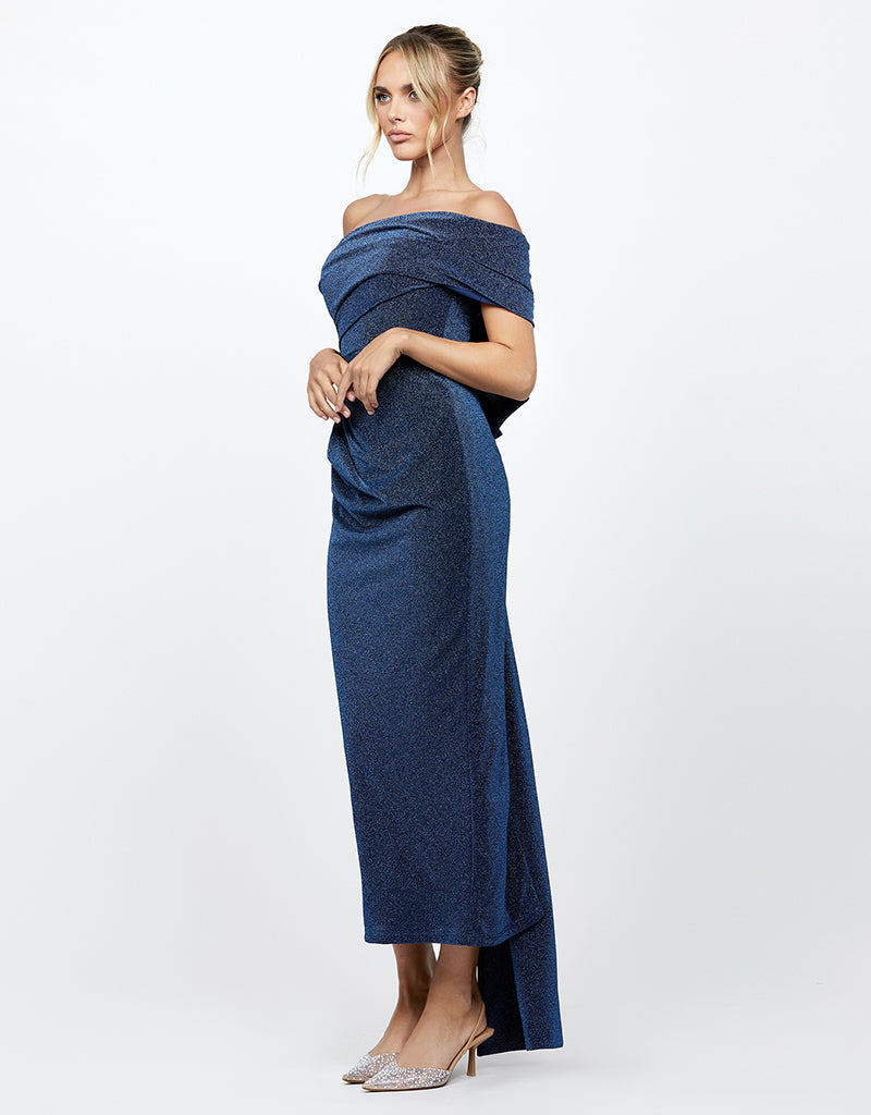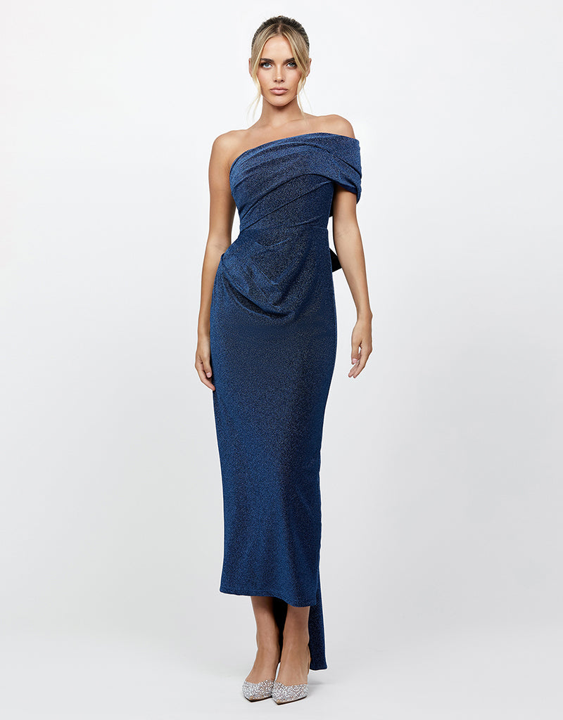 The Isa Off-Shoulder Metallic Jersey Midi Gown is a modern take on classic elegance, designed to make you the center of attention at any formal event. The unique off-shoulder single sleeve neckline with front tuck detailing adds a sophisticated touch to the design, while the dramatic bow and full-length sash at the back bring a touch of whimsy and romance. The gathered side waistline and draping across the front skirt create a flattering silhouette, enhancing the natural curves of the body.
