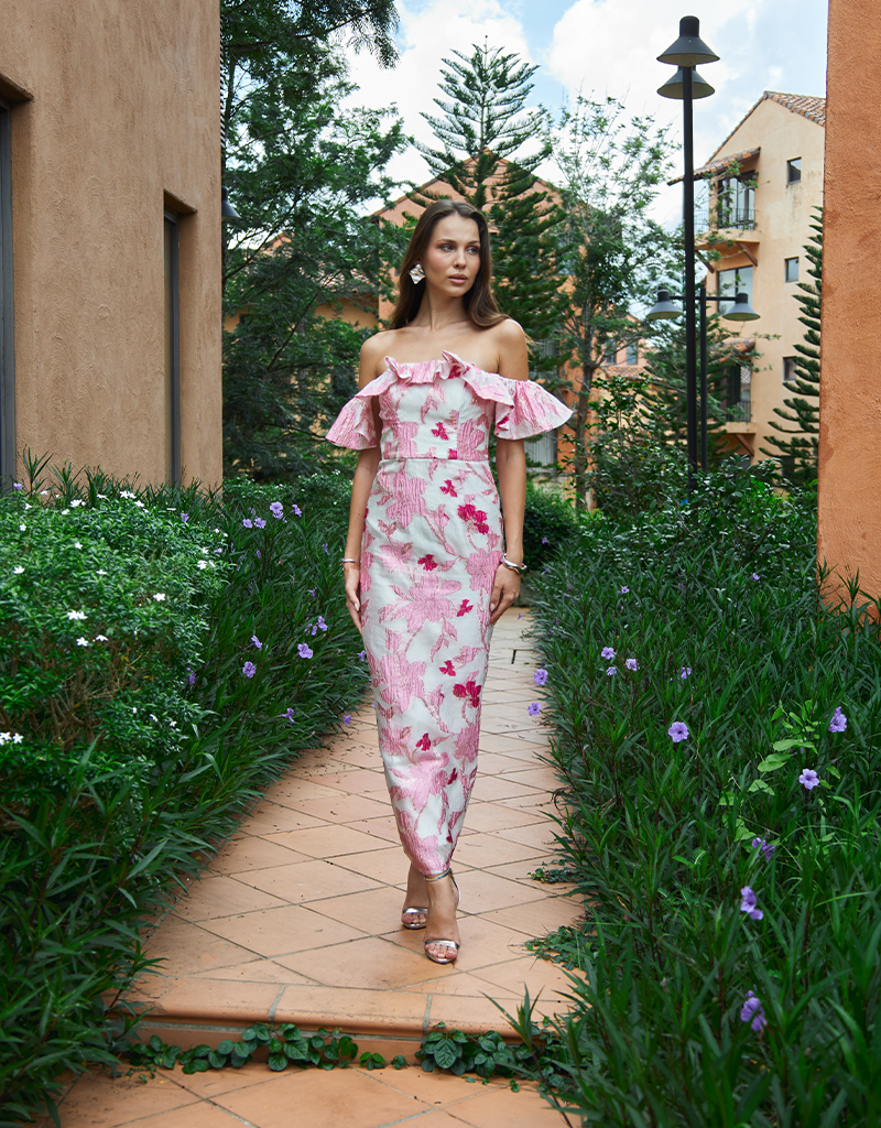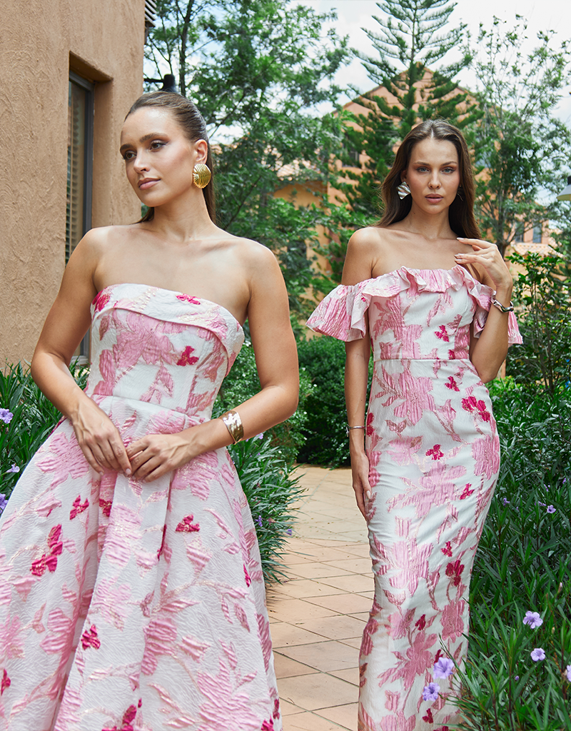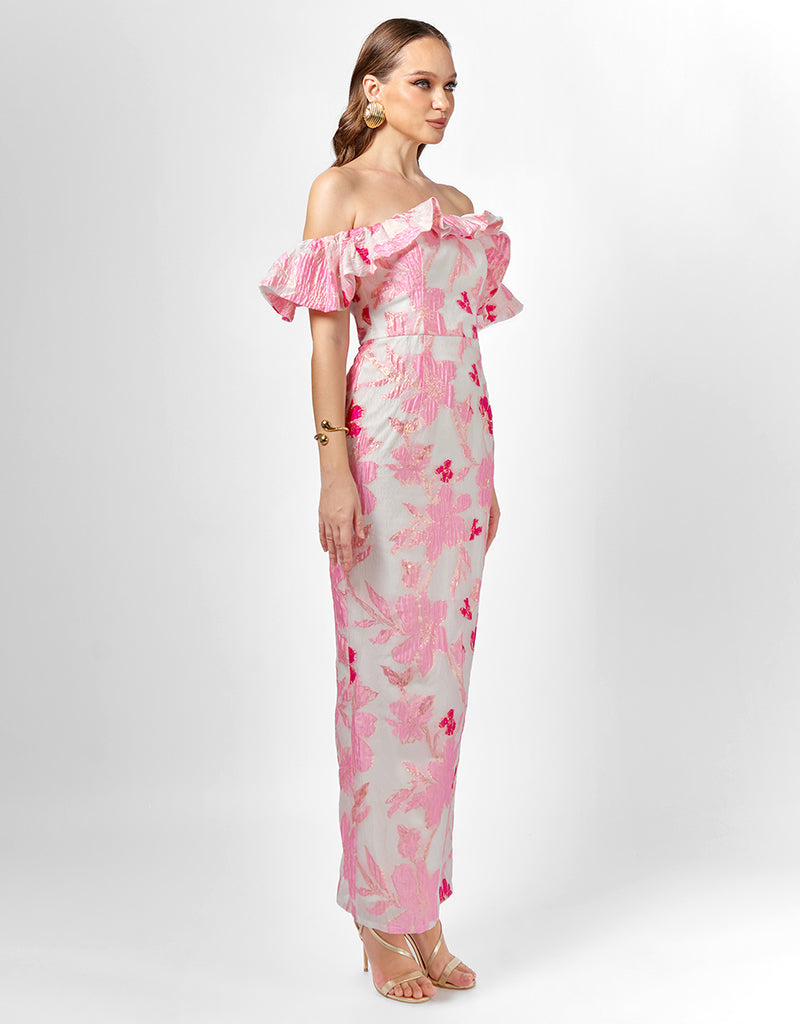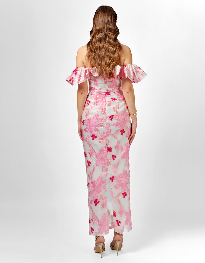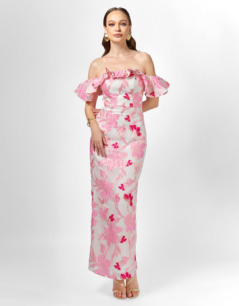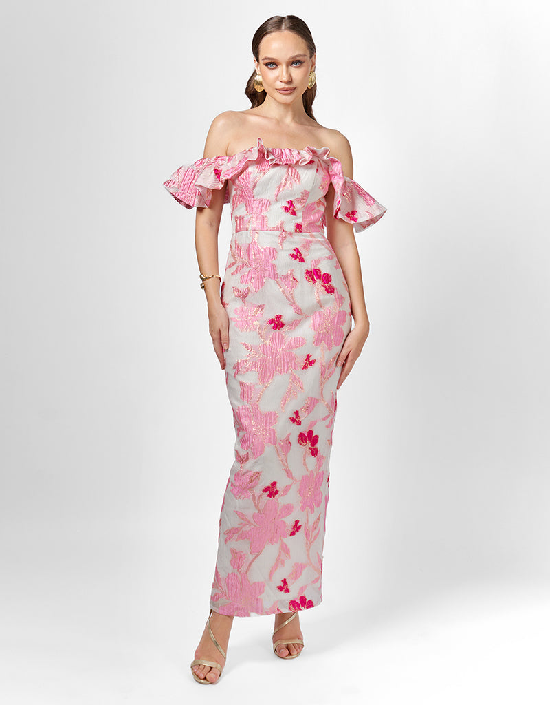 Make an unforgettable entrance in the Jacquie Off Shoulder Midaxi. This stunning gown features a romantic frill off-shoulder neckline and a structured boned bodice with built-in bust cups for a secure and flattering fit. The fitted column silhouette hugs your curves and falls to a chic midaxi length, complete with a back split for ease of movement. Fully lined and finished with an invisible back zip, this elegant style is perfect for weddings, formal events, or any occasion where you want to feel your most confident.