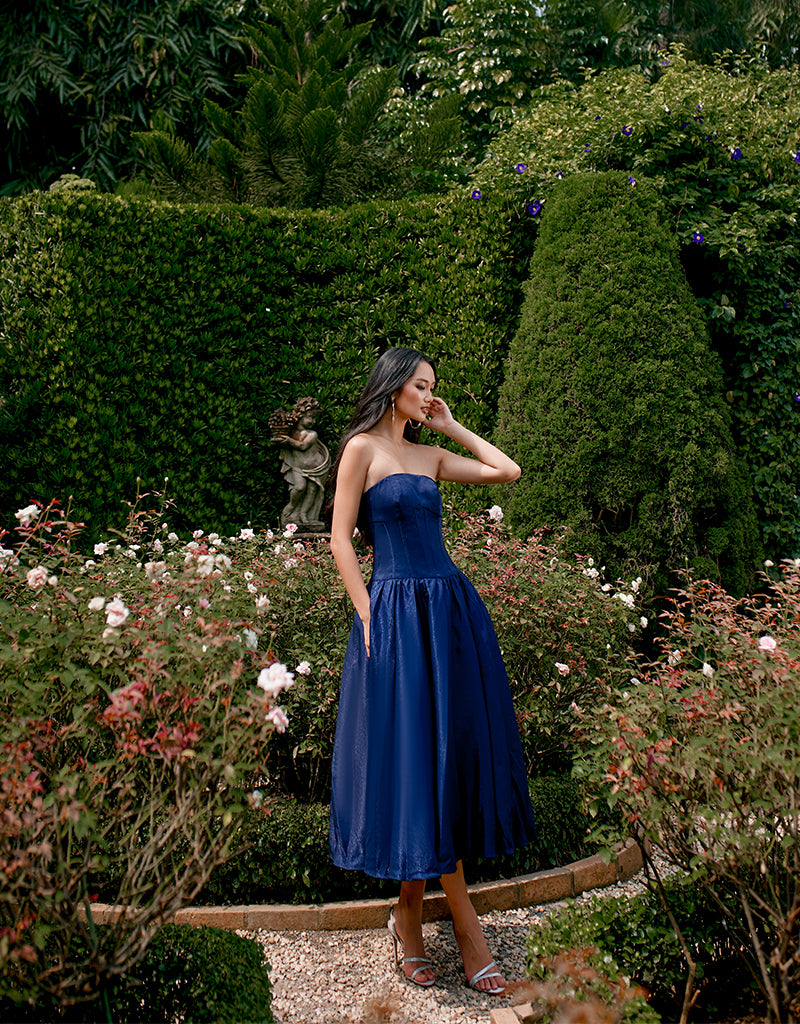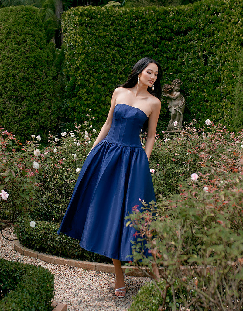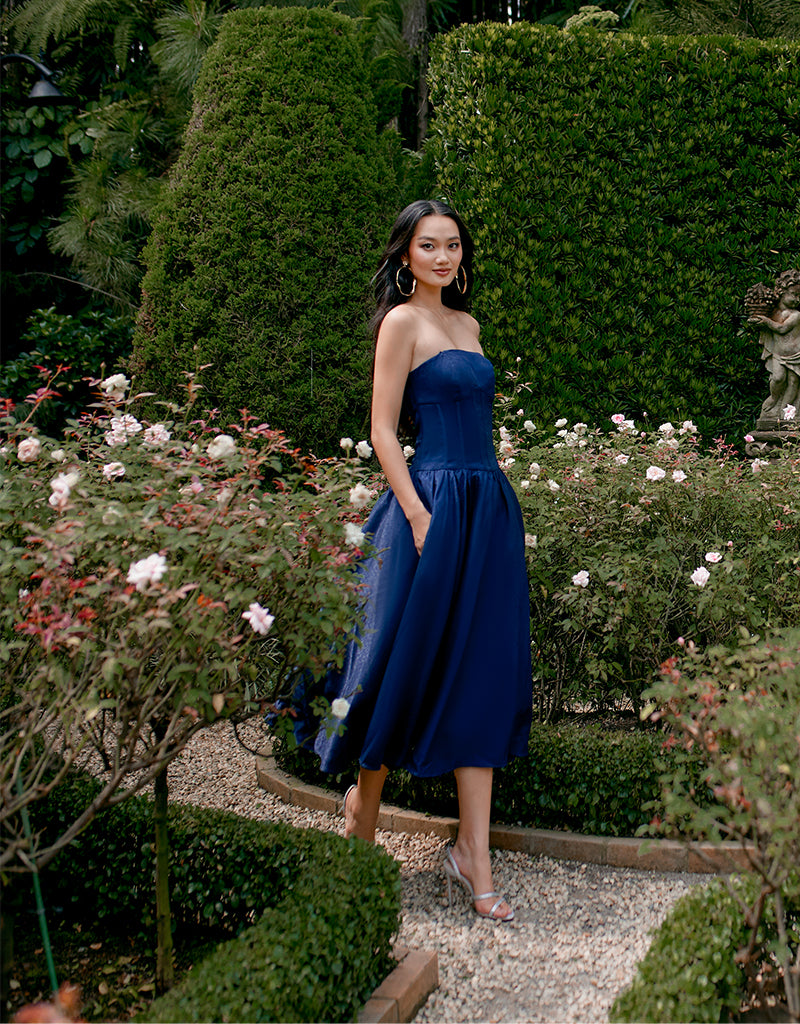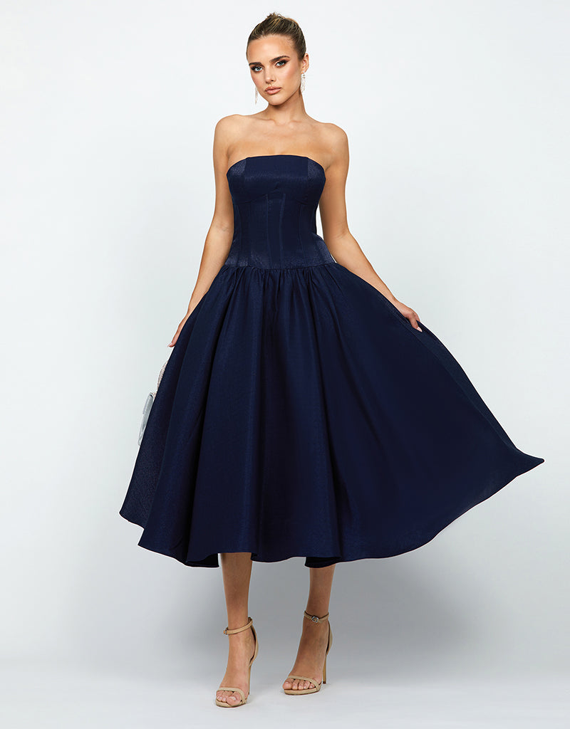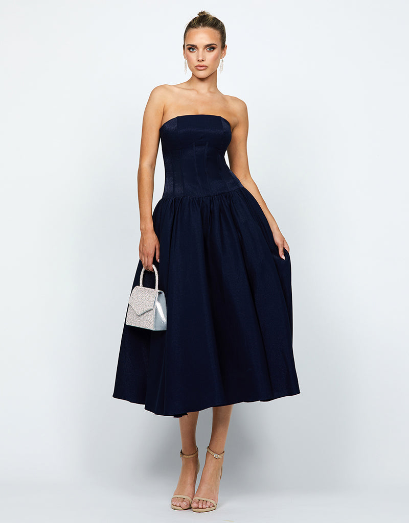 Embrace sophisticated allure with our KASSIDY A LINE MIDI, featuring triangular thick straps that frame elegantly. The corset detail at the bodice accentuates your silhouette, ensuring a flattering fit. A midi skirt with pleat detail and side pockets offers both style and convenience, perfect for carrying essentials. Fully lined for comfort and finished with an invisible zip closure at the back, this dress combines seamless elegance with practicality. Ideal for a variety of occasions, from formal dinners to cocktail parties or daytime events, it's a versatile piece that effortlessly transitions from day to evening with timeless grace.