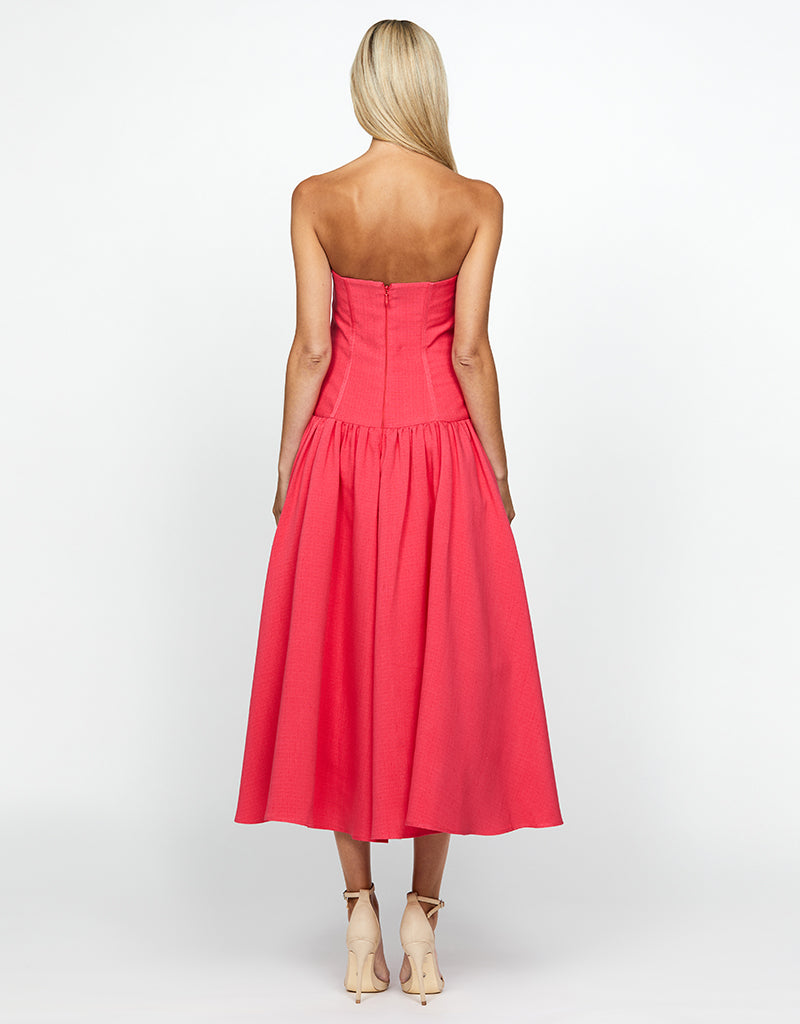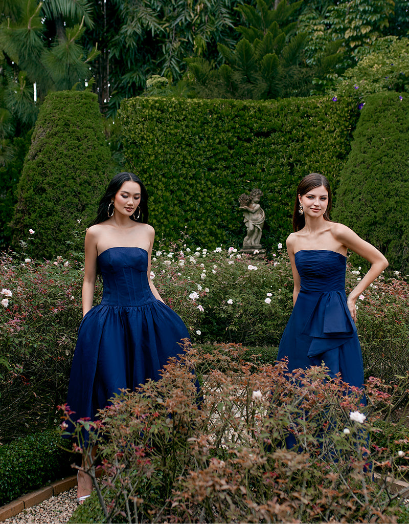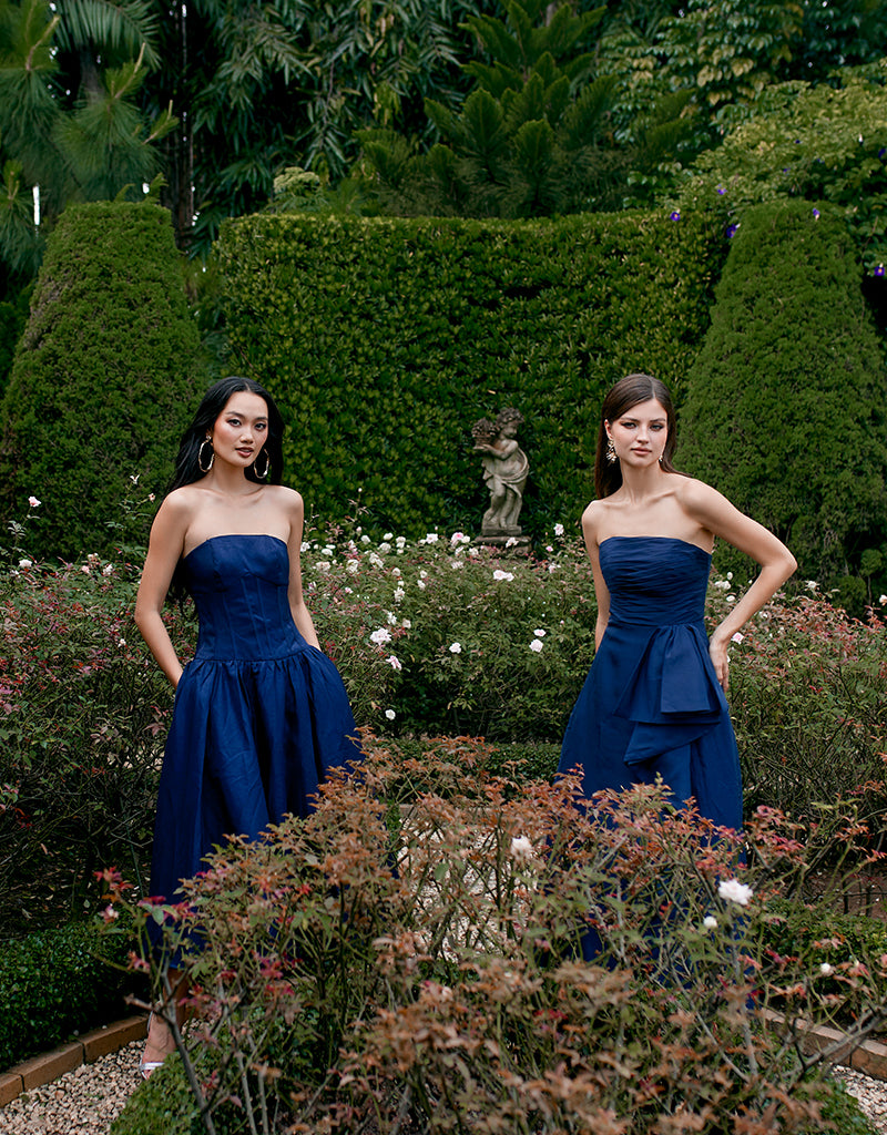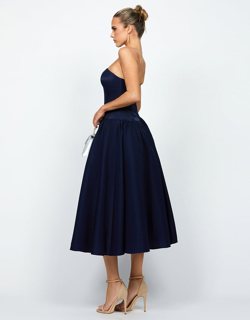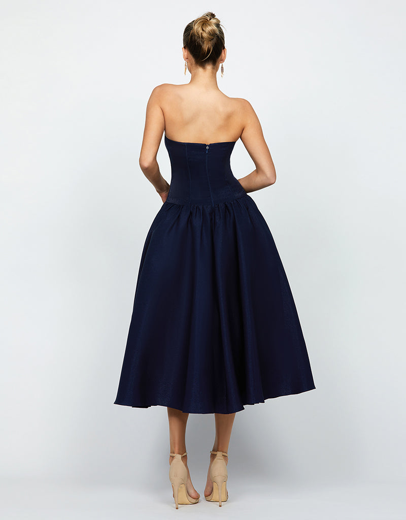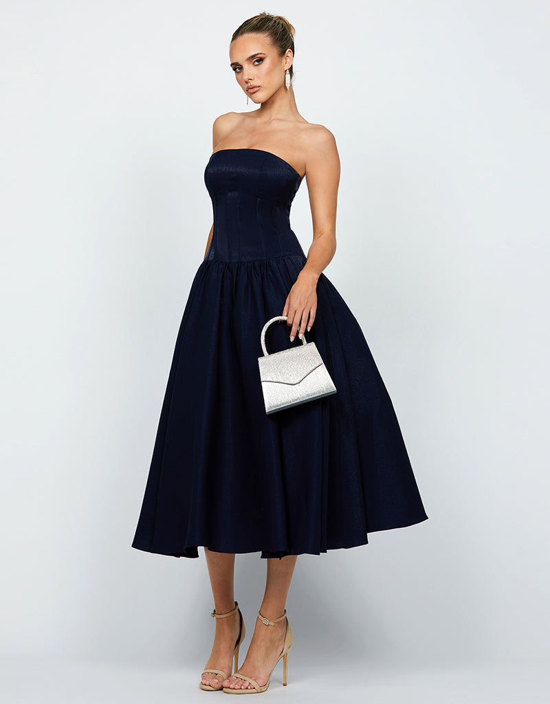 Embrace sophisticated allure with our KASSIDY A LINE MIDI, featuring triangular thick straps that frame elegantly. The corset detail at the bodice accentuates your silhouette, ensuring a flattering fit. A midi skirt with pleat detail and side pockets offers both style and convenience, perfect for carrying essentials. Fully lined for comfort and finished with an invisible zip closure at the back, this dress combines seamless elegance with practicality. Ideal for a variety of occasions, from formal dinners to cocktail parties or daytime events, it's a versatile piece that effortlessly transitions from day to evening with timeless grace.