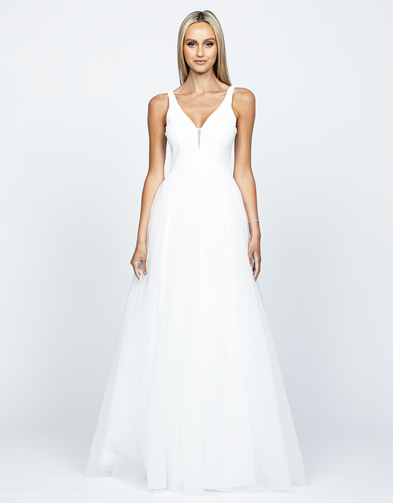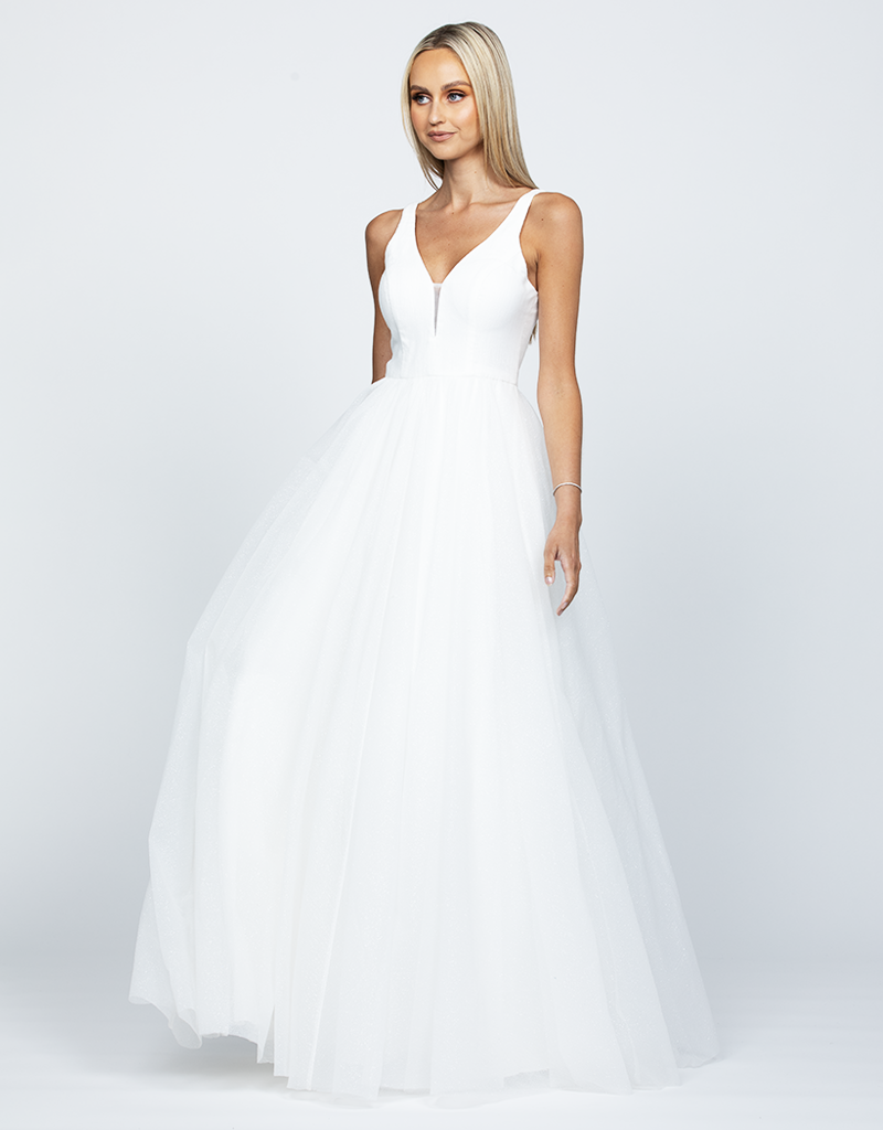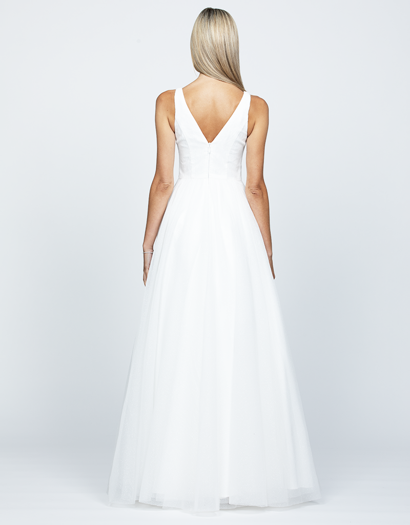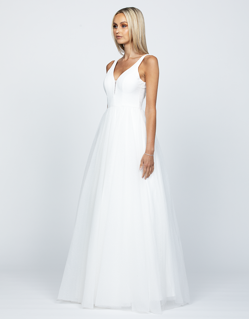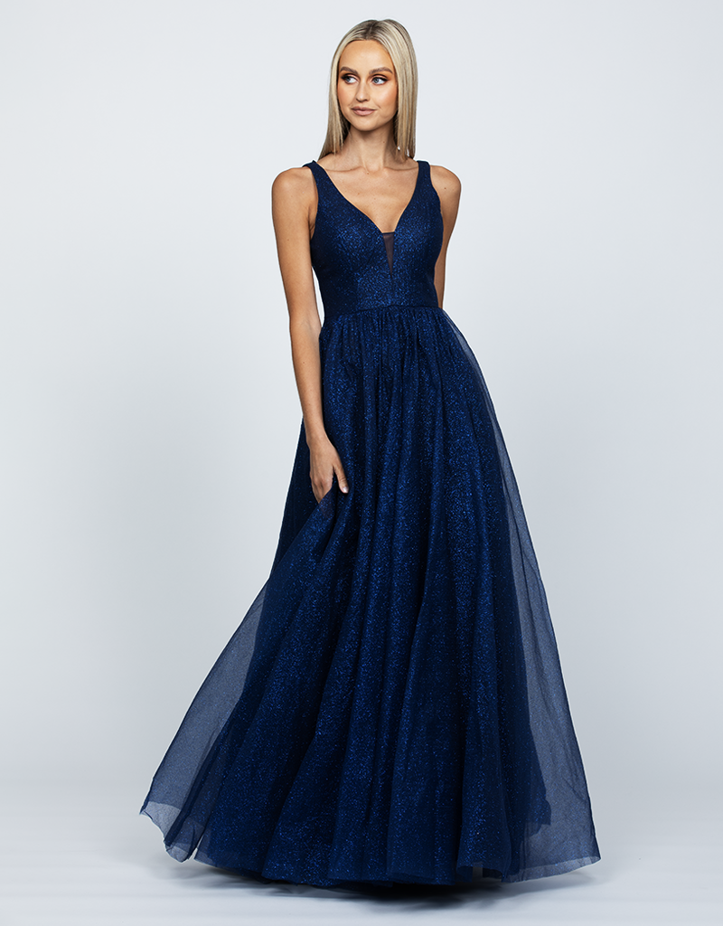 Shimmer and shine the night away in the luxe tulle skirt made from glitter organza, that is guaranteed to reflect from any light. The deep plunge with mesh detailing ensure that you show a little skin, even in such an extravagant dress. Dance comfortably knowing you are support with thick straps and bust boning.
