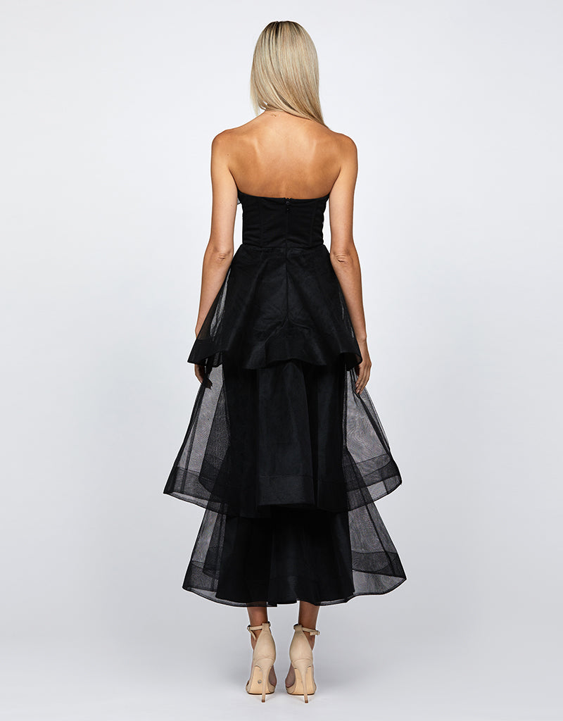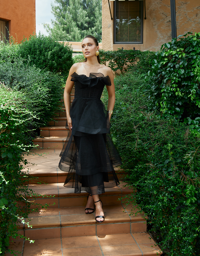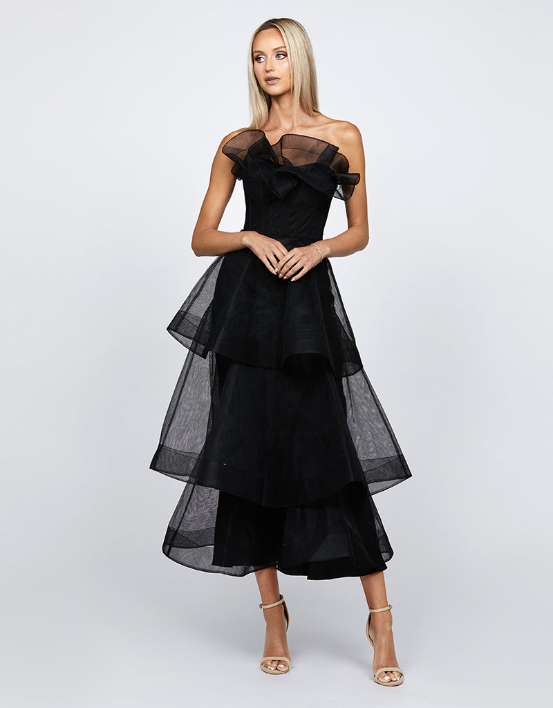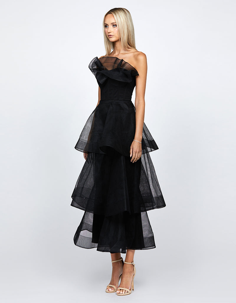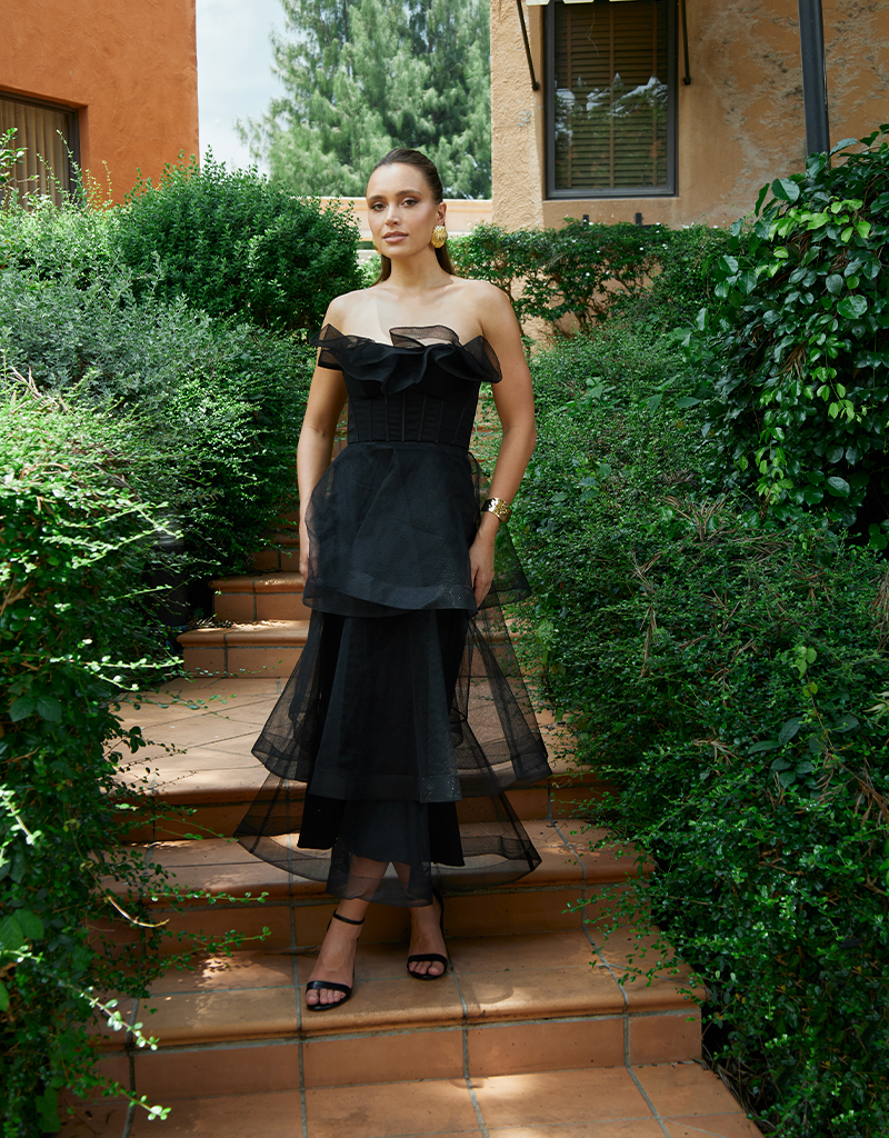 Elevate your elegance with our KASCADE TIERED RUFFLE MIDAXI, perfect for a black-tie affair or a masked ball. The bespoke ruffle feature along the neckline adds a touch of mysterious charm. Embark on an enchanting journey with the multi-tiered skirt, accentuated by horsehair braid along the hem, ensuring structural finesse with every step. Designed as a midaxi length, it offers ease and grace in movement, allowing you to dance through the night effortlessly. Whether it's the grandeur of a black-tie event or the mystique of a masked ball, this dress promises to be your epitome of timeless allure.