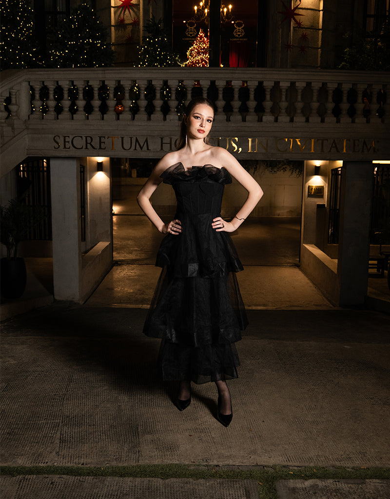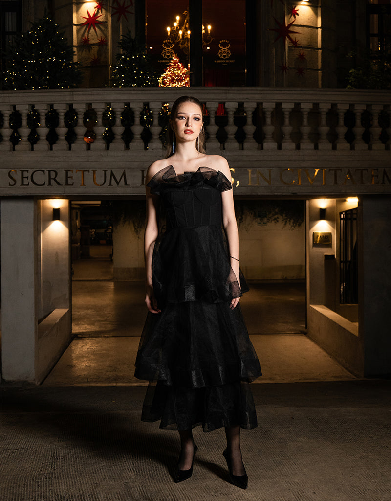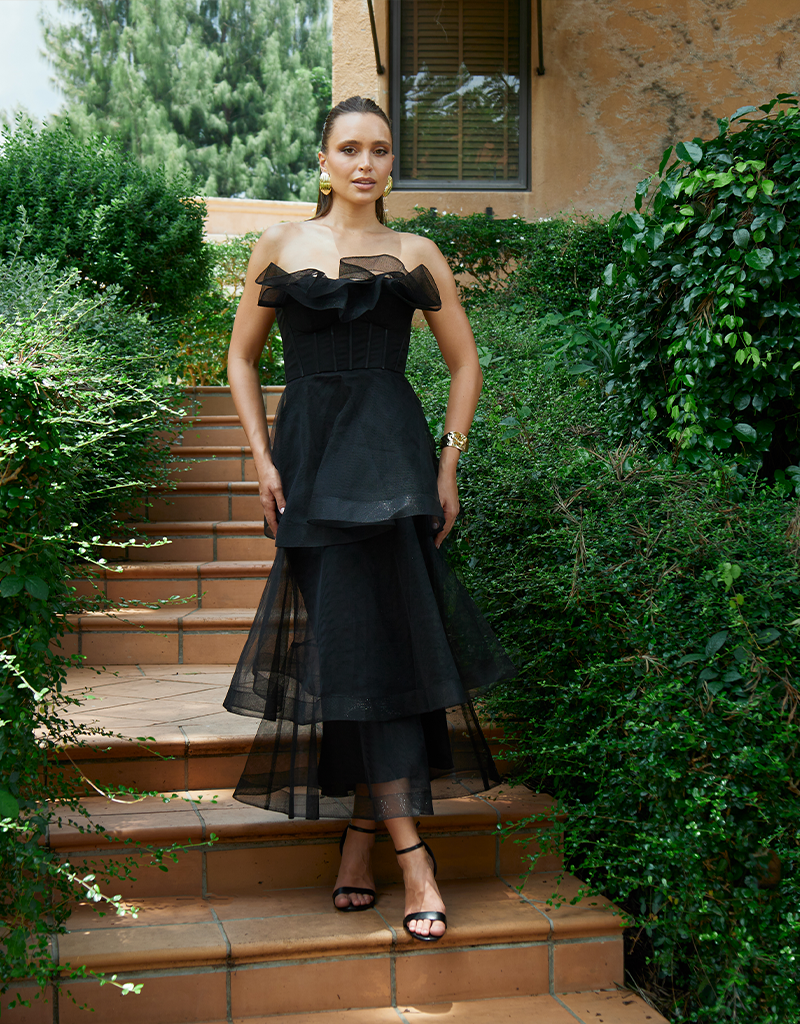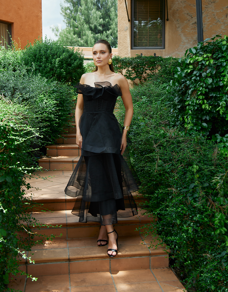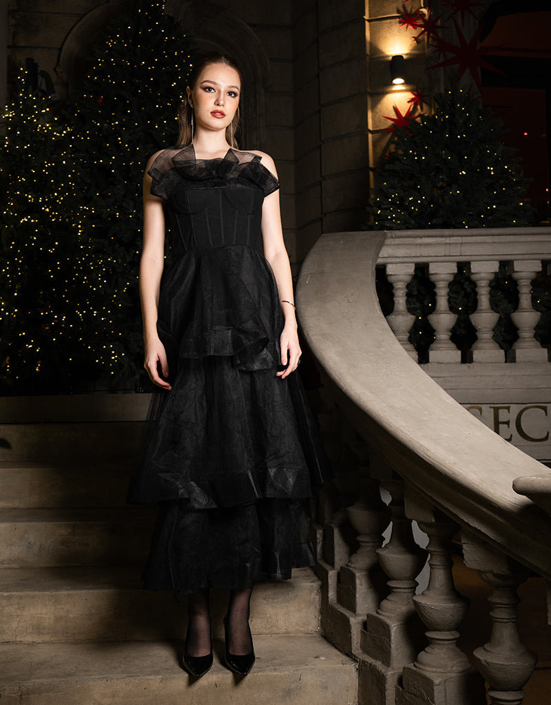 Elevate your elegance with our KASCADE TIERED RUFFLE MIDAXI, perfect for a black-tie affair or a masked ball. The bespoke ruffle feature along the neckline adds a touch of mysterious charm. Embark on an enchanting journey with the multi-tiered skirt, accentuated by horsehair braid along the hem, ensuring structural finesse with every step. Designed as a midaxi length, it offers ease and grace in movement, allowing you to dance through the night effortlessly. Whether it's the grandeur of a black-tie event or the mystique of a masked ball, this dress promises to be your epitome of timeless allure.