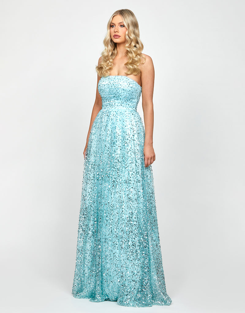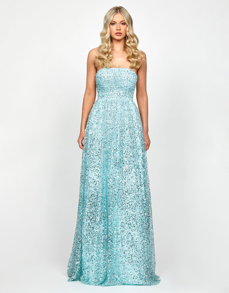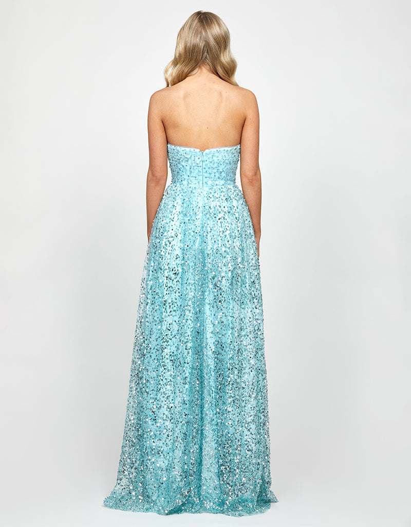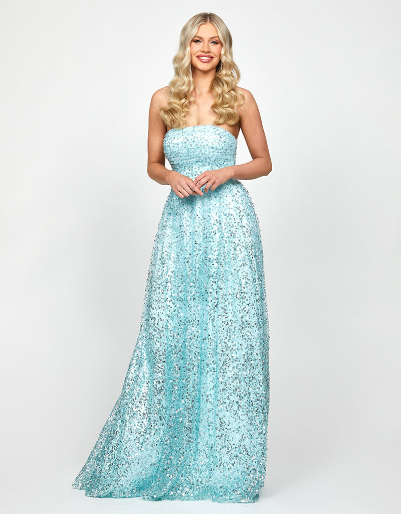 Make a glamorous statement in this breath-taking sequin mesh ball gown, designed to captivate from every angle. Featuring a flattering straight-across neckline and built-in cups for a supportive, seamless fit, the structured bodice is adorned with all-over pleat detailing that adds texture and dimension. The full-length ball gown skirt flows dramatically, enhanced with a stiff mesh interlining layer to create a voluminous, show-stopping silhouette. The invisible back zip closure ensures a sleek, streamlined look, while the full lining provides comfort and structure throughout the night.