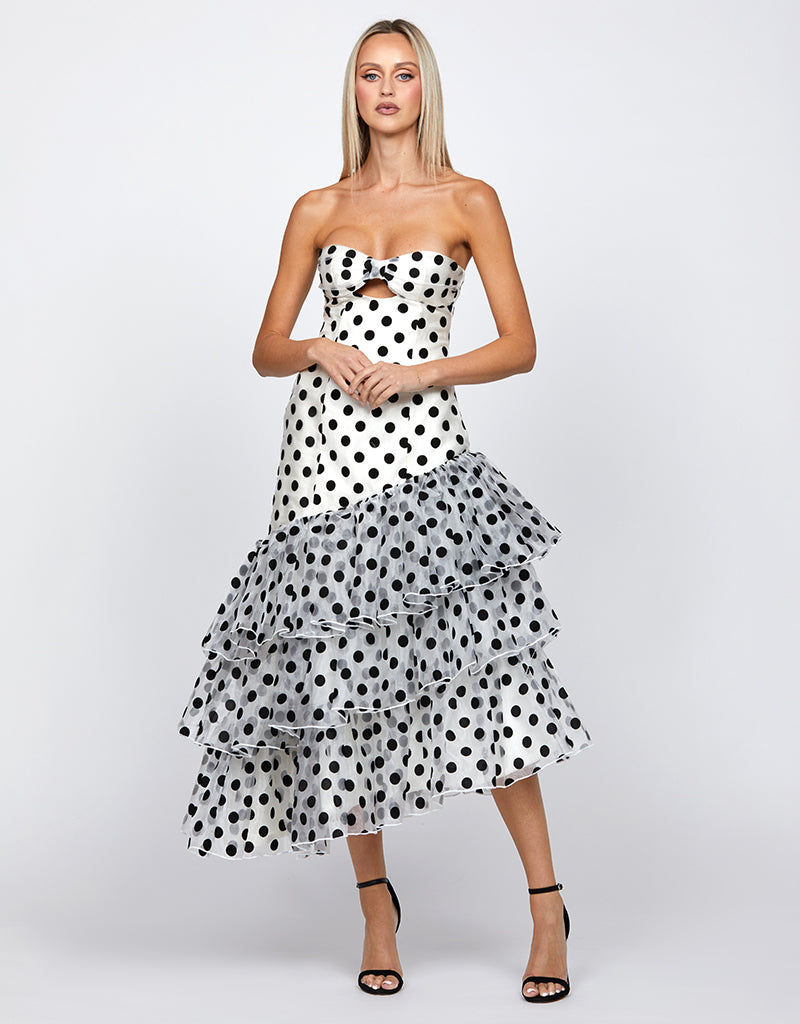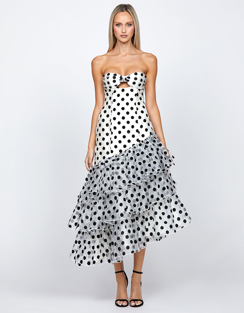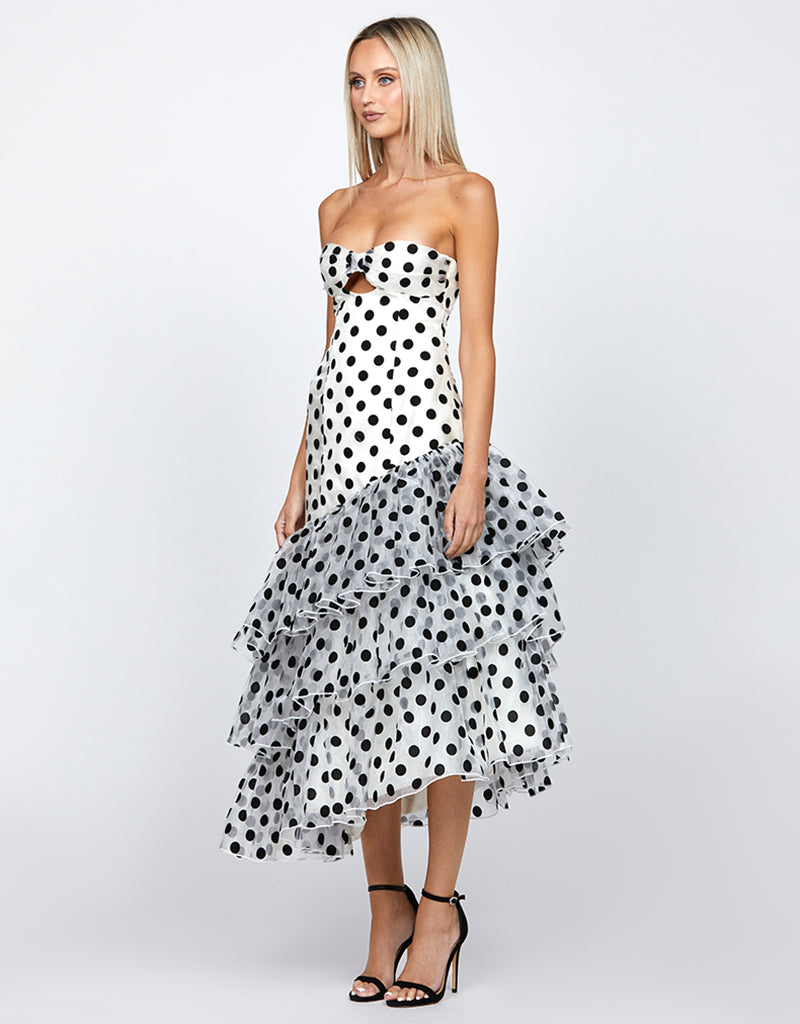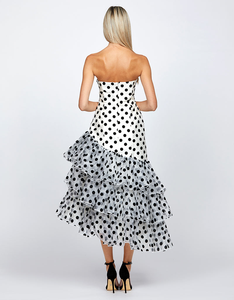 The mini-to-midi asymmetric tiered skirt, with gathered details, adds a fun and flirty vibe, creating beautiful movement as you walk. Made from polka dot organza, this dress has a whimsical feel that’s ideal for the races. With an invisible back zip and full lining, it ensures a smooth and comfortable fit.