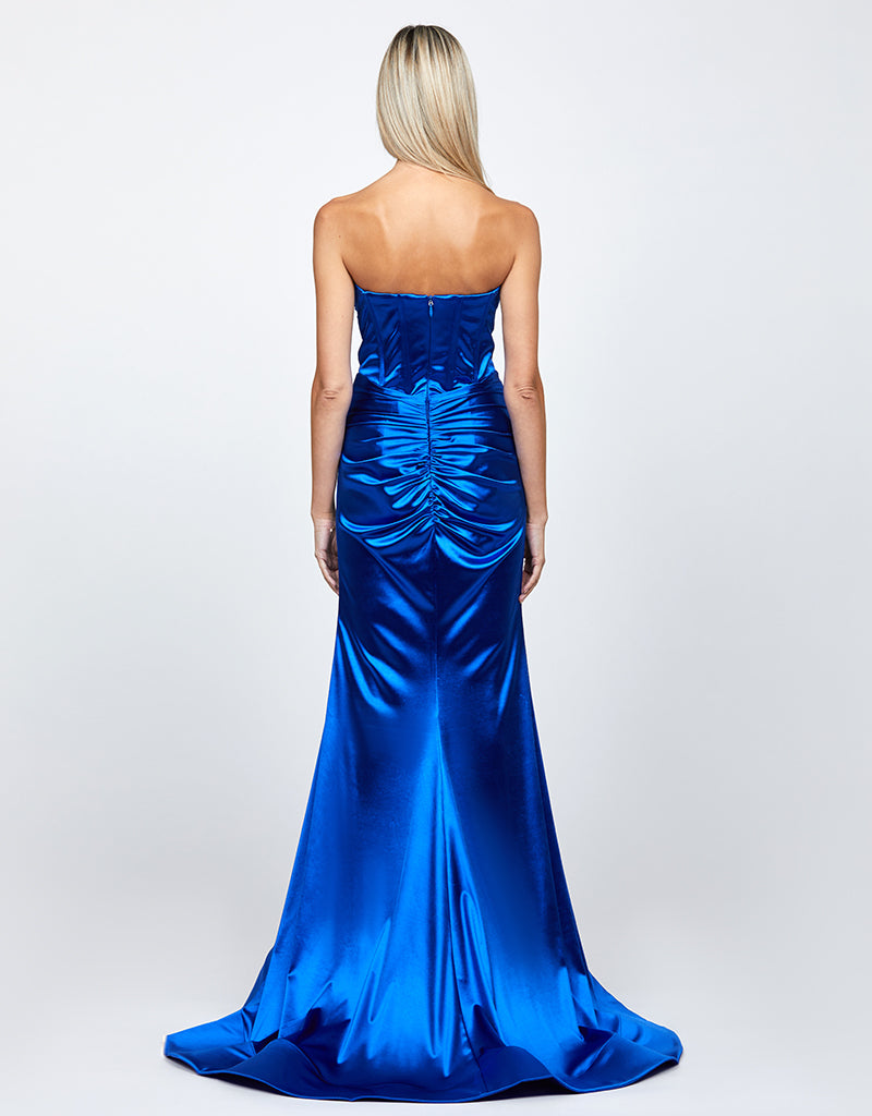The full-length fishtail skirt, enhanced with pleat detailing at the hip, flows elegantly to the floor. A high side front split adds a bold, sultry touch, while the center back ruching creates a flattering fit. Crafted from luxurious slinky jersey fabric, this gown offers a stunning balance of comfort and allure. Finished with an invisible back zip closure, full lining, and a structured hemline, it provides a flawless, smooth fit.