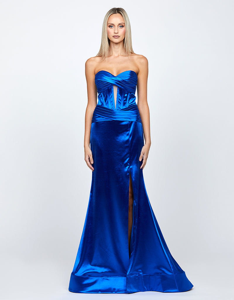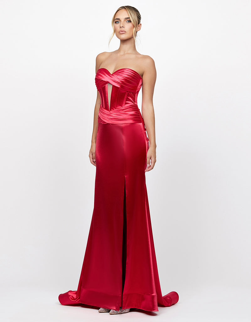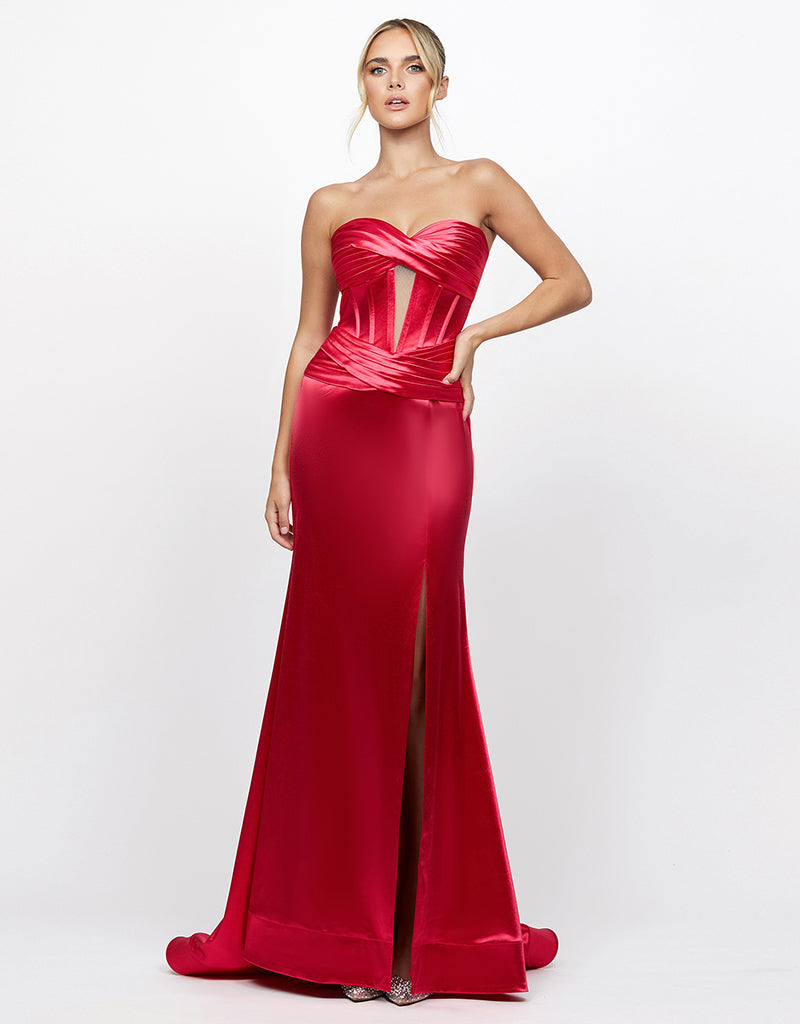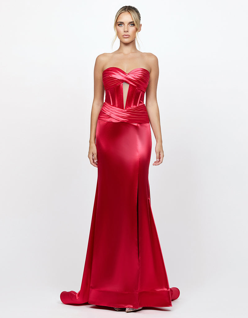 Embrace show-stopping glamour with the Lameria Sweetheart Fishtail gown, a breath-taking design perfect for turning heads. This gown features a strapless sweetheart neckline with intricate crossover pleat detailing, adding dimension and sophistication to the bodice. The corset-style bodice, complete with a sheer center front panel and dropped waist, creates a strikingly sleek silhouette.