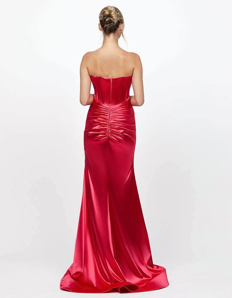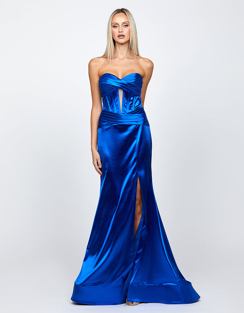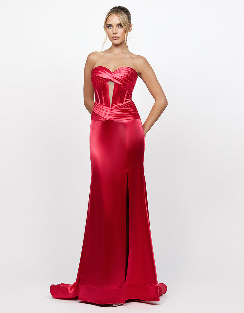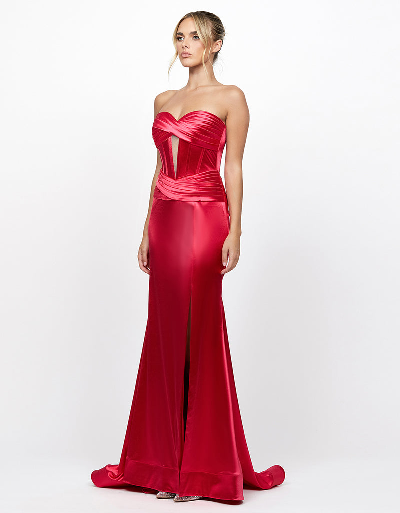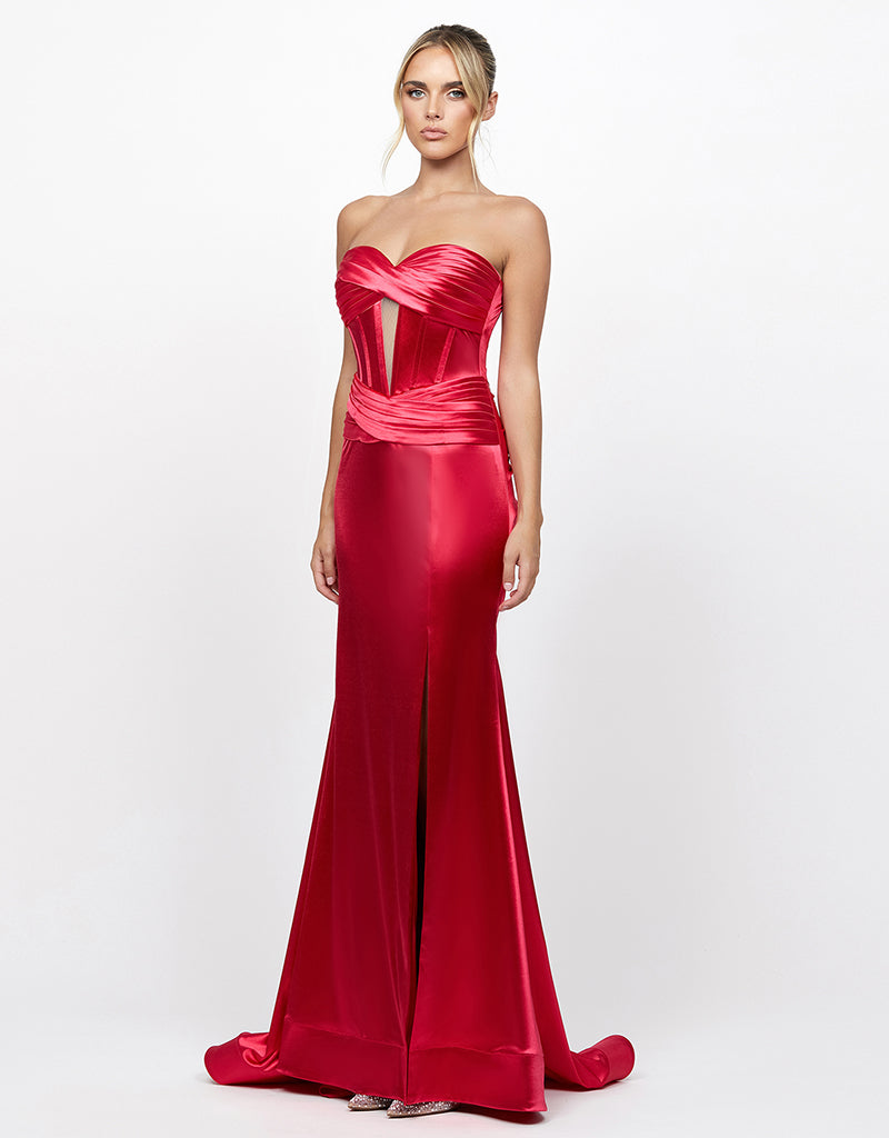 Embrace show-stopping glamour with the Lameria Sweetheart Fishtail gown, a breath-taking design perfect for turning heads. This gown features a strapless sweetheart neckline with intricate crossover pleat detailing, adding dimension and sophistication to the bodice. The corset-style bodice, complete with a sheer center front panel and dropped waist, creates a strikingly sleek silhouette.