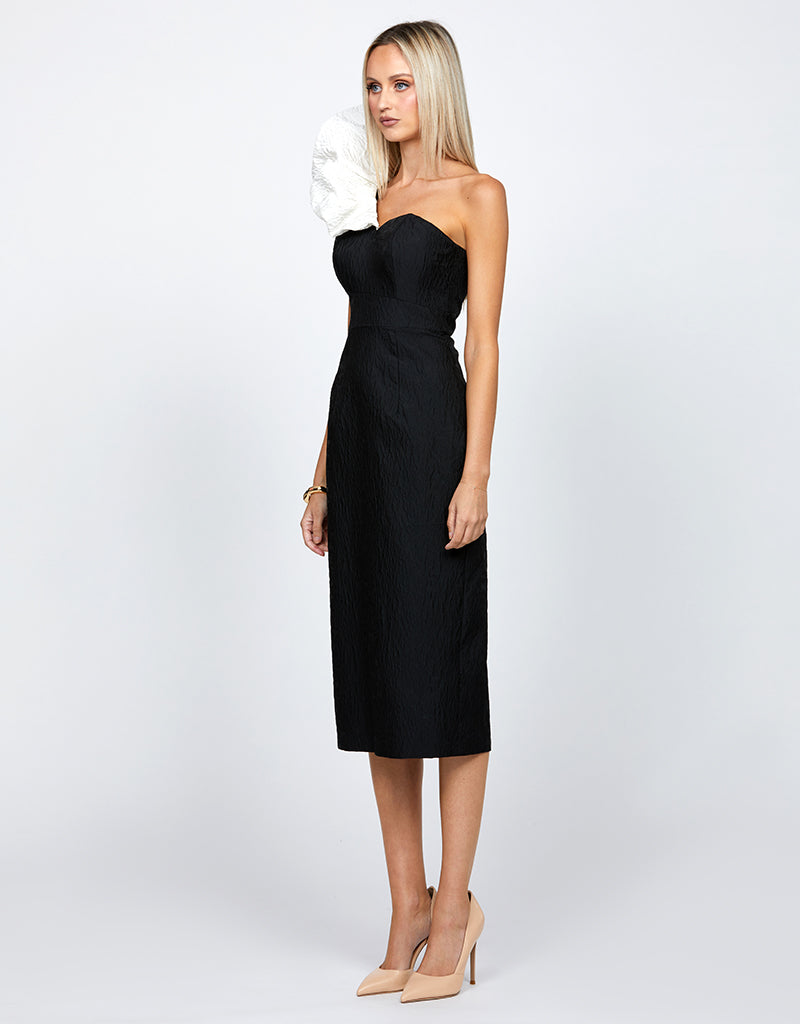 Finished with an invisible back zip and fully lined for comfort, the dress is crafted from luxurious embossed jacquard fabric, giving it a rich, textured feel.