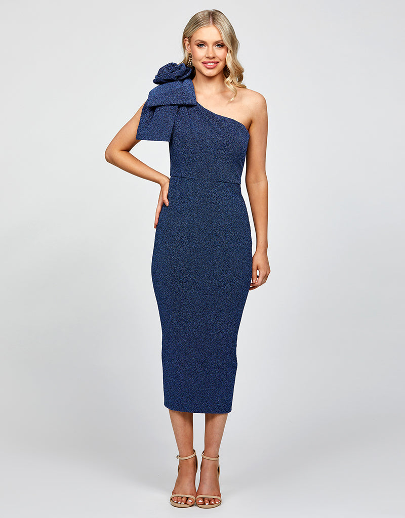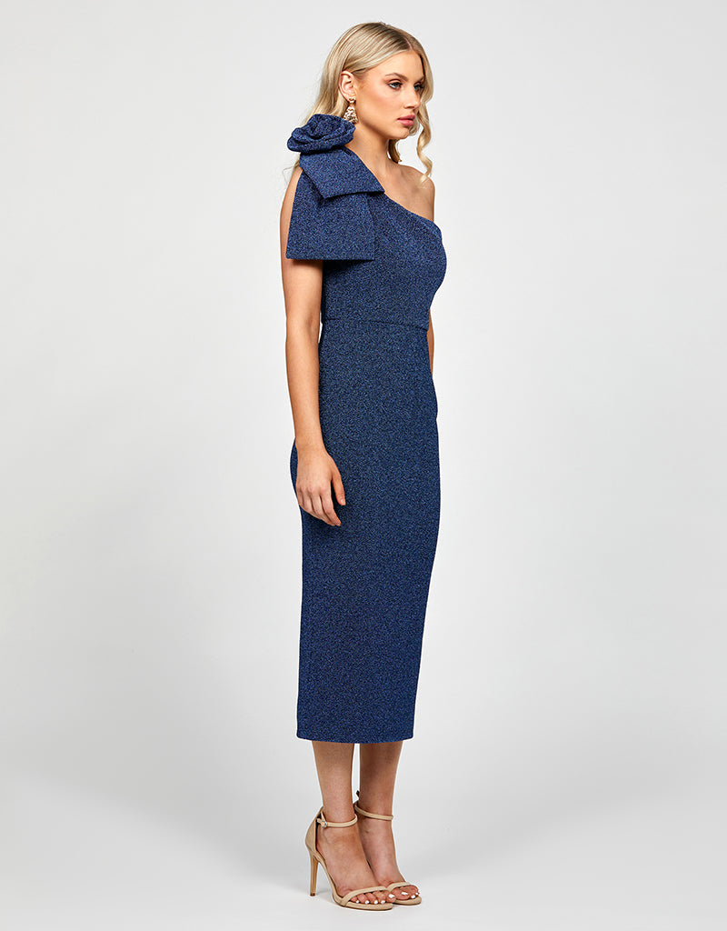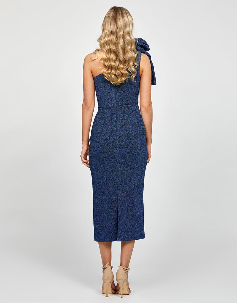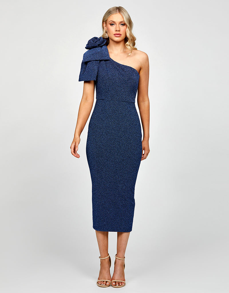 The Magdalina One-Shoulder Midi Dress exudes contemporary glamour with its asymmetrical one-shoulder neckline, featuring a chic bow detail for an added touch of elegance. The detachable rosette gives you the option to personalize the look, adding versatility to this show-stopping dress.