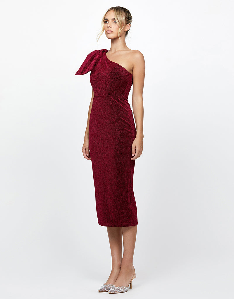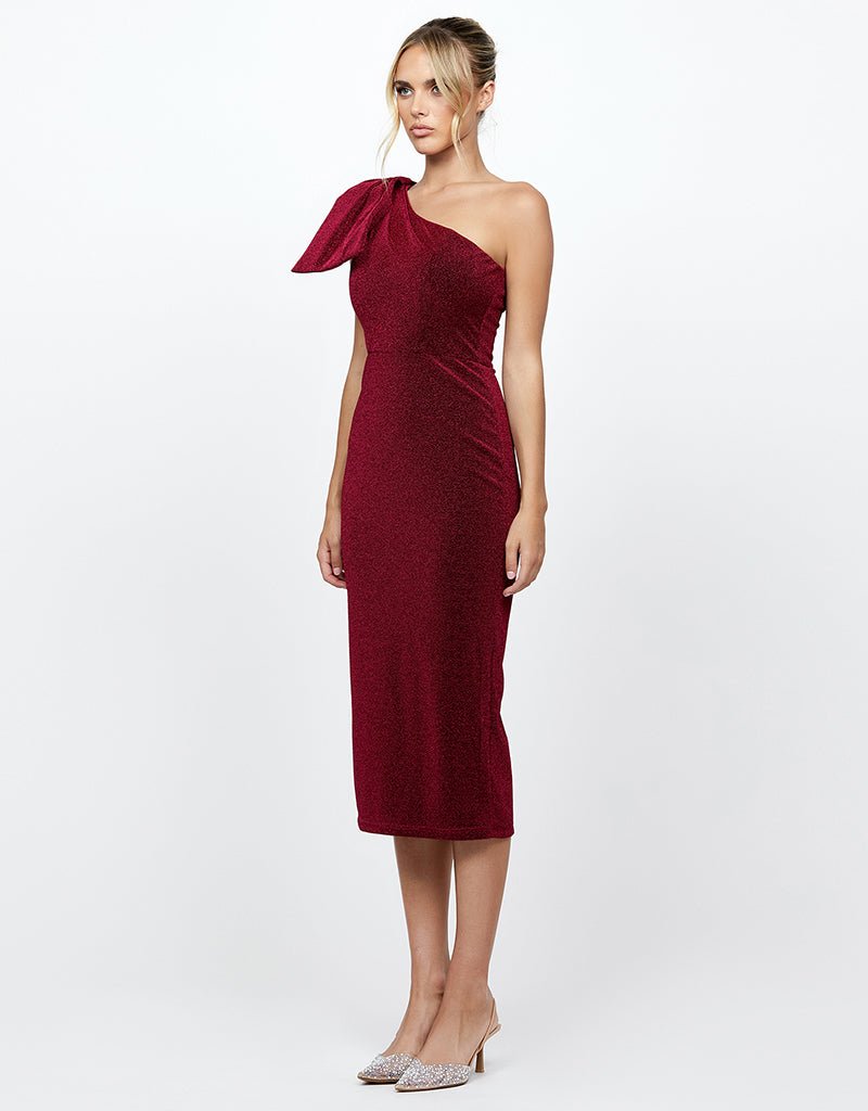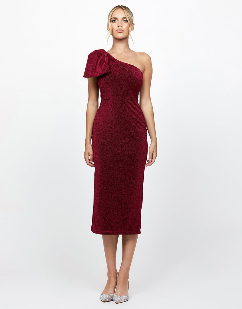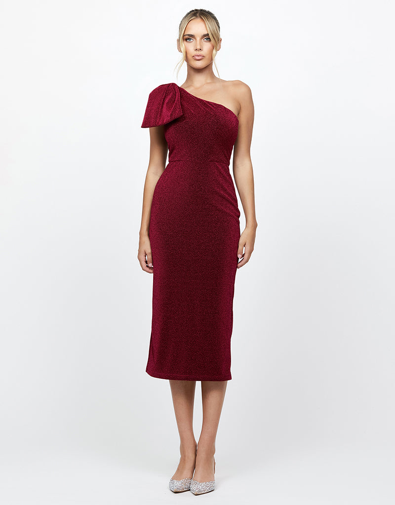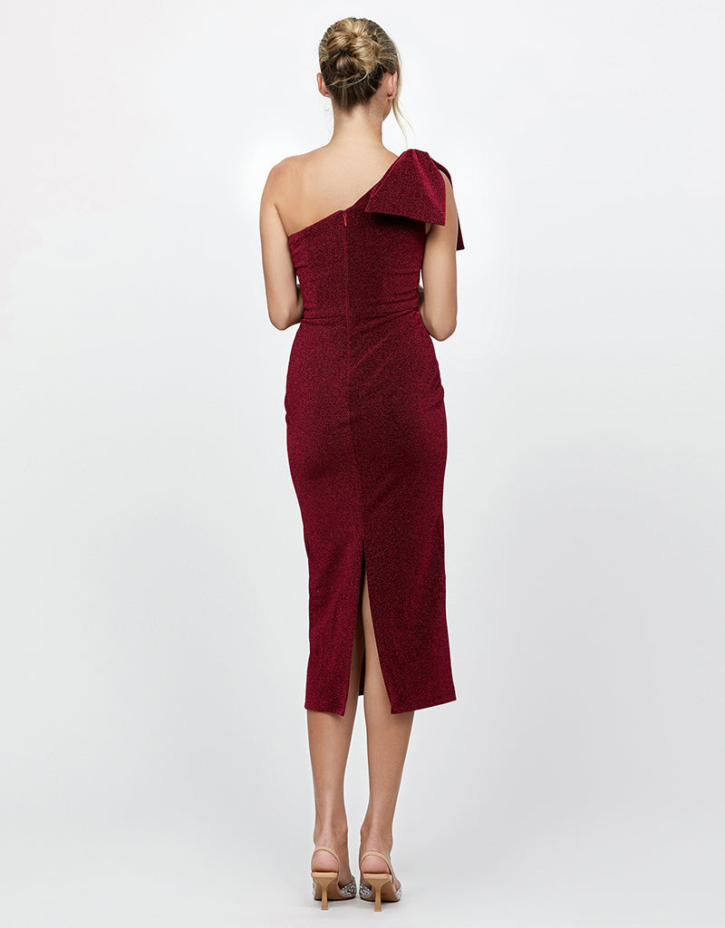 The Magdalina One-Shoulder Midi Dress exudes contemporary glamour with its asymmetrical one-shoulder neckline, featuring a chic bow detail for an added touch of elegance. The detachable rosette gives you the option to personalize the look, adding versatility to this show-stopping dress.