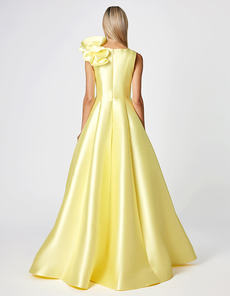 Defined by a plunging V neckline, this gown makes a statement with a sculptural ruffle detail at one shoulder. The fitted bodice is structured with a wide waistband and built-in bust cups for support, before falling into a sweeping A-line skirt with discreet in-seam pockets. Fully lined and finished with an invisible zip closure at the back.