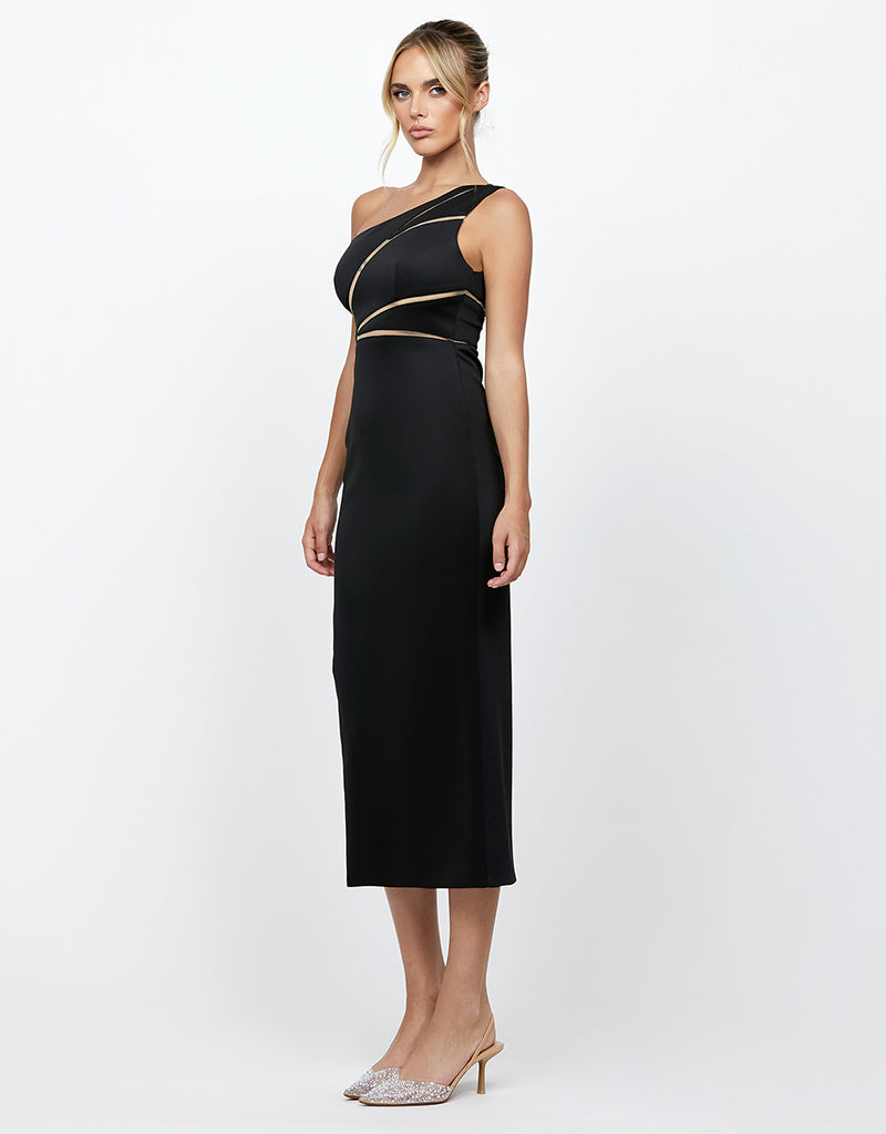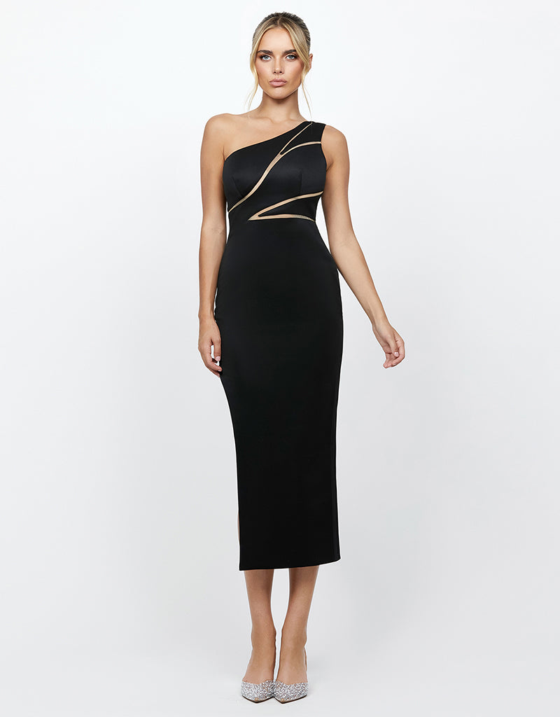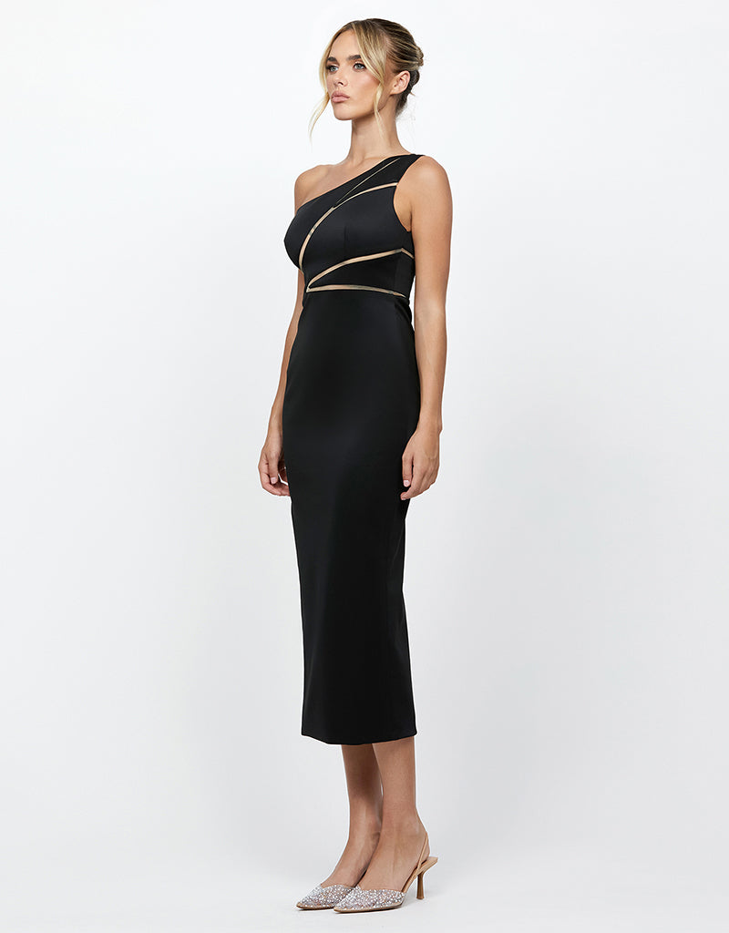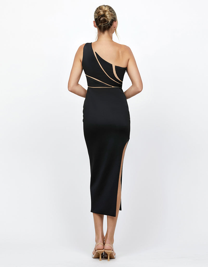 Turn heads in this elegant one-shoulder dress, featuring a sleek thin strap and a bold asymmetric, strategically placed cut-out detail at the bodice, beautifully covered with mesh for a modern, sophisticated touch. The fitted midaxi-length skirt contours the body, while the side front open split adds a hint of drama and movement. Designed with an invisible side zip closure for a seamless fit, and fully lined for comfort and structure, this dress is perfect for a special occasion or an evening out, blending cutting-edge style with timeless elegance.