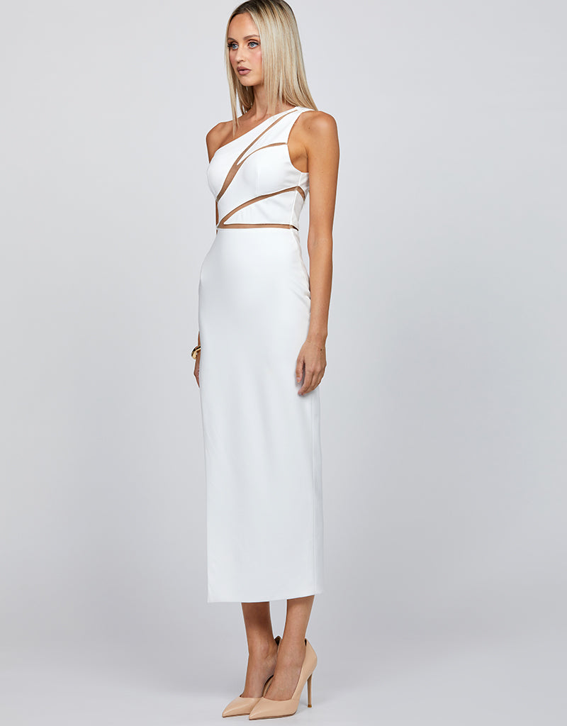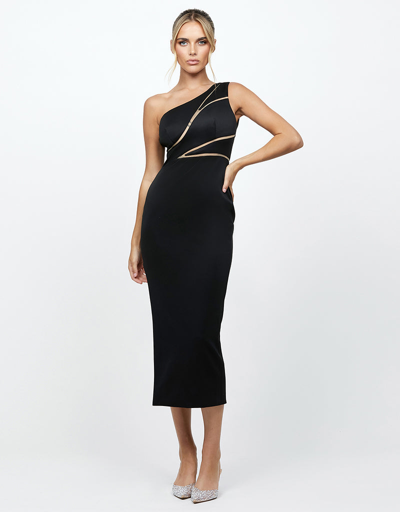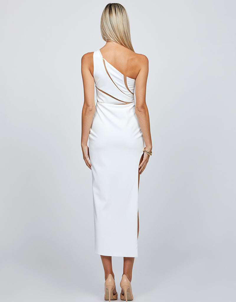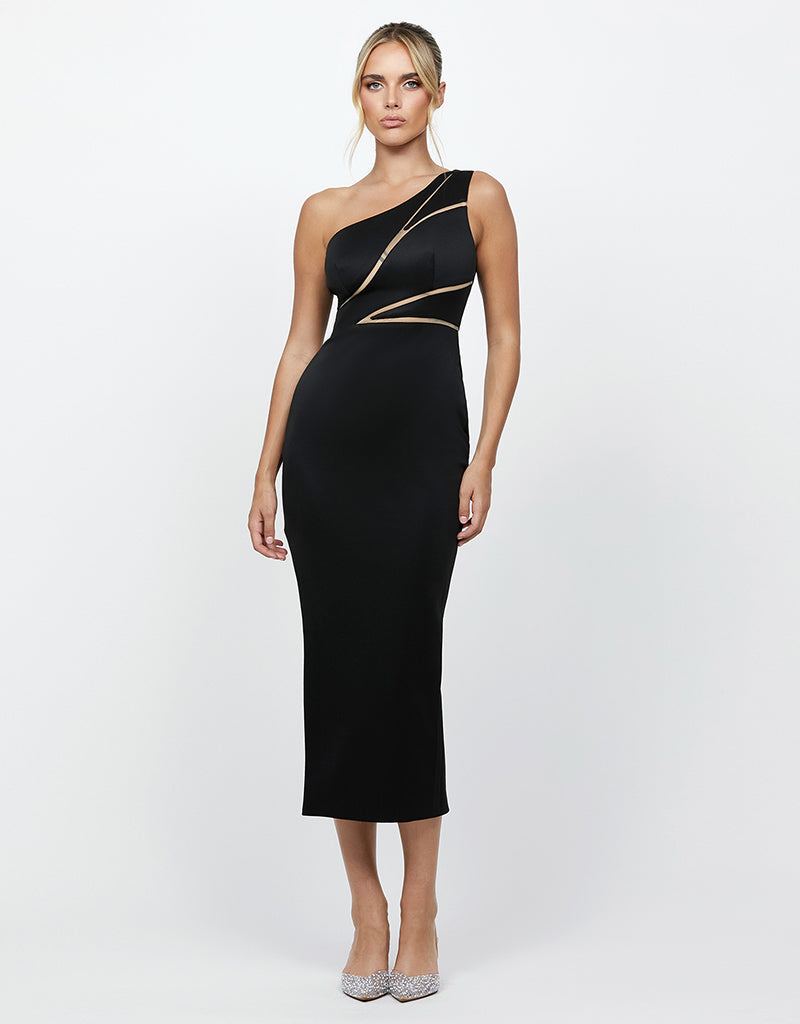 Turn heads in this elegant one-shoulder dress, featuring a sleek thin strap and a bold asymmetric, strategically placed cut-out detail at the bodice, beautifully covered with mesh for a modern, sophisticated touch. The fitted midaxi-length skirt contours the body, while the side front open split adds a hint of drama and movement. Designed with an invisible side zip closure for a seamless fit, and fully lined for comfort and structure, this dress is perfect for a special occasion or an evening out, blending cutting-edge style with timeless elegance.