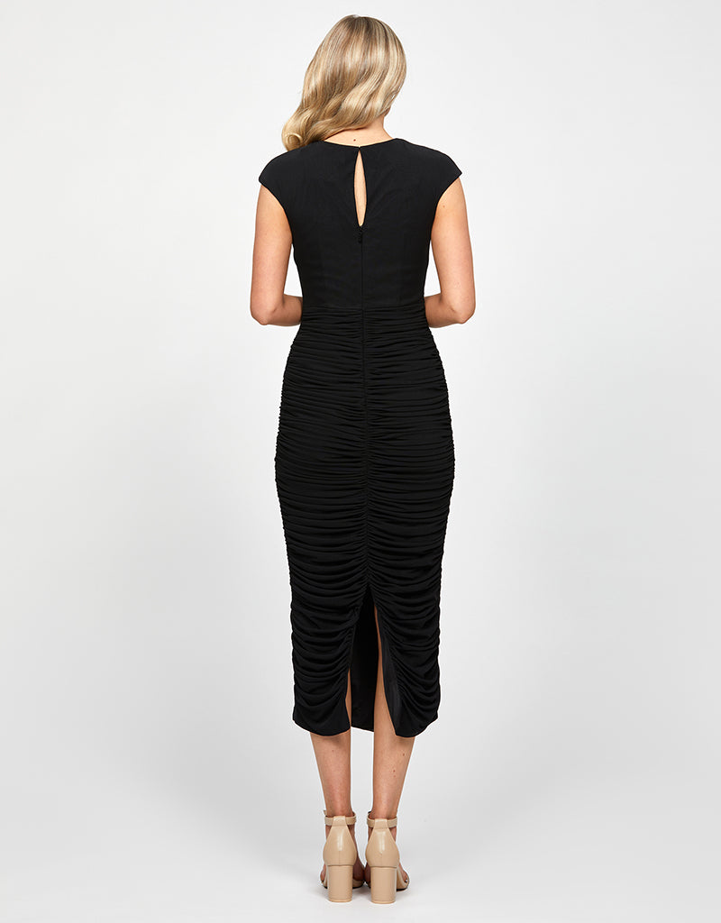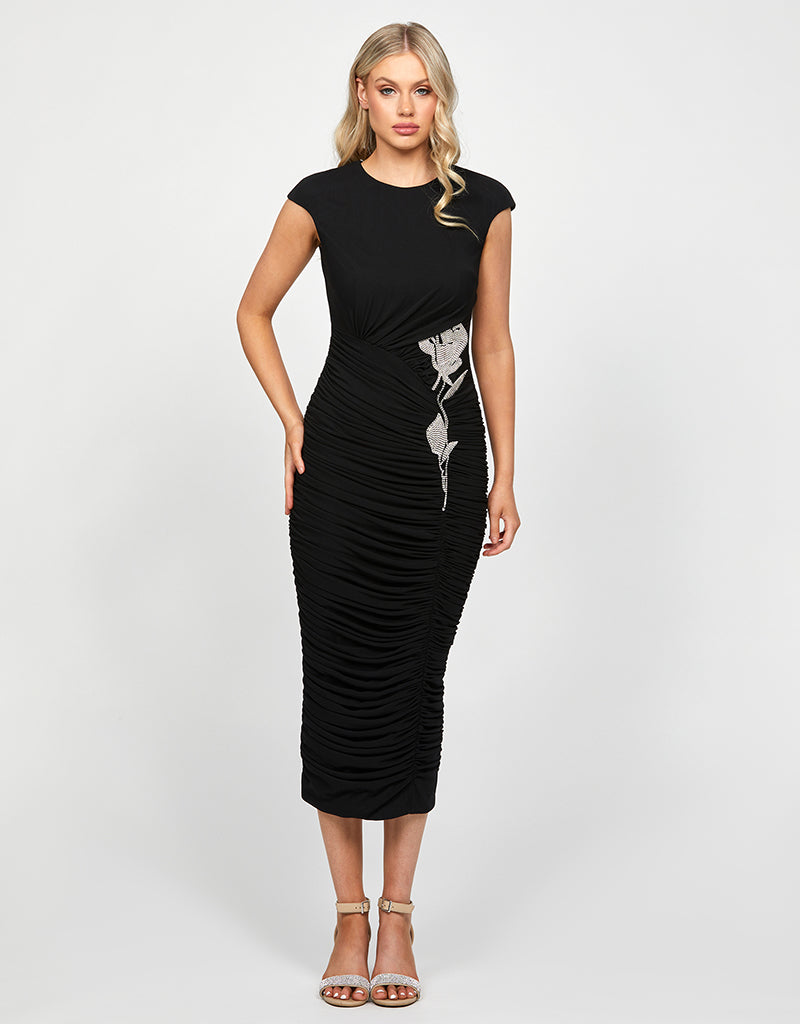 Make a stunning statement with this elegant midi dress that combines sophistication and modern flair. The covered high neckline with cap sleeves offers a refined look, while the asymmetric ruched bodice with a keyhole slit at the back adds a touch of daring allure. A striking diamante applique at the side front elevates the design with a subtle yet glamorous sparkle. The fitted midi skirt features allover ruching for a flattering, contouring fit, complemented by a back split that allows for effortless movement. Fully lined with an invisible back zip closure, this dress provides both comfort and style.