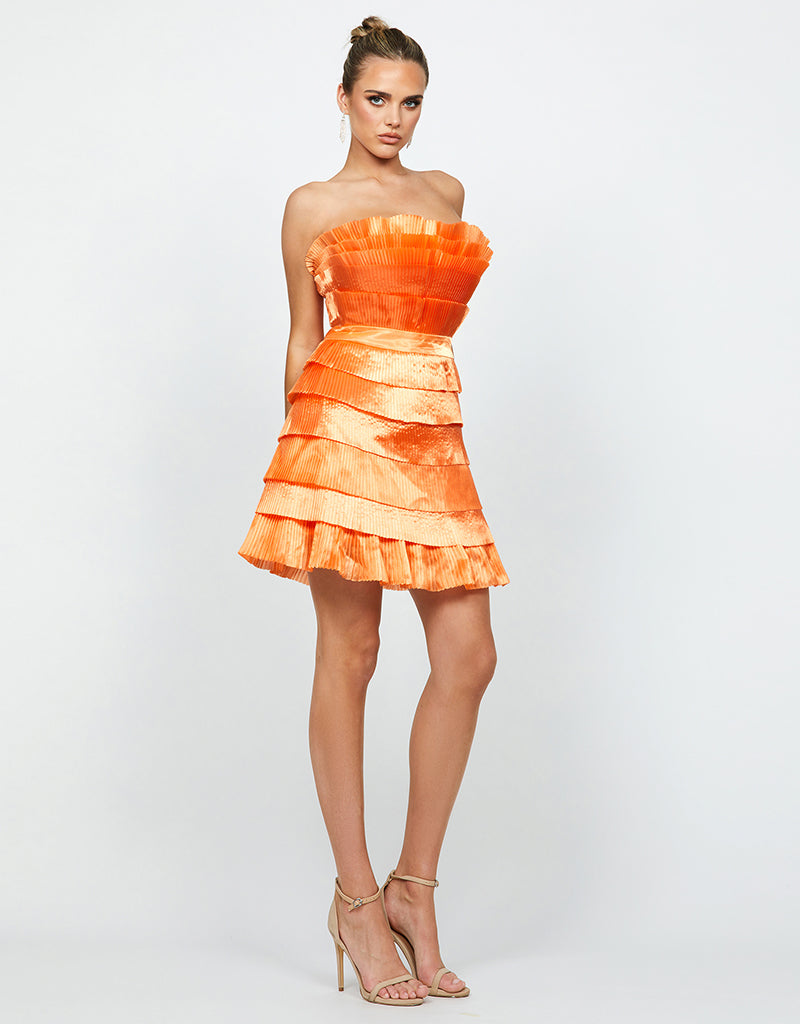 Make a chic statement in this elegant mini dress, perfect for any special occasion. The straight across neckline design offers a timeless and sophisticated look. Tiered pleated detailing adorns both the bodice and skirt, adding texture and dimension to the ensemble. A waistband detail accentuates your figure, creating a flattering silhouette. Crafted from fabric with no stretch, this dress ensures a structured fit and maintains its shape throughout the night. Fully lined at the bodice and skirt, it provides comfort and coverage. An invisible zip closure at the back ensures a seamless finish. Embrace classic elegance with a modern twist in this stunning dress.