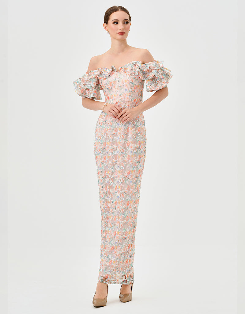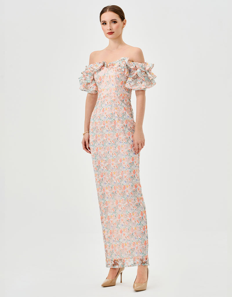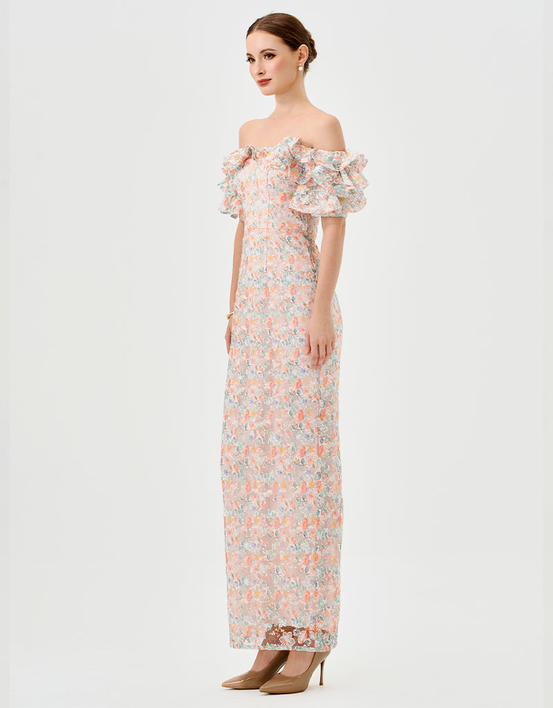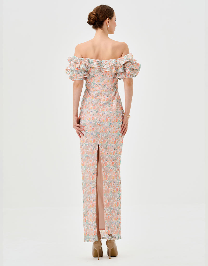 The off-the-shoulder neckline with ruffled flounce sleeves creates a playful, feminine frame, while the fitted bodice with a tapered waistline highlights a sleek silhouette. The full-length column skirt with a back split adds effortless movement and subtle allure. Fully lined with an invisible back zip, this dress combines elegance and modern sophistication for any occasion.