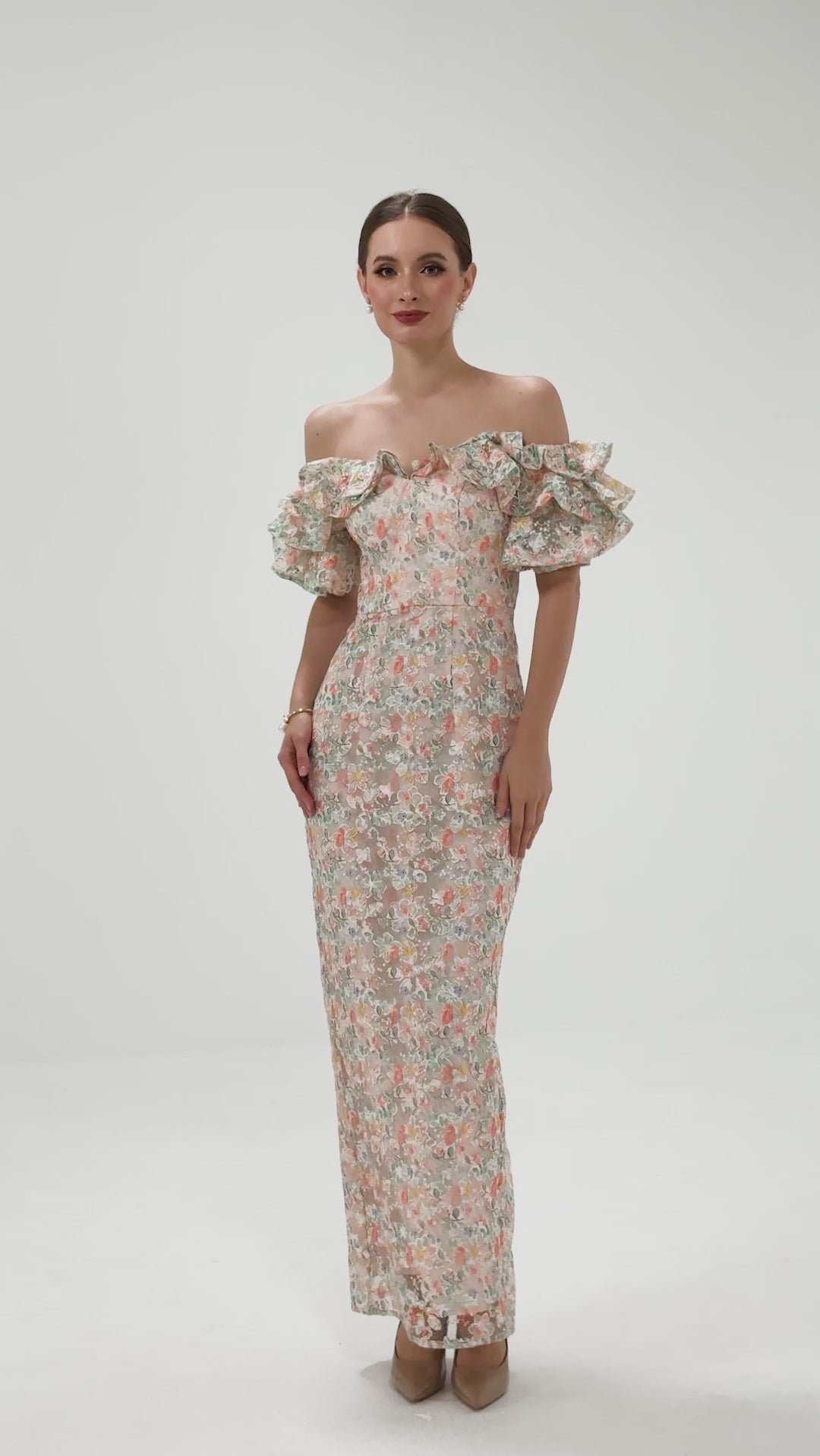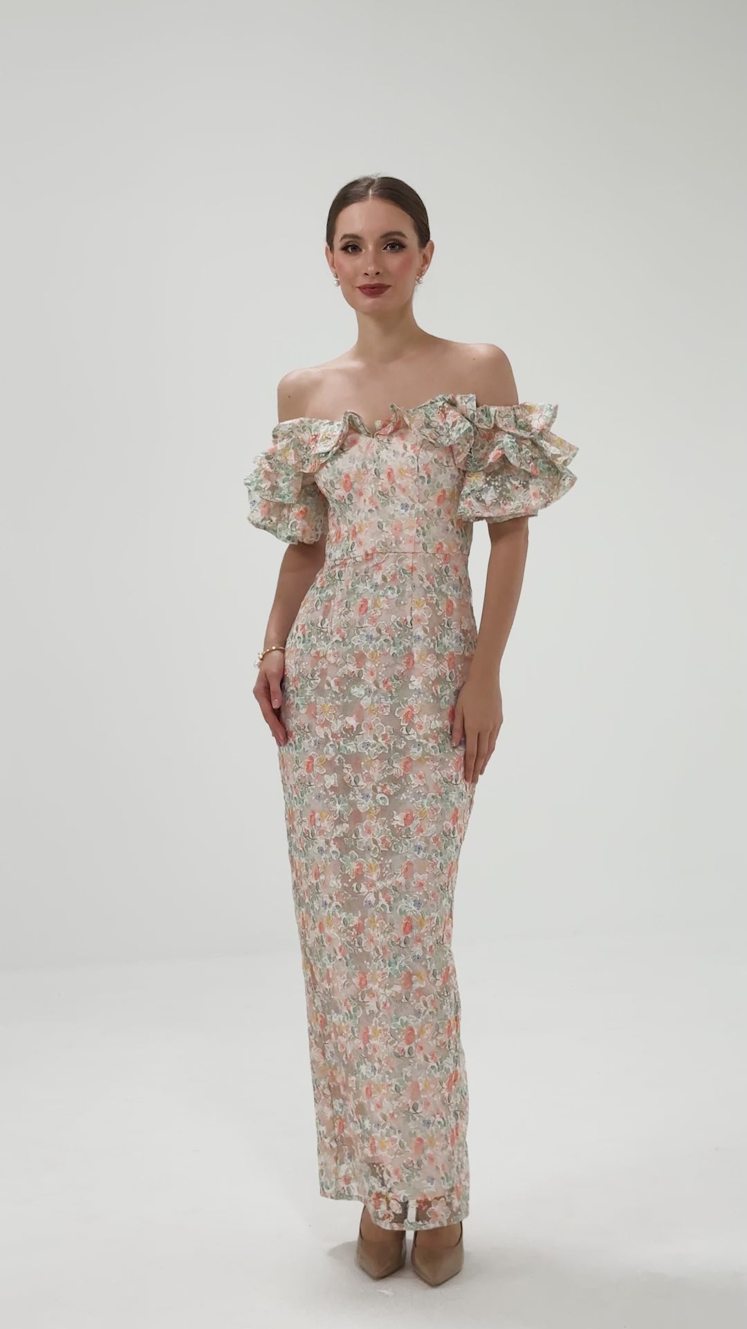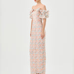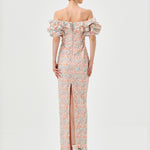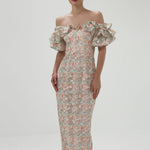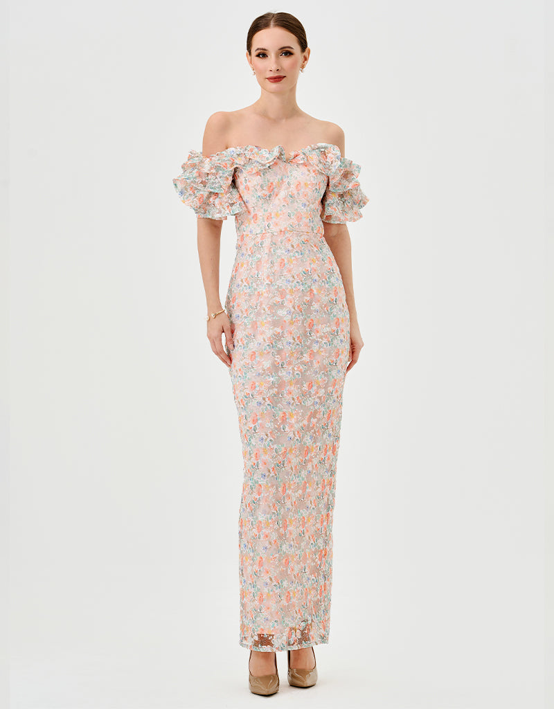 The off-the-shoulder neckline with ruffled flounce sleeves creates a playful, feminine frame, while the fitted bodice with a tapered waistline highlights a sleek silhouette. The full-length column skirt with a back split adds effortless movement and subtle allure. Fully lined with an invisible back zip, this dress combines elegance and modern sophistication for any occasion.