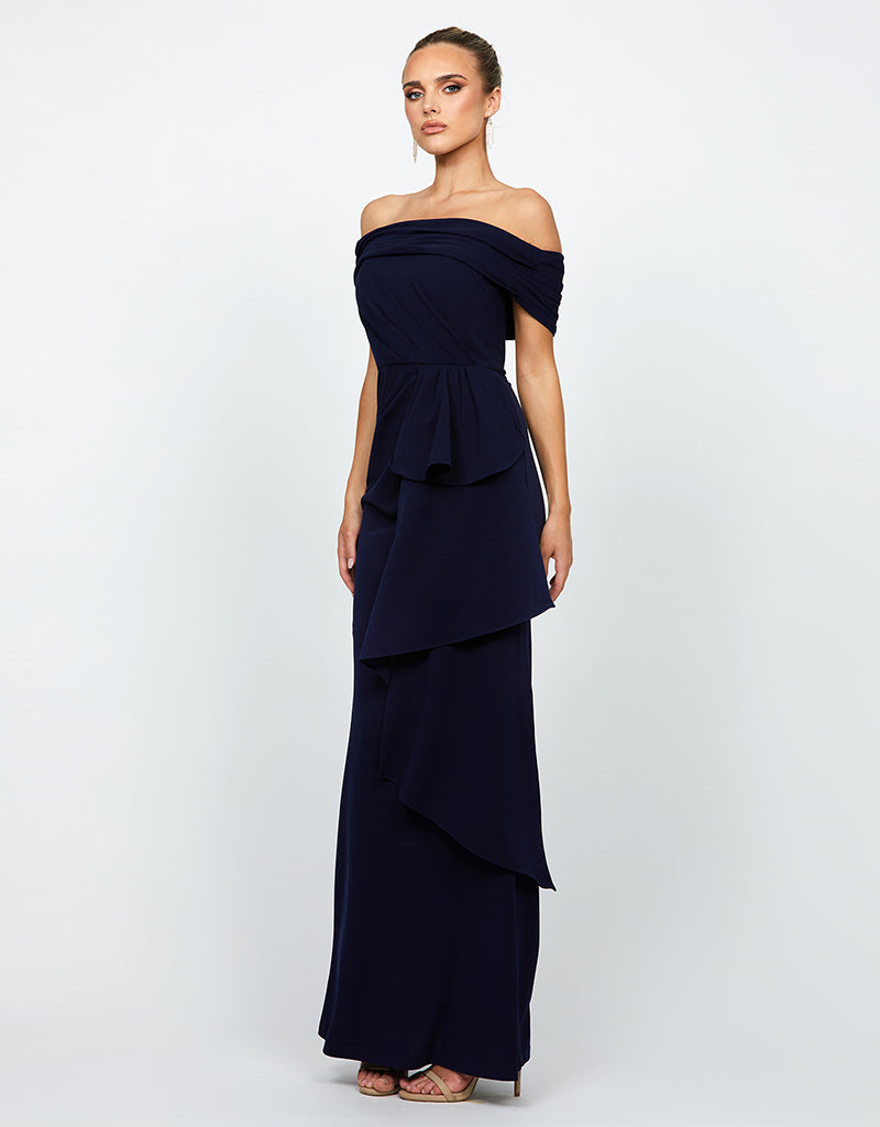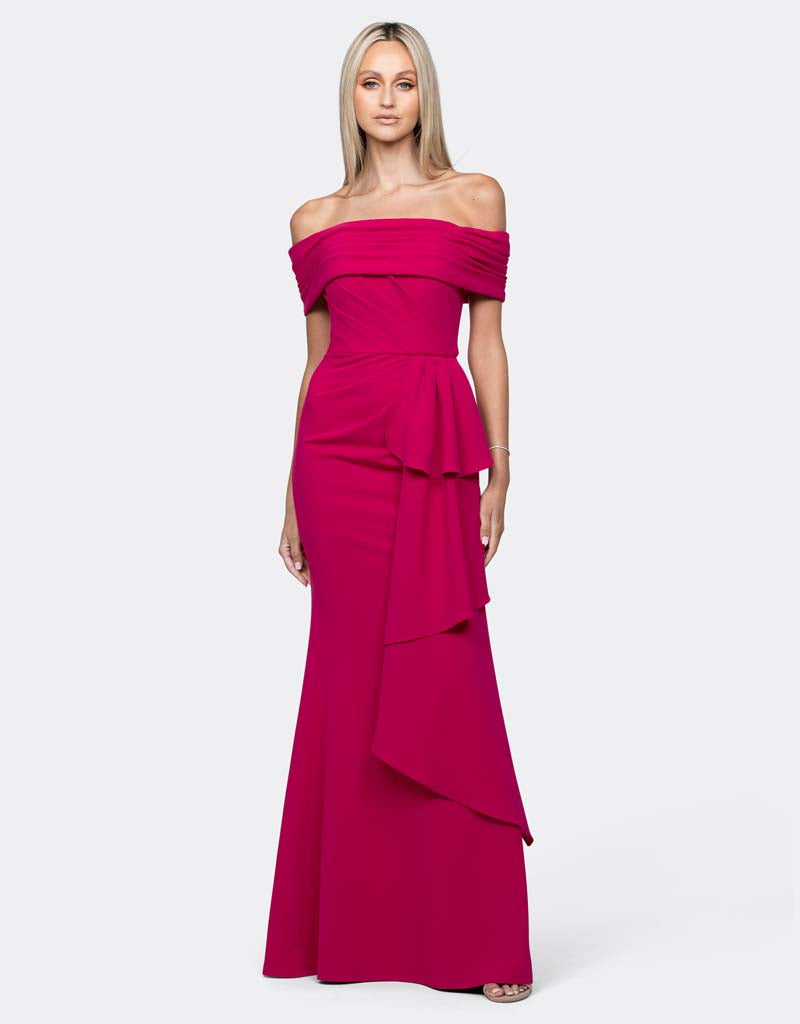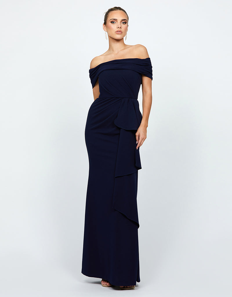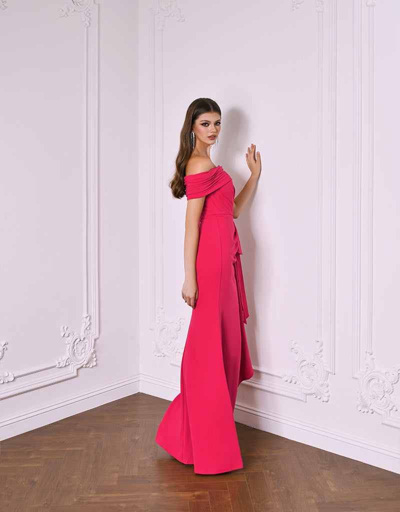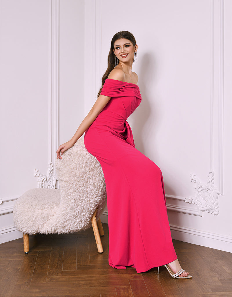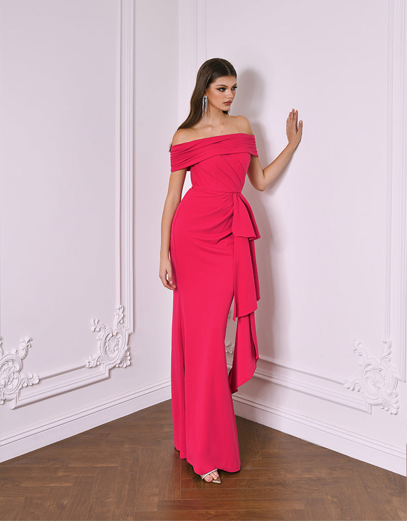 Radiate sophistication in this dress with a straight-across off-shoulder neckline, beautifully framing the shoulders. The draped overlay feature adds a touch of modern elegance, creating a chic and refined look. The side sash on the waistline enhances the silhouette, while the fishtail skirt brings a flattering and stylish finish. This dress is a perfect choice for those who appreciate timeless charm with a contemporary twist, making it ideal for various special occasions.