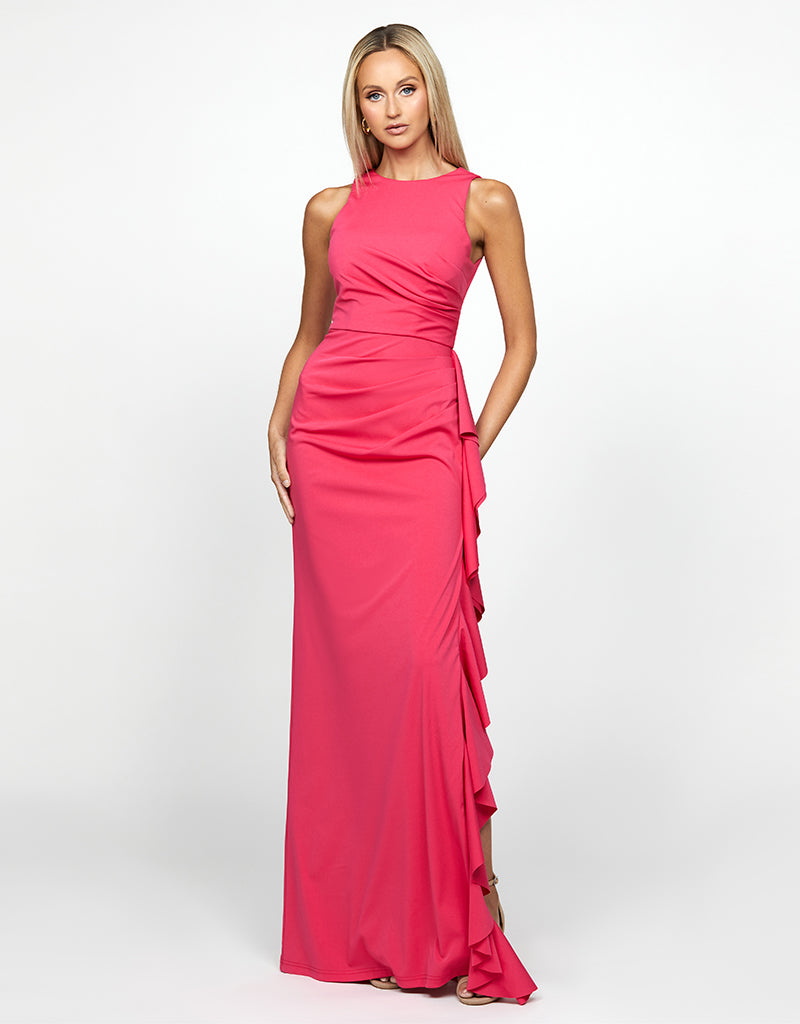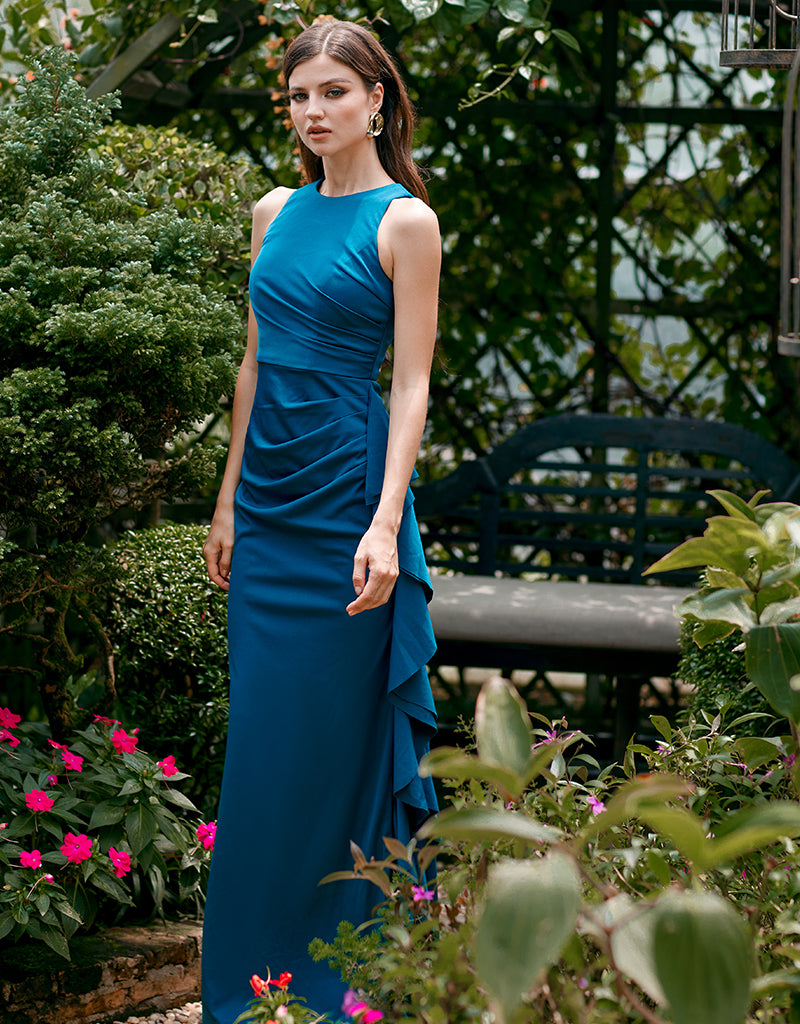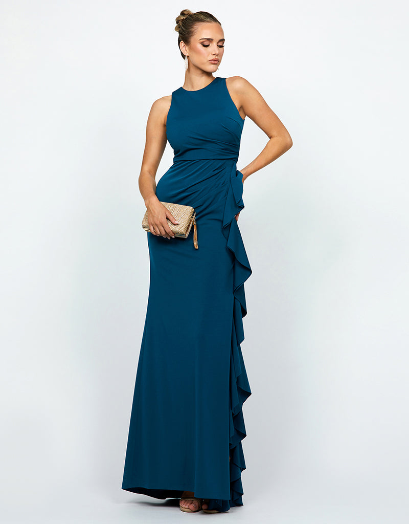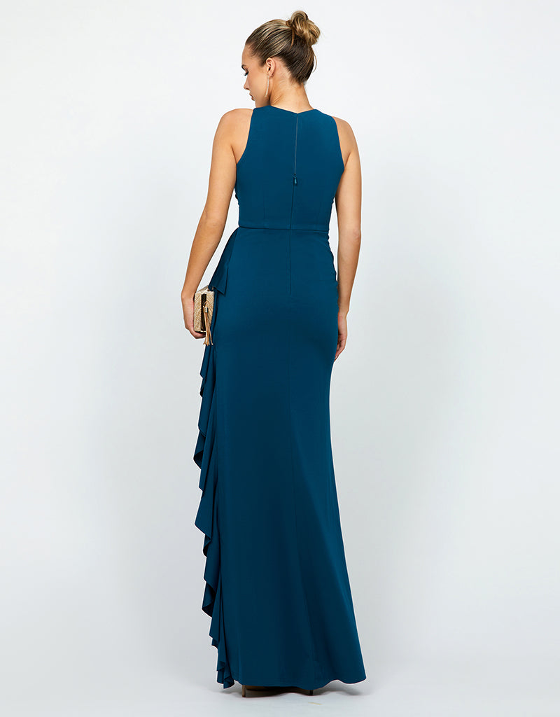 Step into sophistication with our RAELYNN HIGH NECK FRILL GOWN featuring a high halter neckline that exudes modern elegance. Built-in bust cups provide support, while side front pleats at the waist and skirt offer a flattering silhouette. The full-length column skirt includes a side front split for graceful movement, accentuated by a cascading side frill feature that adds a touch of drama. Fully lined for comfort and equipped with an invisible zip closure at the back, this gown ensures a seamless fit and refined finish. Perfect for formal events or special occasions, it combines classic style with contemporary allure for an unforgettable entrance.