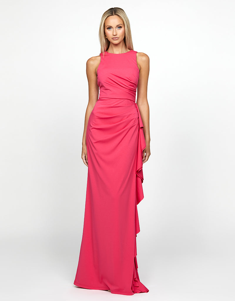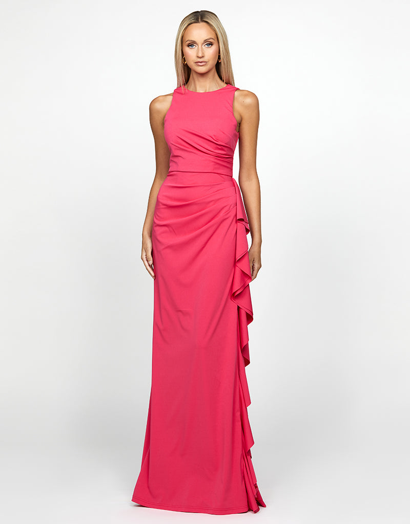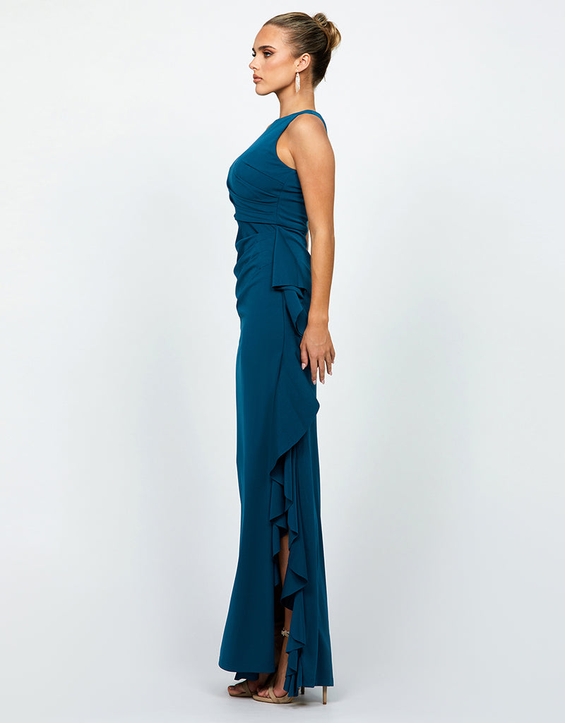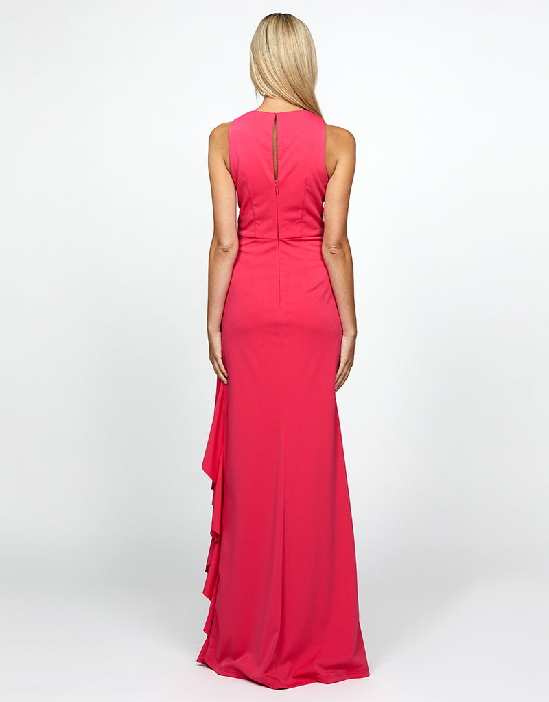 Step into sophistication with our RAELYNN HIGH NECK FRILL GOWN featuring a high halter neckline that exudes modern elegance. Built-in bust cups provide support, while side front pleats at the waist and skirt offer a flattering silhouette. The full-length column skirt includes a side front split for graceful movement, accentuated by a cascading side frill feature that adds a touch of drama. Fully lined for comfort and equipped with an invisible zip closure at the back, this gown ensures a seamless fit and refined finish. Perfect for formal events or special occasions, it combines classic style with contemporary allure for an unforgettable entrance.