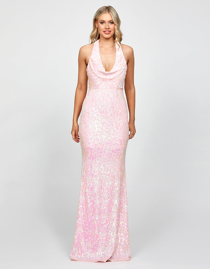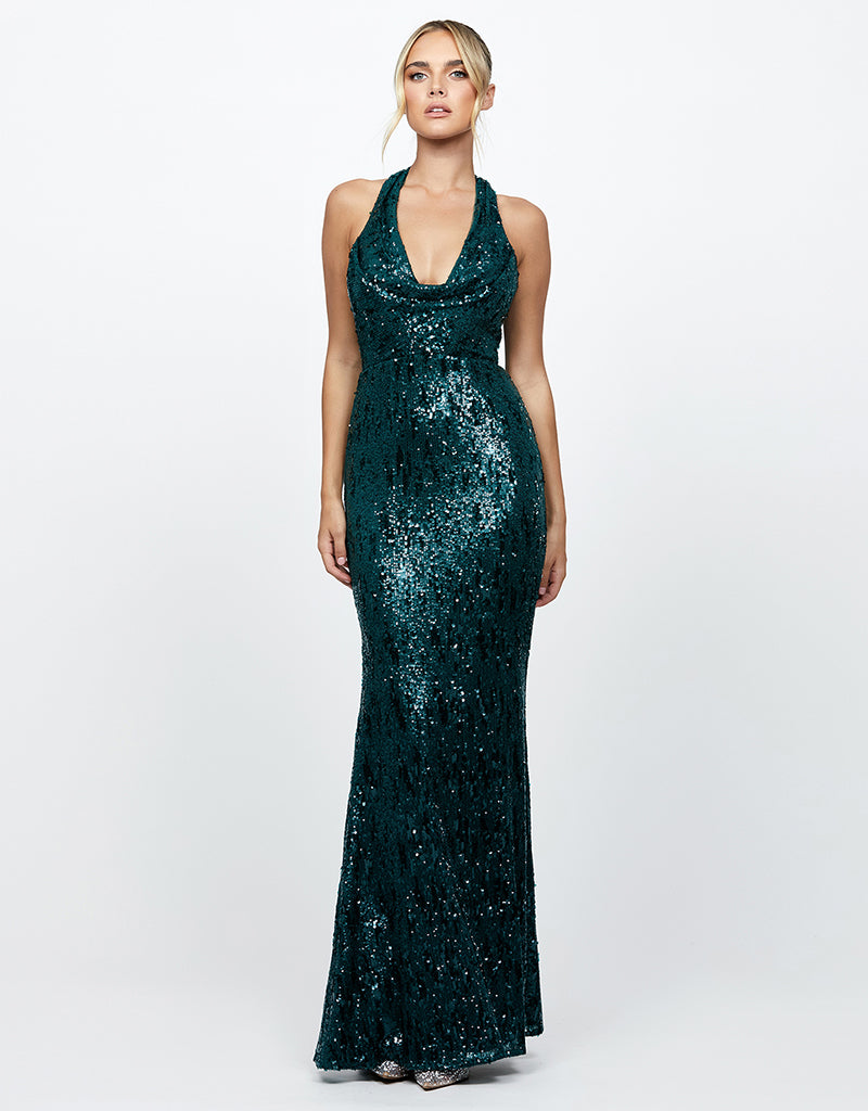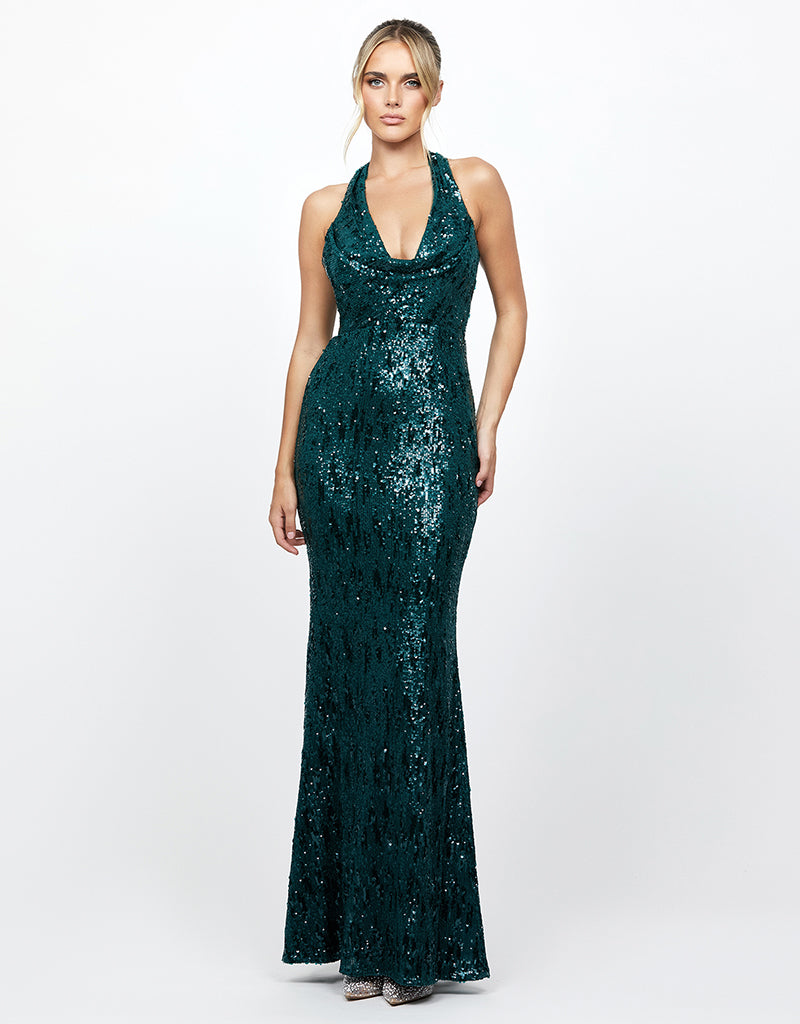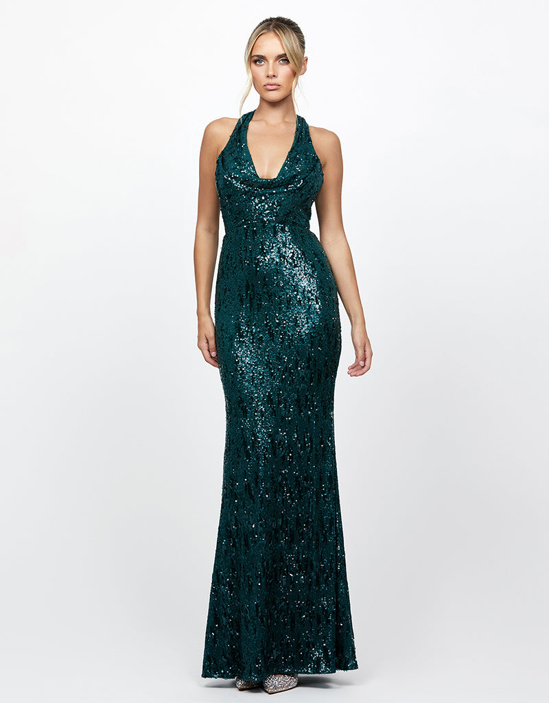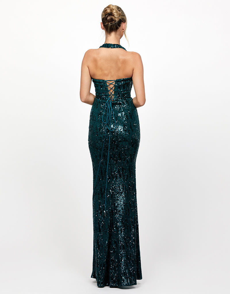 Steal the spotlight in this sequin stunner, designed to dazzle with every step. The plunging halter neckline with a soft cowl detail creates a sultry, flattering drape, while the adjustable lace-up back adds a touch of drama and a custom fit.