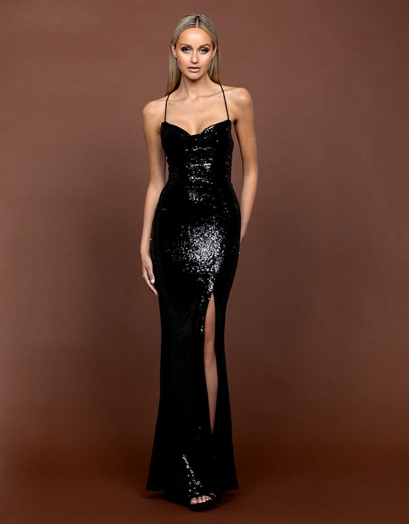 A slim fit bias cut sequin gown, on-trend cowl neckline and a tie-up back for a perfect fit.