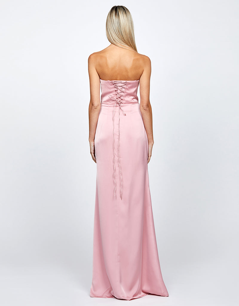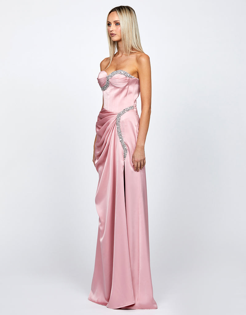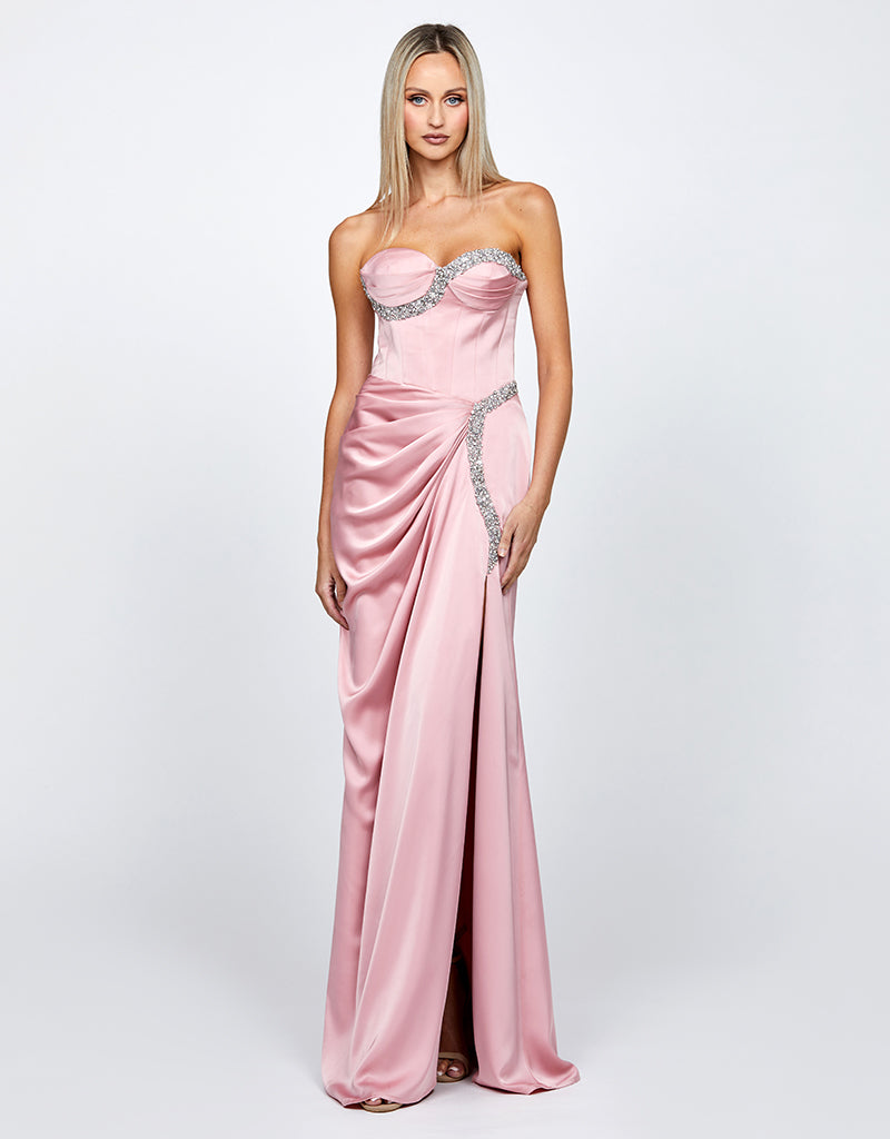 Dazzle in this glamorous strapless gown, designed to captivate at any special event. The sweetheart neckline, embellished for a touch of sparkle, features built-in cups for added support. The asymmetrical dropped waist with panel detailing and hidden boning sculpts a stunning silhouette, while the full-length fishtail skirt with side pleats and a high split adds drama and movement. A striking diamante appliqué flows from the waist to the split, adding extra elegance. The lace-up back and invisible zip closure ensure a perfect fit, and the dress is fully lined for comfort. Crafted from luxurious satin, this gown is a breath-taking choice for any formal occasion.