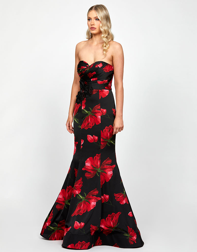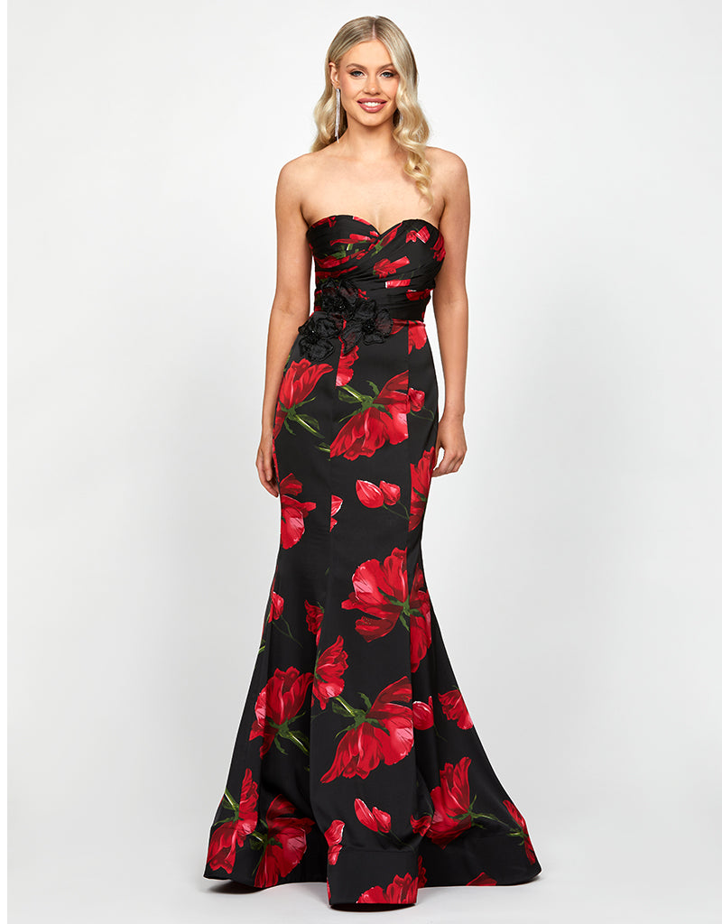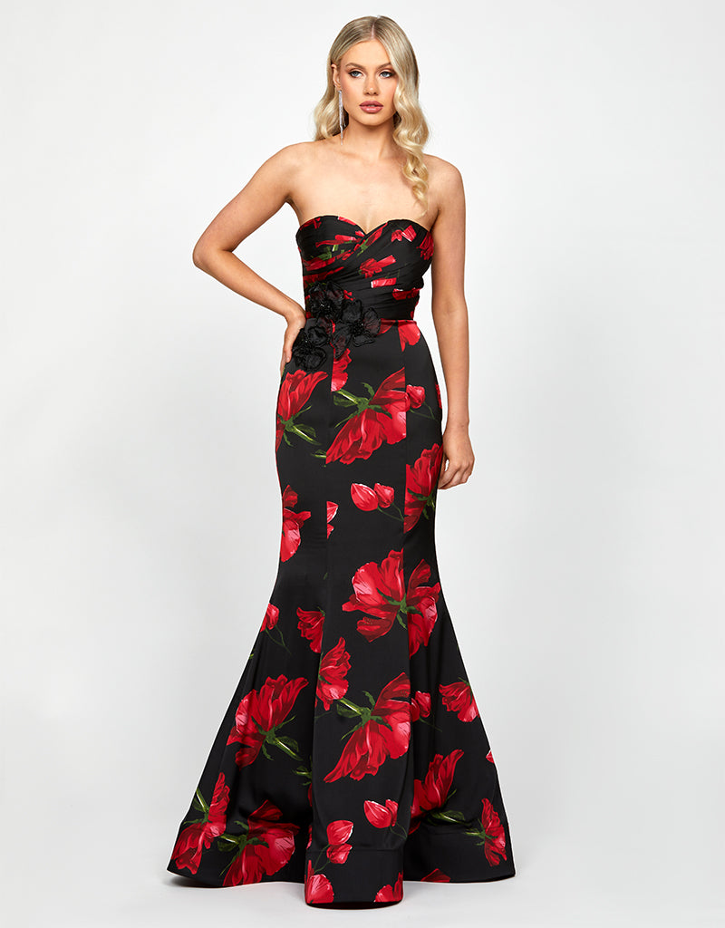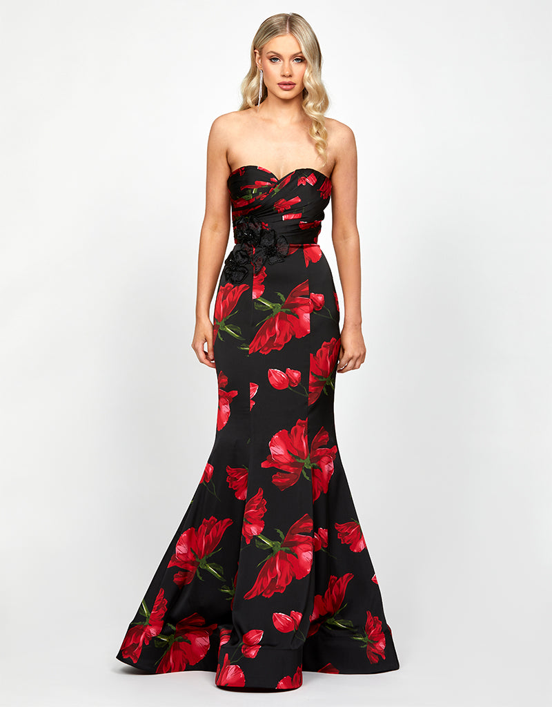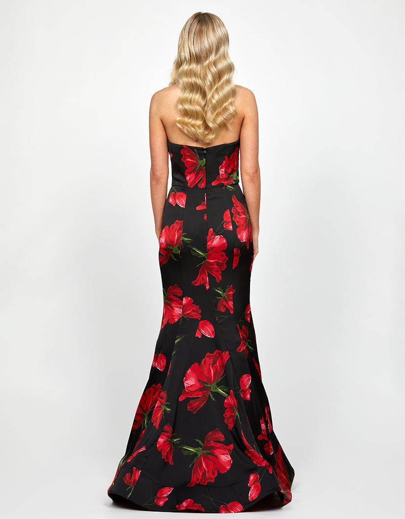 The full-length fishtail skirt fits snugly through the hips before dramatically flaring out into a structured hemline, creating a sleek and sculpted look. The luxurious printed satin fabric catches the light beautifully, offering a rich, lustrous finish that’s perfect for black-tie events, galas, or formal evenings. An invisible back zip closure ensures a smooth and seamless fit, while the full lining adds comfort and structure.