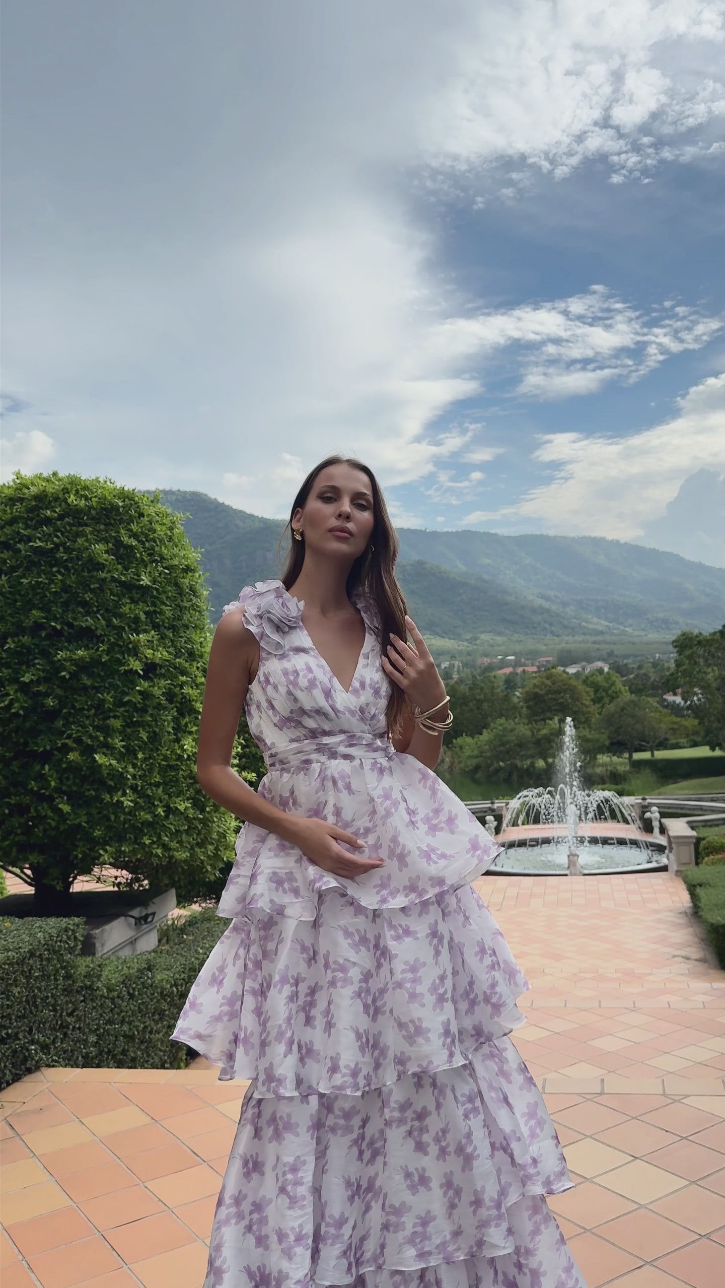 Romantic and effortlessly enchanting, the Violeta Gown is a celebration of soft silhouettes and feminine detail. Designed with a crossover V neckline and gathered bust, the structured bodice features built-in bust cups, a front hook-and-eye closure, and a flattering gathered waistband. Ruffled shoulders and a tie-up back add whimsical charm, while the full-length tiered A-line skirt flows in cascading layers of sheer chiffon. Finished with an invisible back zip and full lining, Violeta is your go-to for dreamy moments and unforgettable entrances.