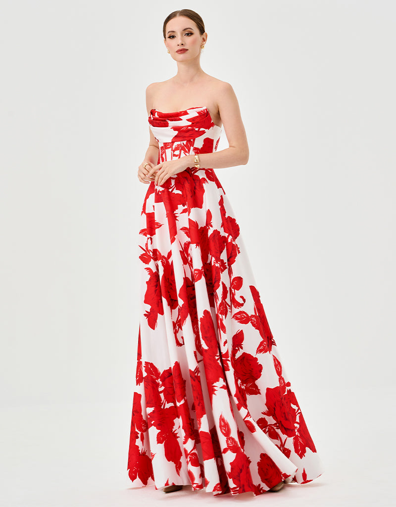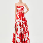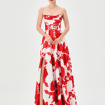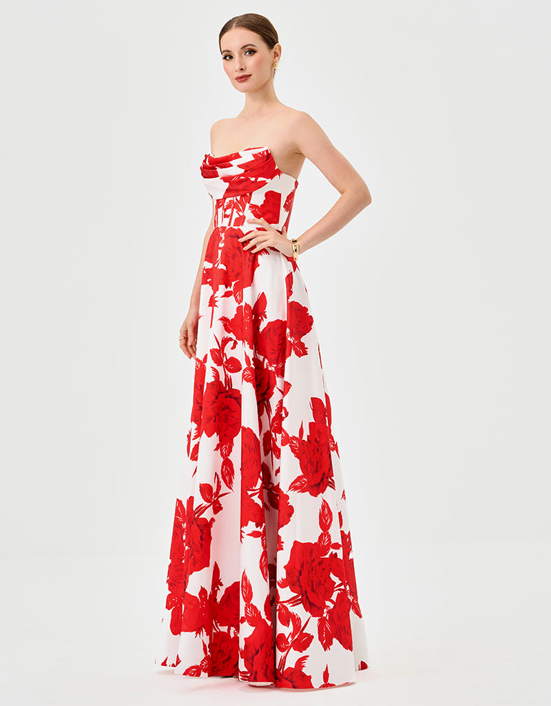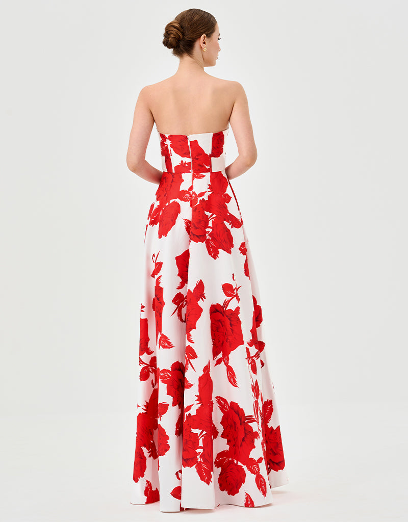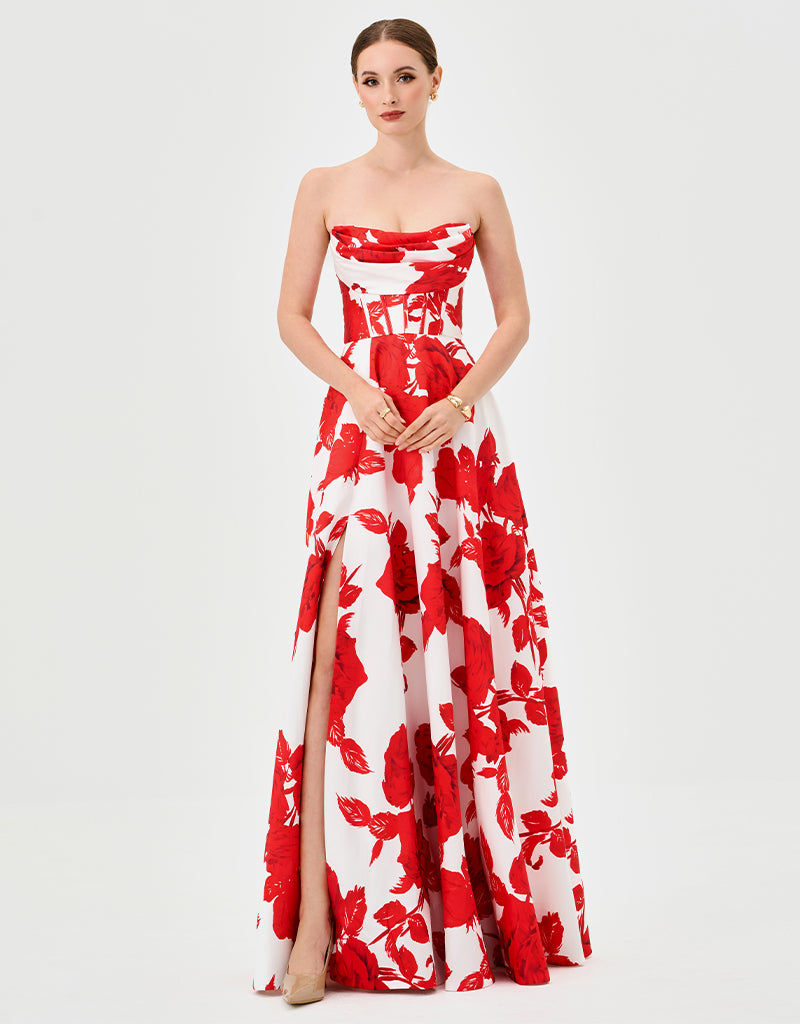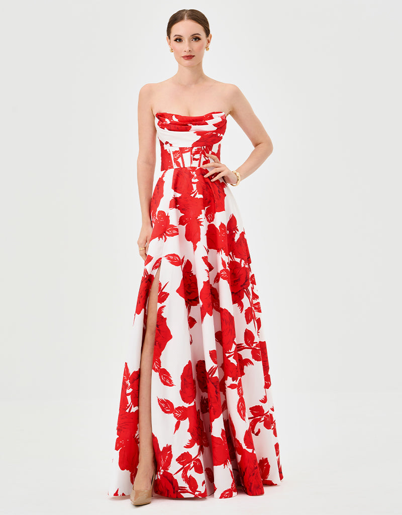 The Virginia Corset Strapless Gown is cut in printed duchess satin with a strapless scoop neckline and softly draped bust. A corseted bodice with exposed boning and built-in cups defines the waist, flowing to a full-length ball skirt with a front side split. Fully lined and finished with an invisible back zip.