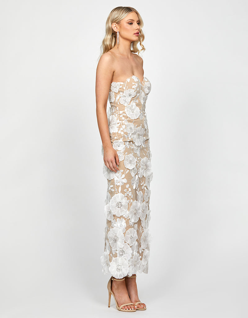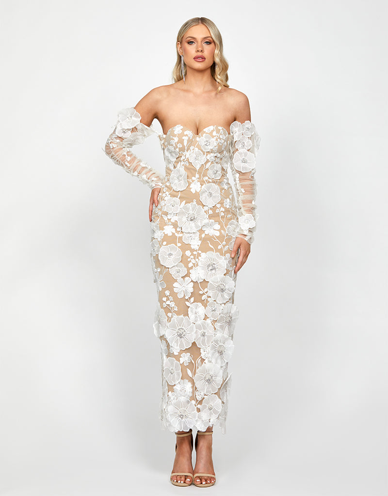 Romantic and effortlessly chic, this 3D floral mesh dress is the perfect blend of elegance and modern charm. Featuring a flattering sweetheart strapless neckline with built-in cups for support, it offers a timeless silhouette with a touch of allure. The detachable sheer full sleeves add versatility, allowing you to switch between a sophisticated or off-the-shoulder look. Designed with a midaxi-length column skirt and a subtle back split, this dress ensures both comfort and graceful movement. Fully lined and finished with an invisible back zip closure, it’s a dreamy choice for any special occasion.