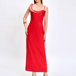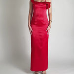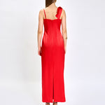 Make a romantic statement in this stunning satin maxi dress, designed with an eye-catching asymmetric neckline featuring a dramatic wide ruffle strap and a delicate spaghetti strap. The fitted bodice is beautifully detailed with a soft fabric rosette, adding a feminine and elegant touch. The sleek pencil skirt falls gracefully to the floor, finished with a back split for ease of movement and a hint of allure. Fully lined and secured with an invisible back zip, this dress is the perfect choice for weddings, formal events, or any occasion where you want to feel unforgettable.