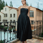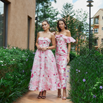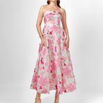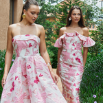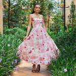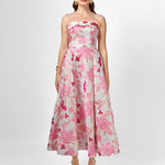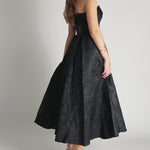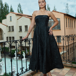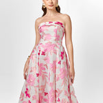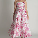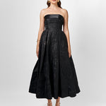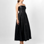 Turn heads in this elegant strapless gown, featuring a classic straight-across neckline and a beautifully structured boned bodice with built-in bust cups for all-day support. The A-line tea-length skirt is designed with sophisticated inverted tucks, adding just the right amount of volume and movement. Fully lined for a smooth fit, the gown is finished with a centre back zip for ease of wear. Crafted from luxurious jacquard fabric, this piece offers timeless texture and refined charm—perfect for your next special occasion.