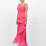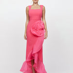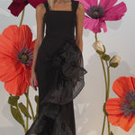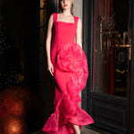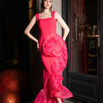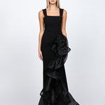 Step into elegance with this stunning square-neck gown, adorned with thick straps for a bold, structured look. The fitted fishtail skirt, with its curved hemline, creates a sleek and dramatic silhouette. A circular frill feature at the hip cascades down the front split, adding a touch of dynamic flair. An invisible back zip closure provides a smooth, seamless finish, while the full lining offers comfort and structure. Ideal for formal events or special occasions, this dress combines sophisticated design with modern elegance.