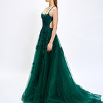 Designed with a scoop neckline and delicate embellished straps, this gown turns to reveal a low open back for added allure. The fitted bodice is detailed with floral embroidery, boning, and bust cups for structure. A full A-line skirt in layered tulle is scattered with lace appliqué and finished with a thigh-high split for movement. Fully lined and secured with an invisible zip closure at the back.